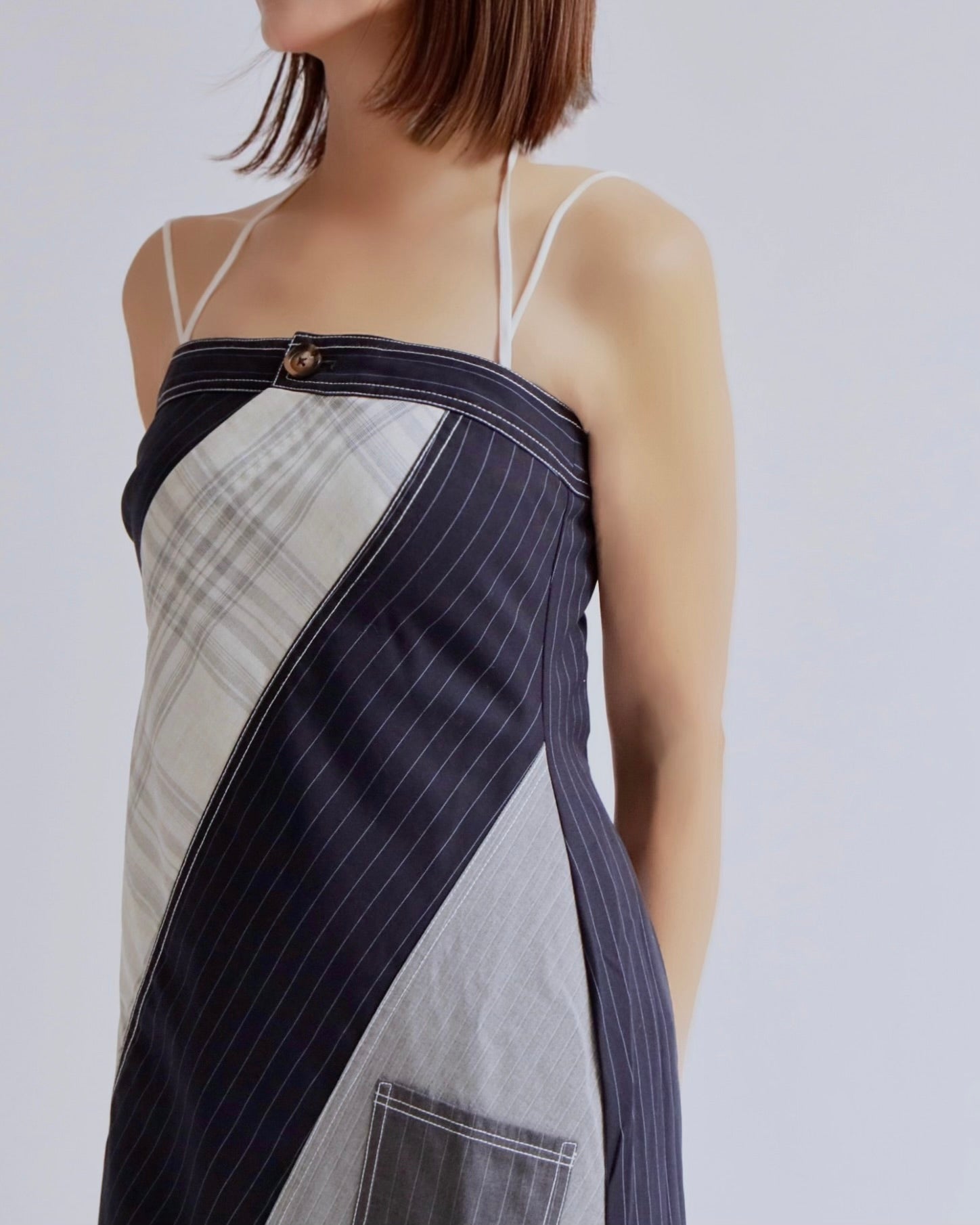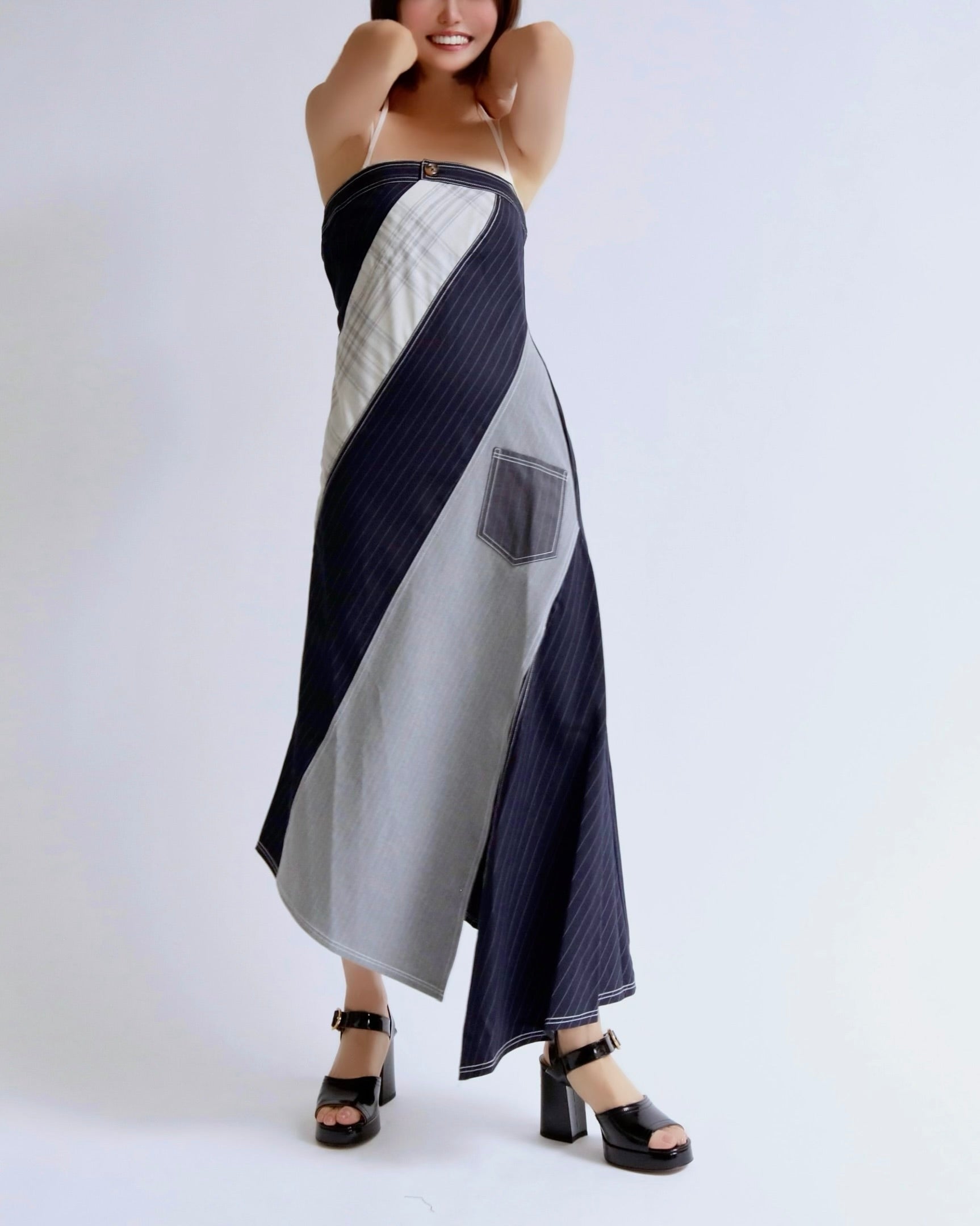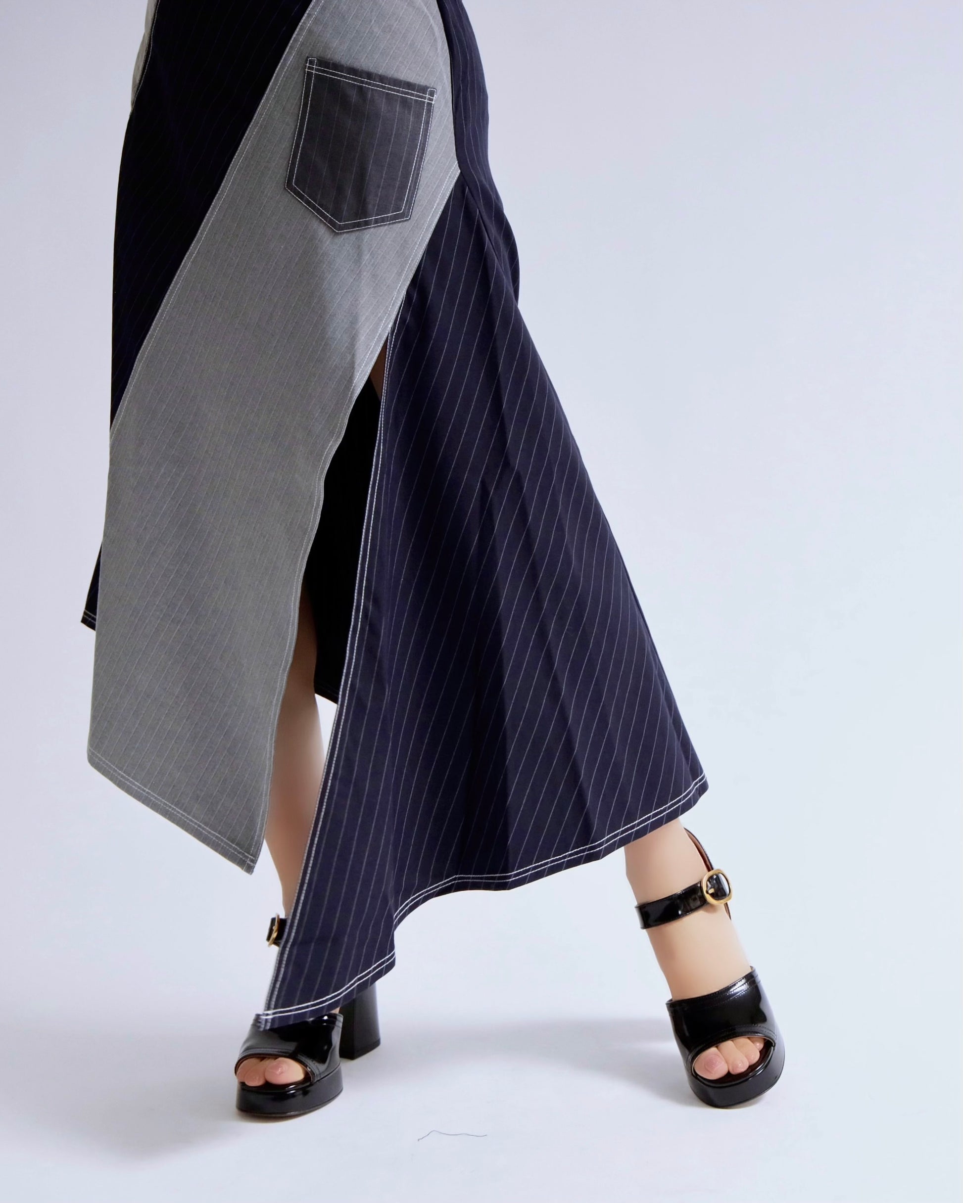 異なるストライプ素材を大胆に切り替えた、アートピースのような一着。斜めに走るパネルラインが身体のラインを美しく見せてくれるので、