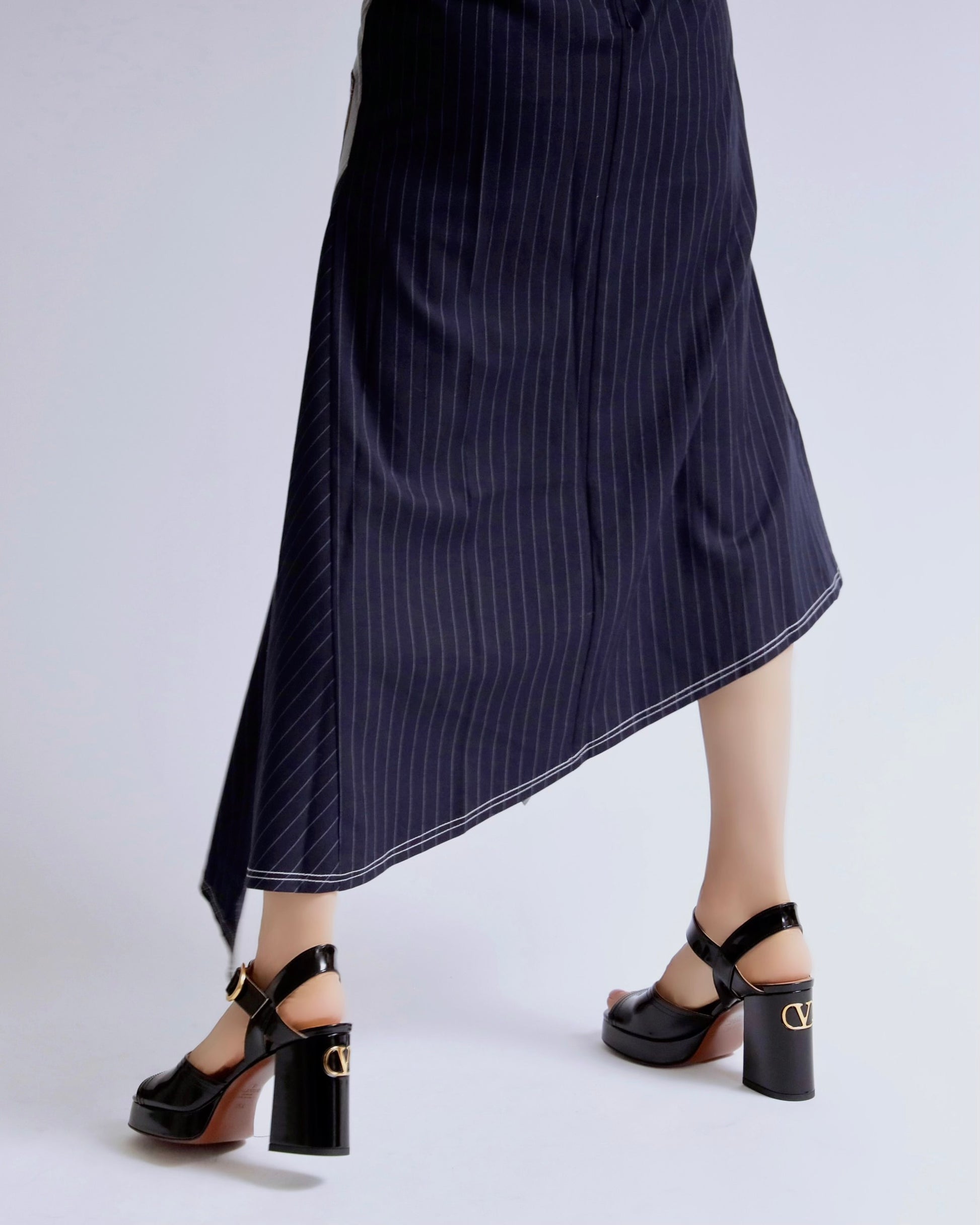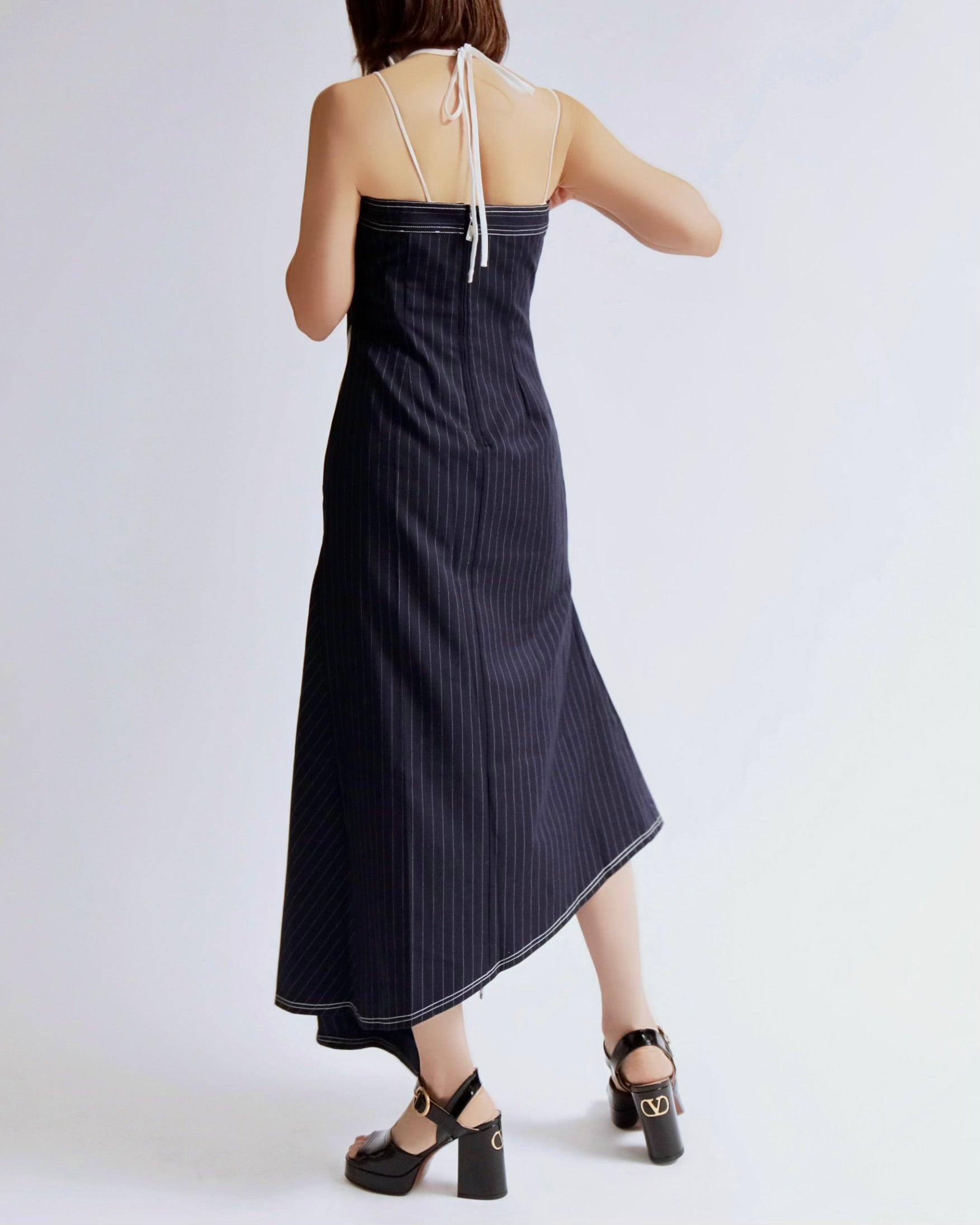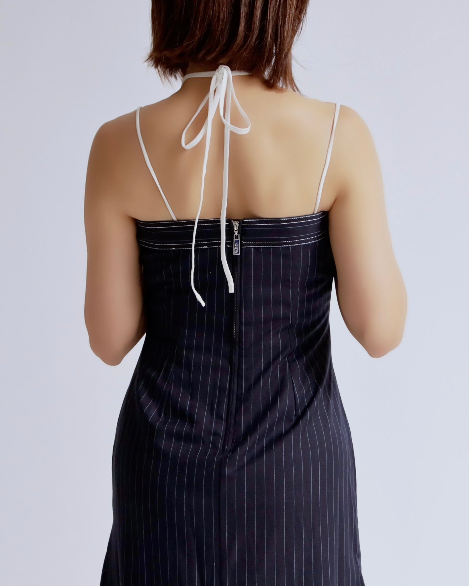 異なるストライプ素材を大胆に切り替えた、アートピースのような一着。斜めに走るパネルラインが身体のラインを美しく見せてくれるので、