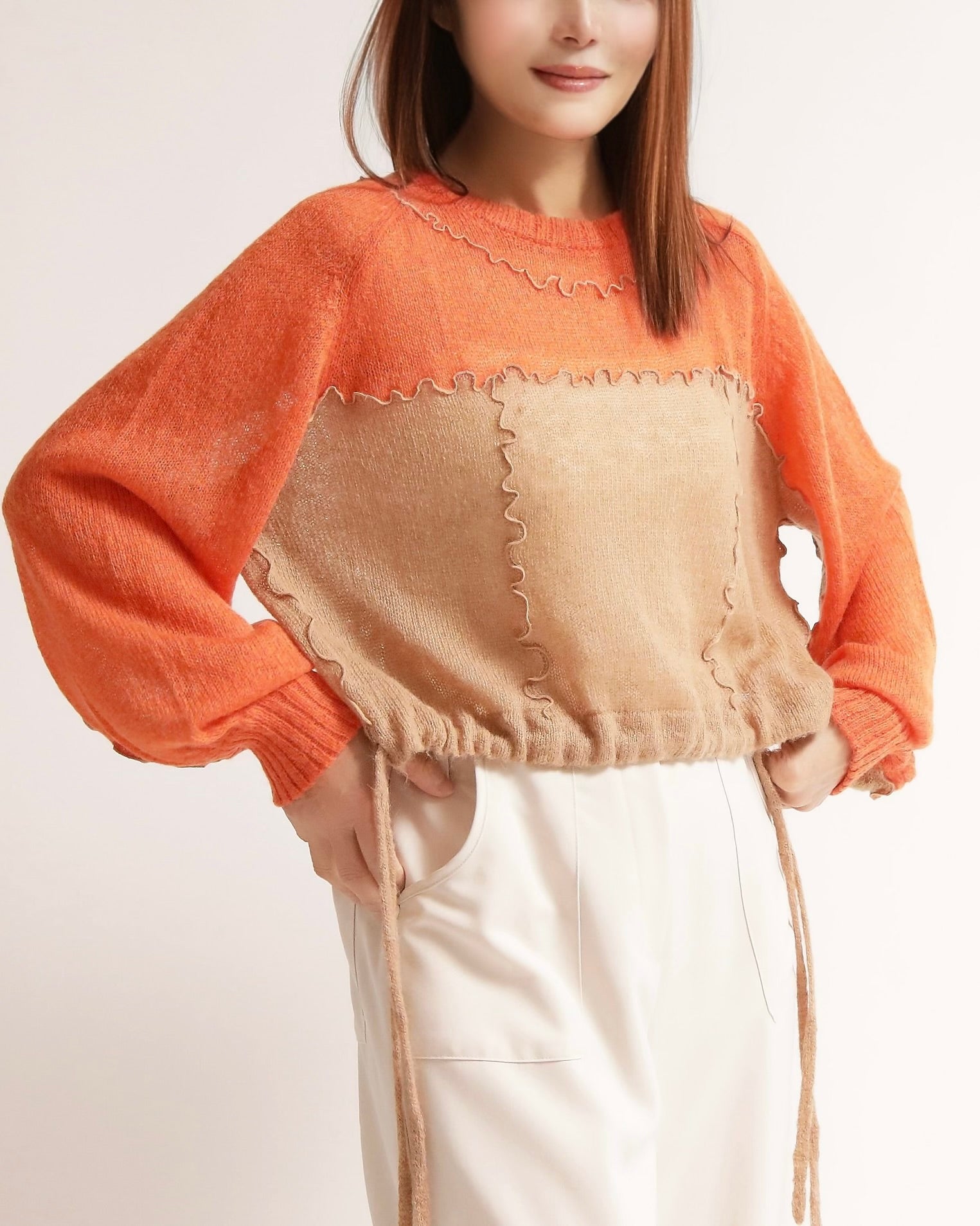 軽やかなシアーニットとふんわりタッチの異素材を組み合わせた、温度感のある配色デザインが目を惹くメロウトップス。