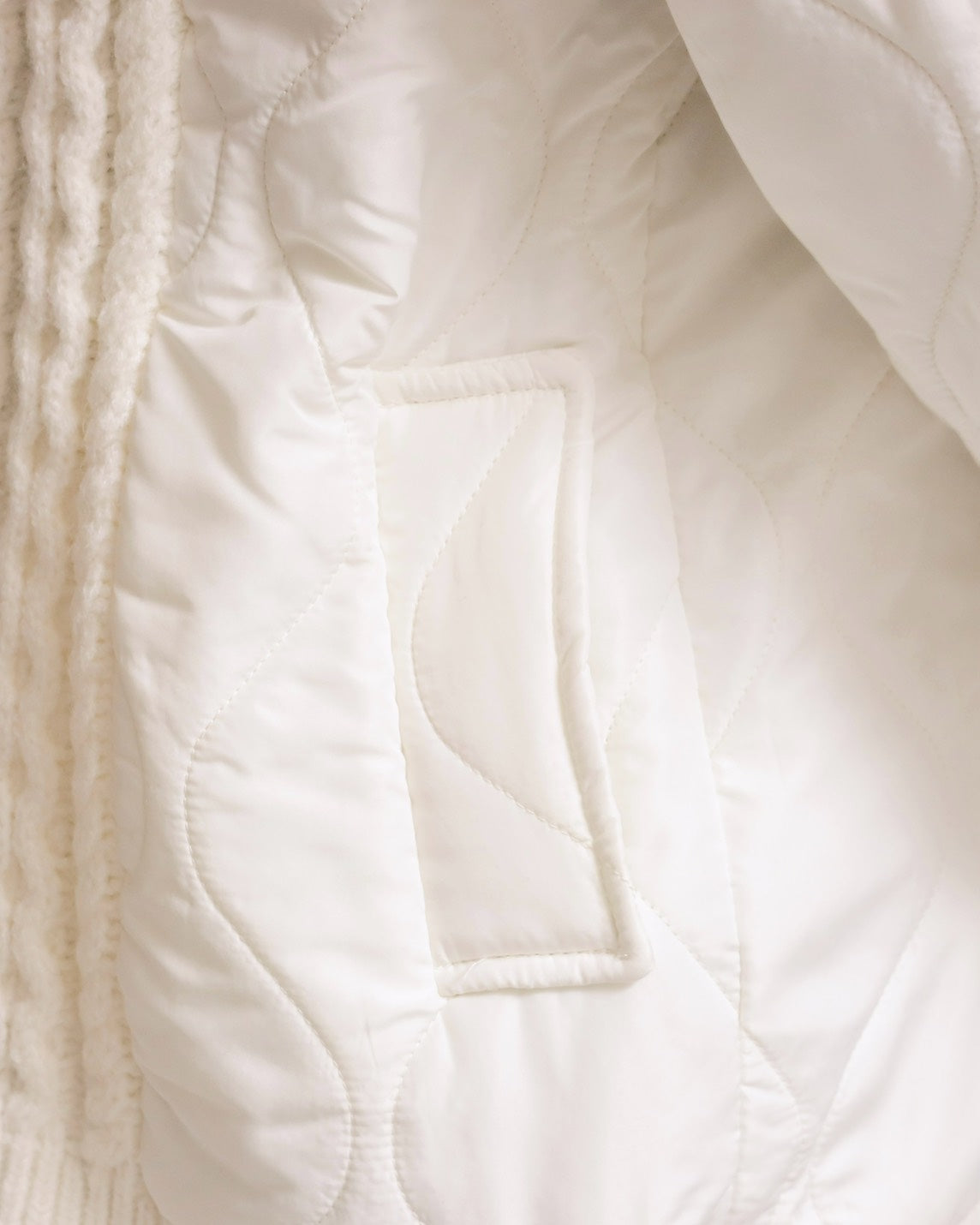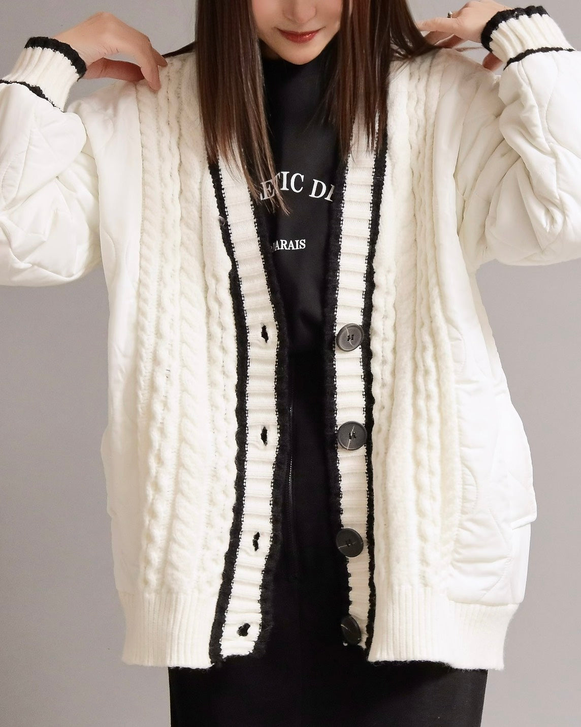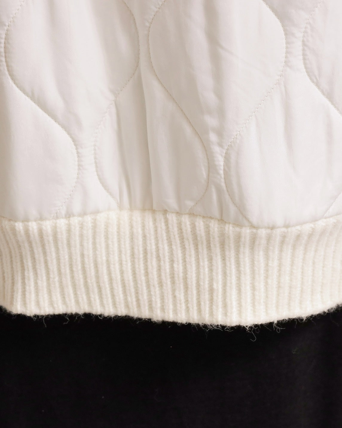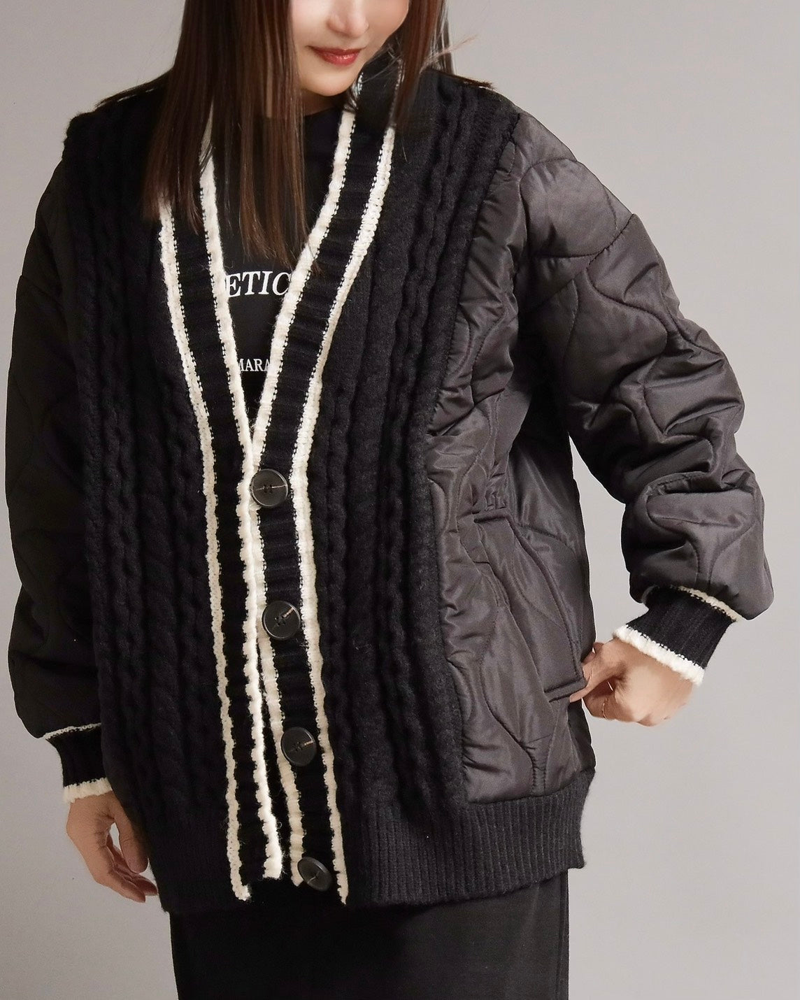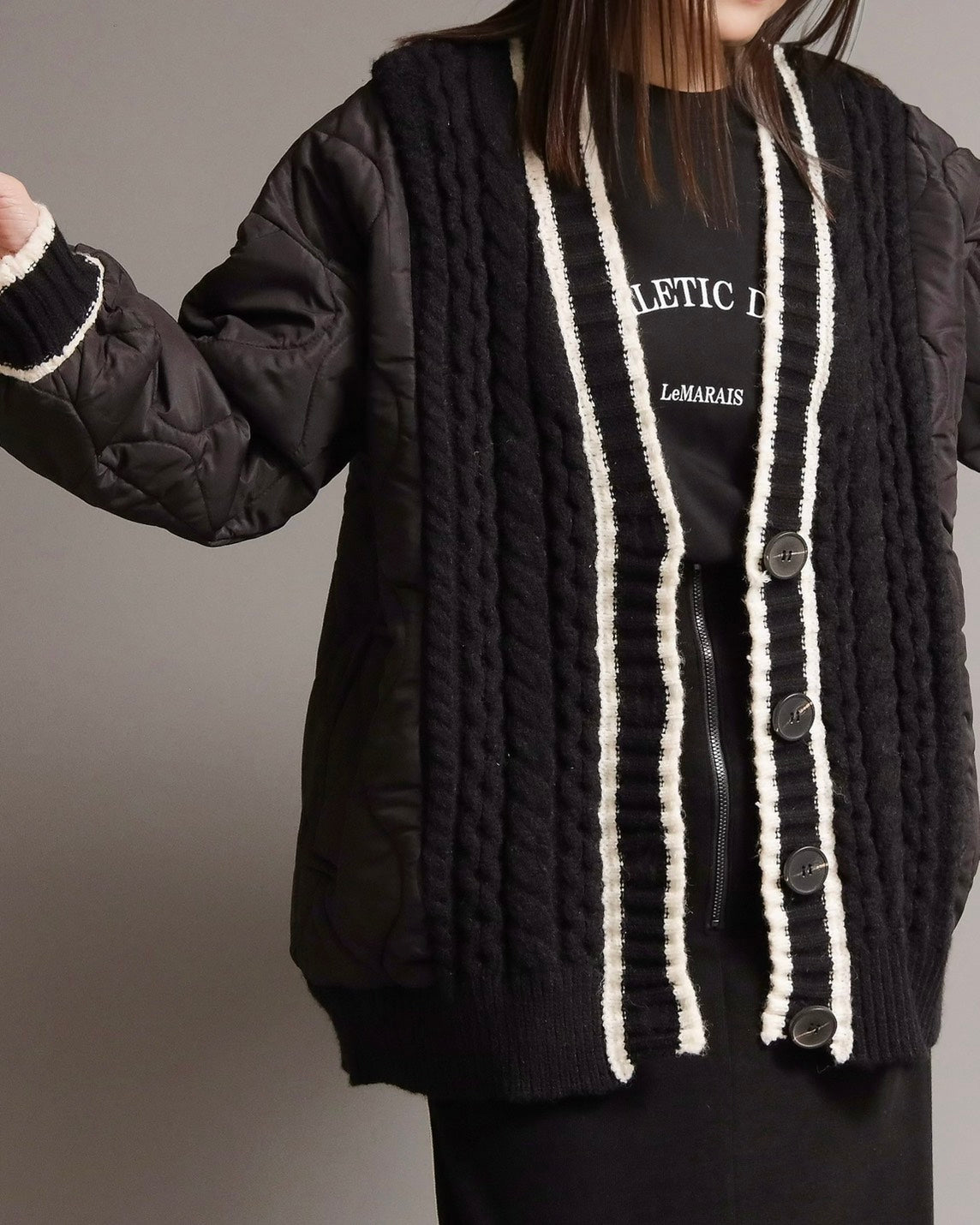 フロントには立体感のあるケーブル編み、その他の身頃はキルティング素材を使用し、暖かさと軽さを両立させた1枚です。