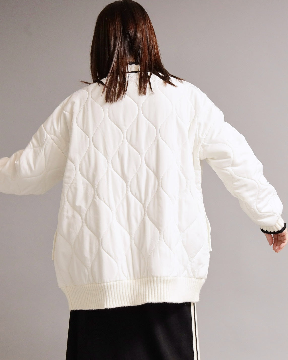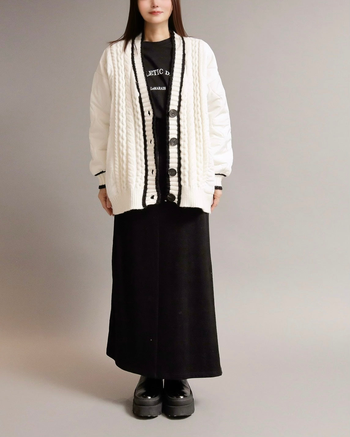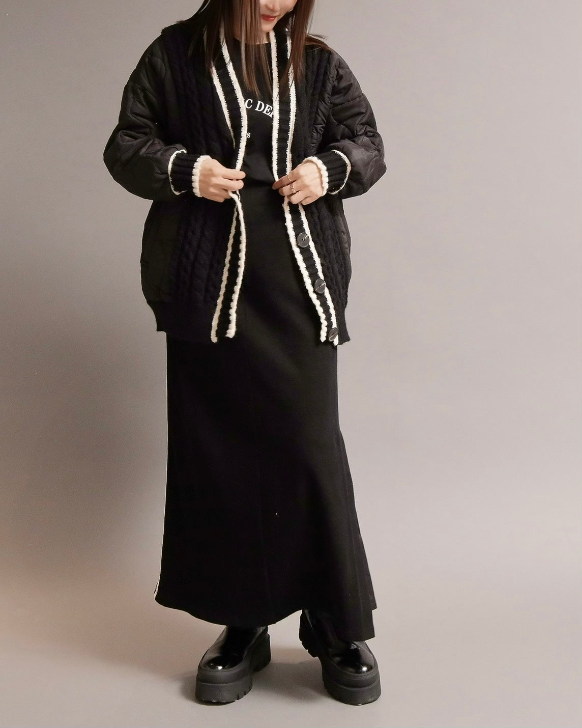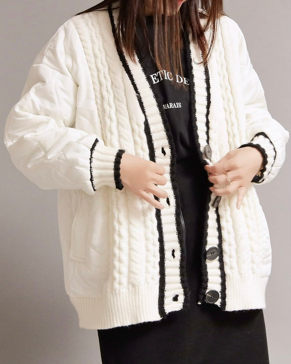 フロントには立体感のあるケーブル編み、その他の身頃はキルティング素材を使用し、暖かさと軽さを両立させた1枚です。