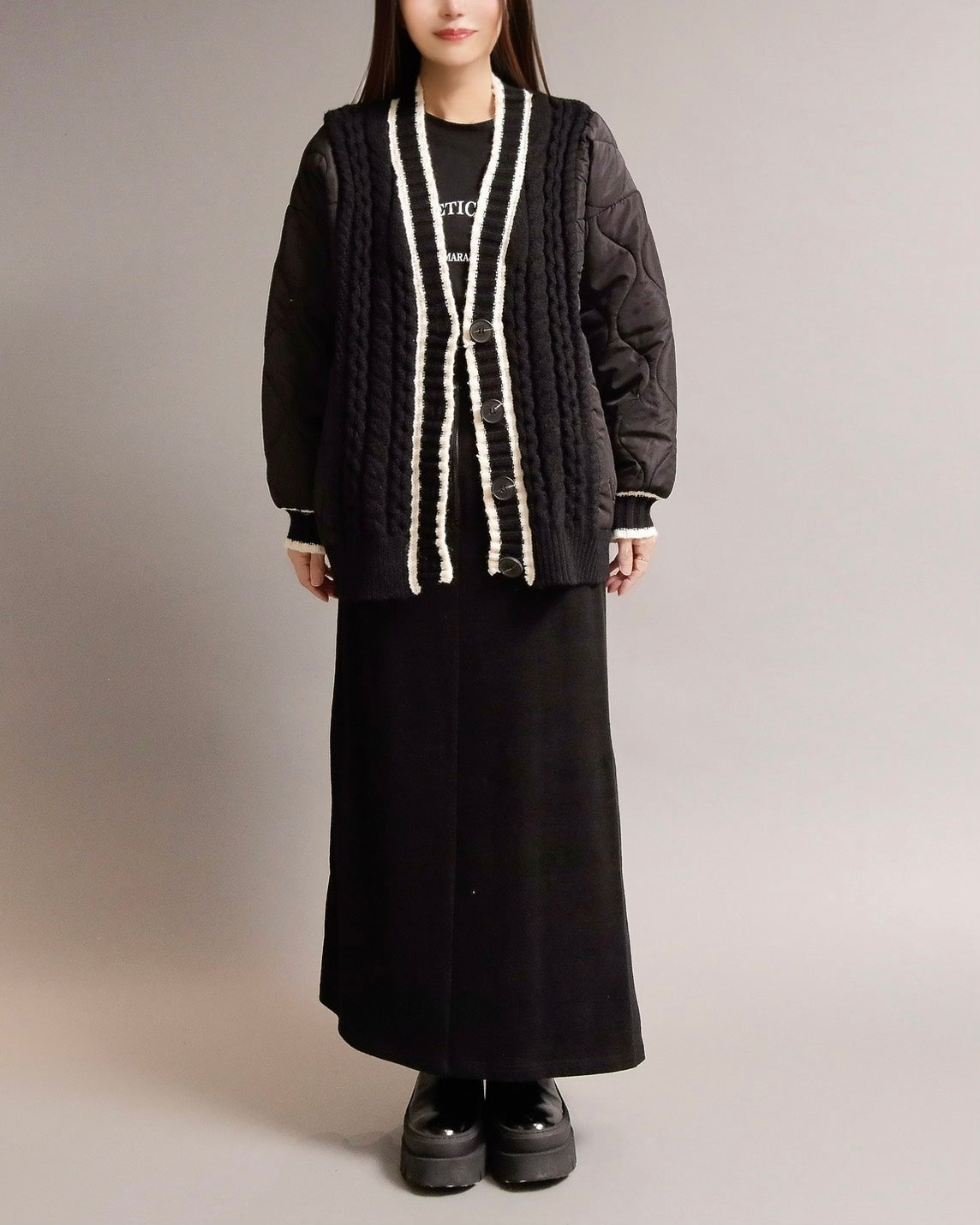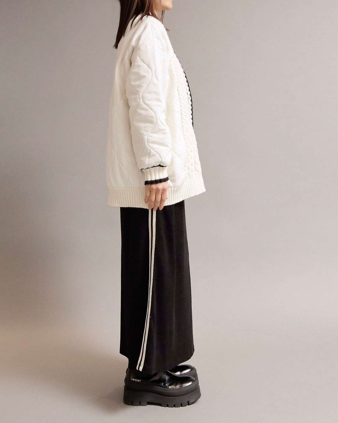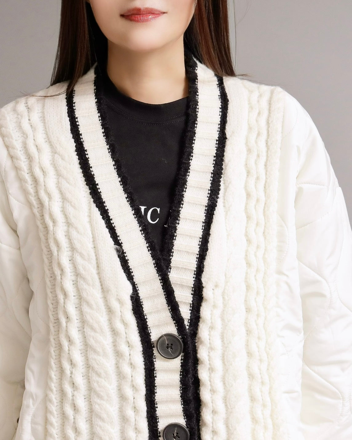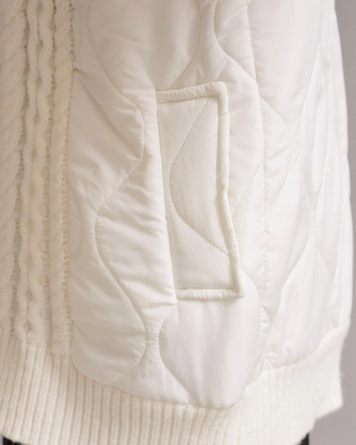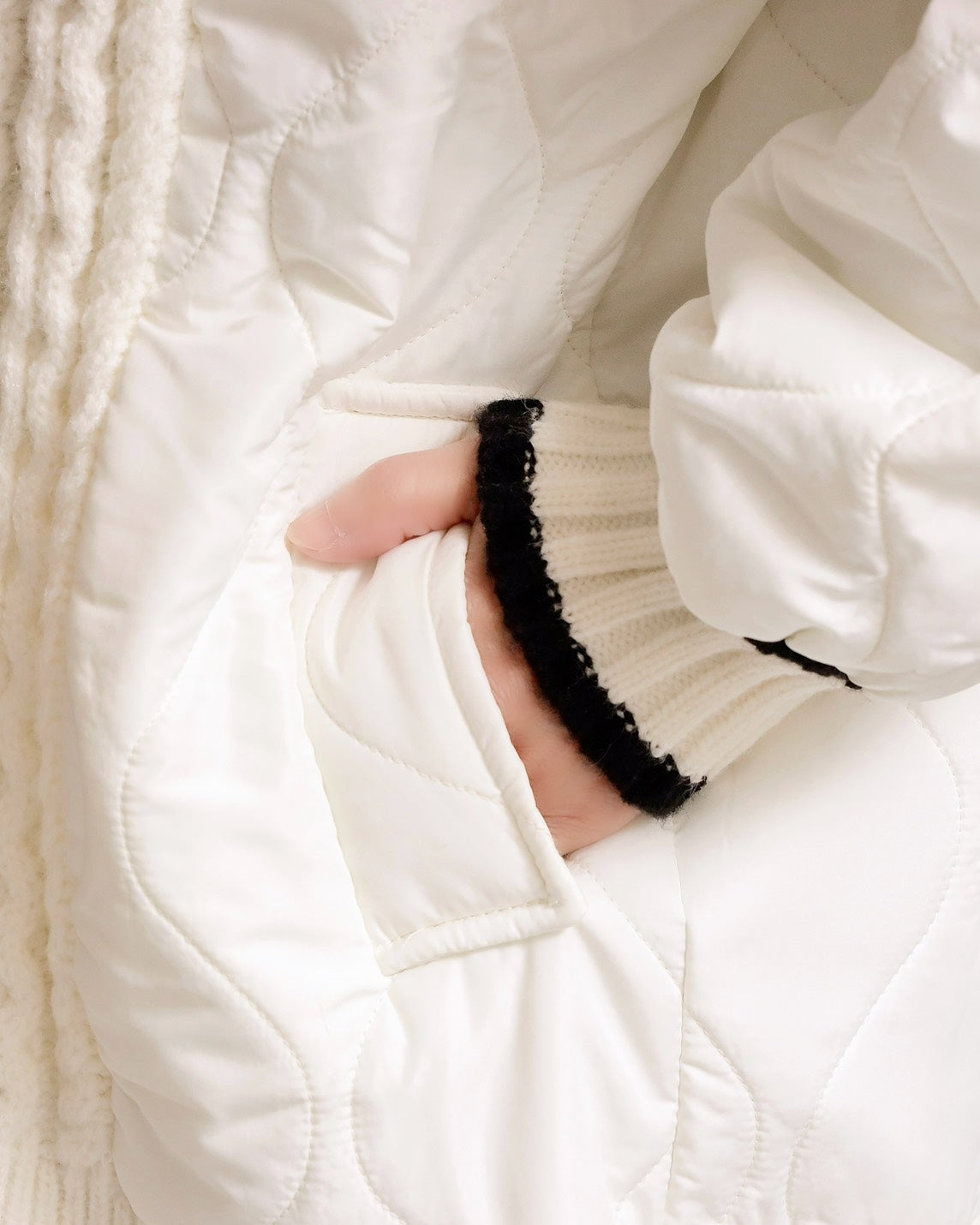 フロントには立体感のあるケーブル編み、その他の身頃はキルティング素材を使用し、暖かさと軽さを両立させた1枚です。
