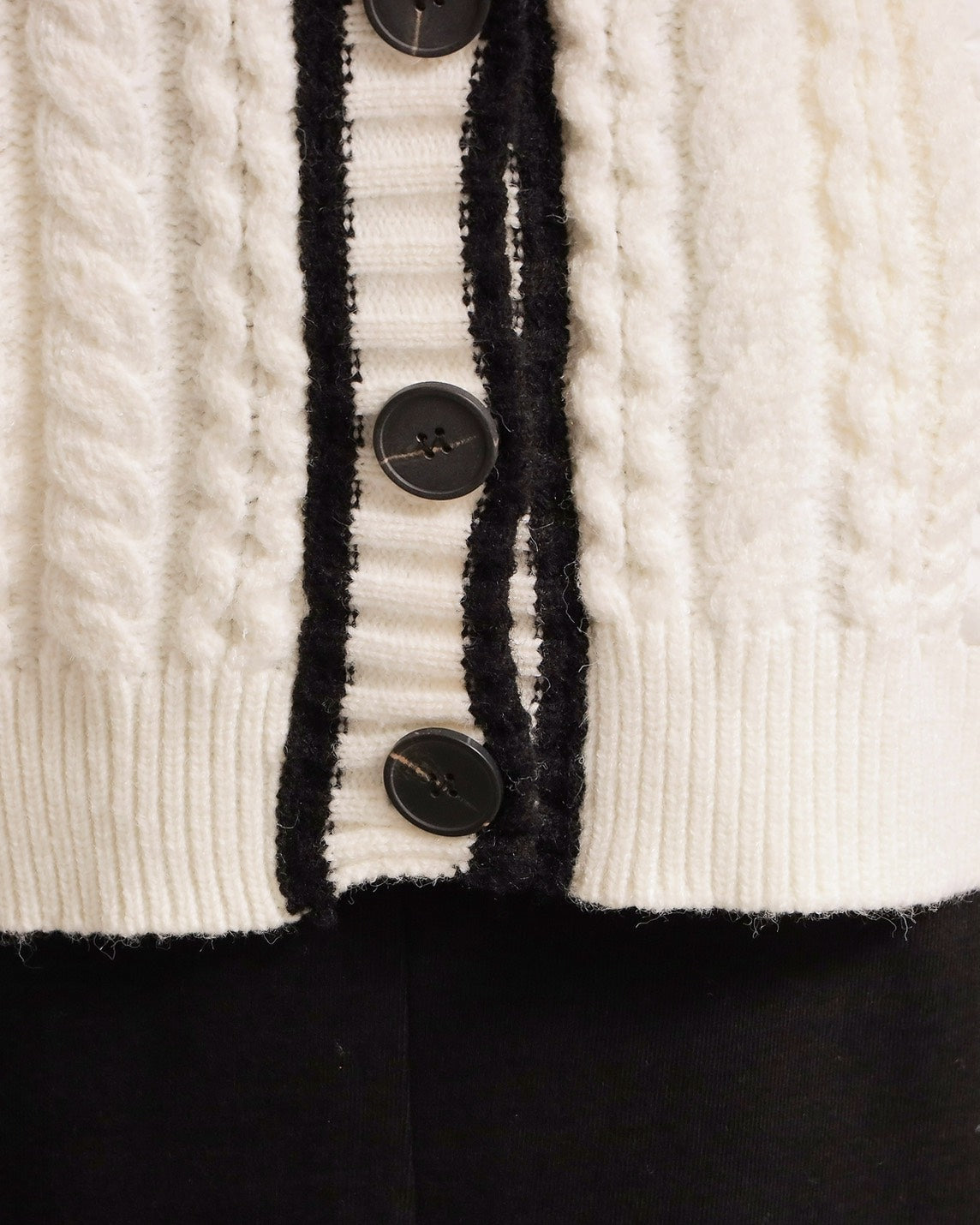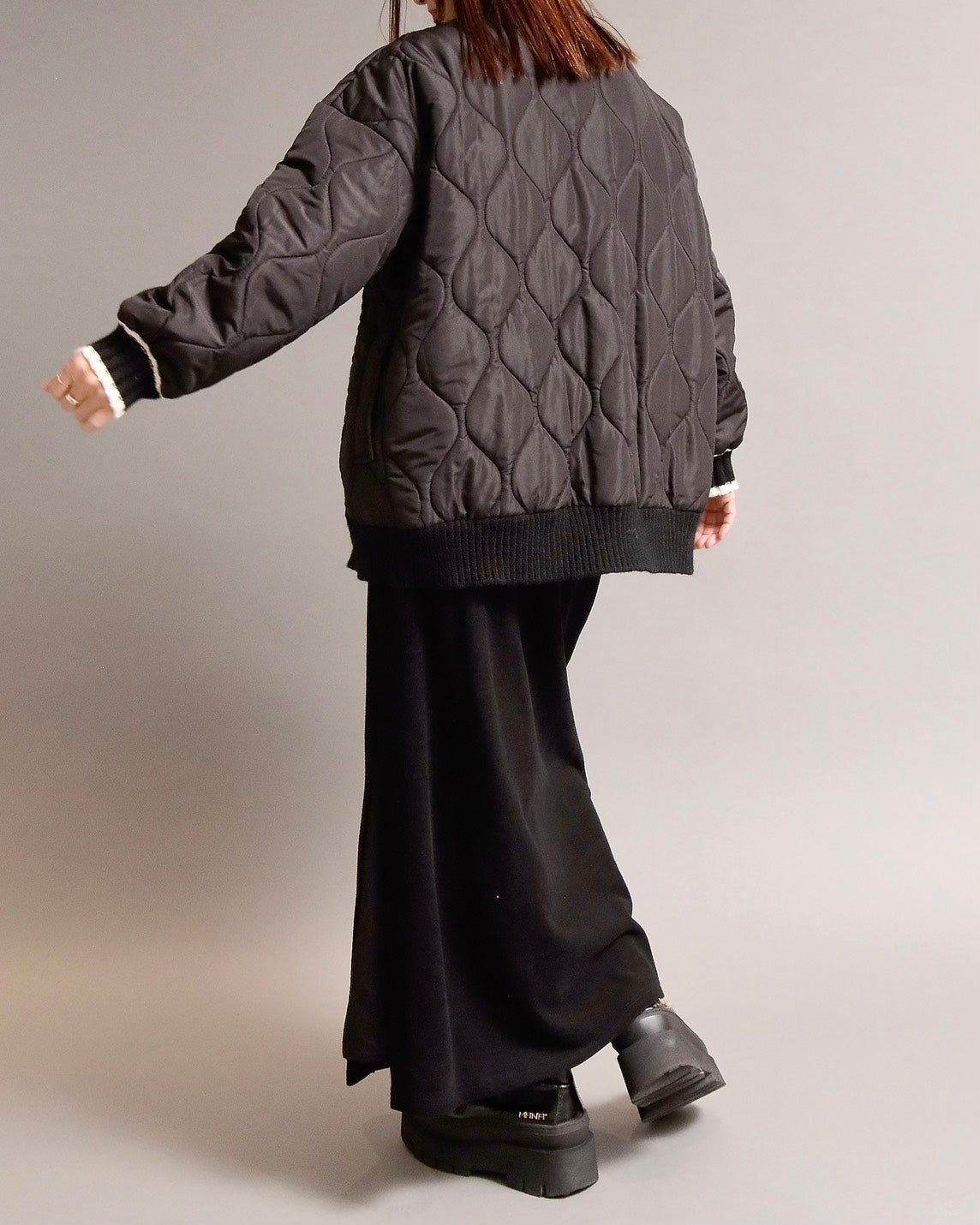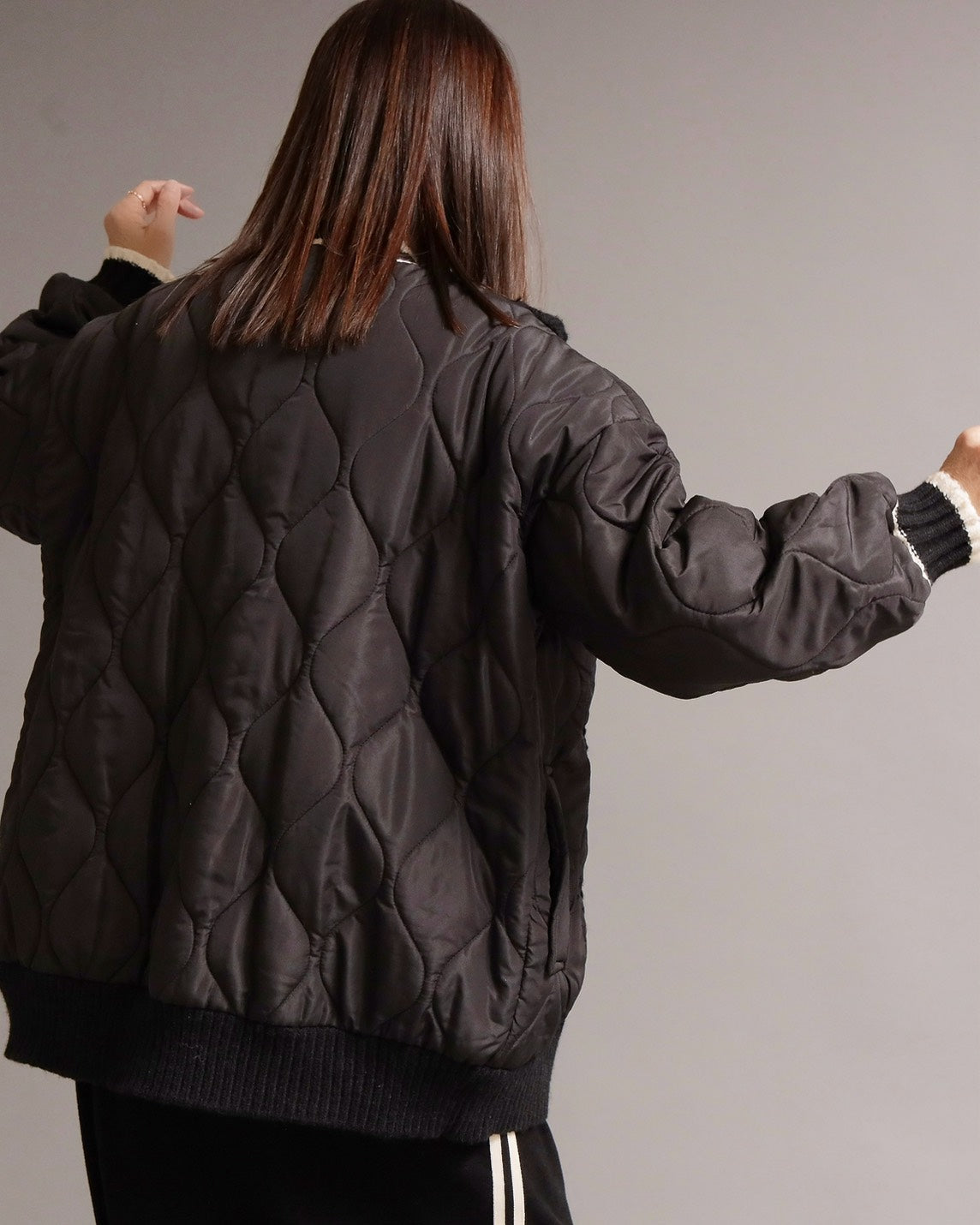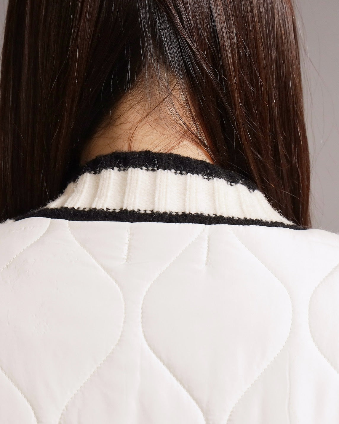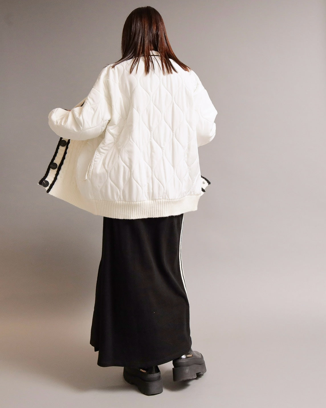 フロントには立体感のあるケーブル編み、その他の身頃はキルティング素材を使用し、暖かさと軽さを両立させた1枚です。
