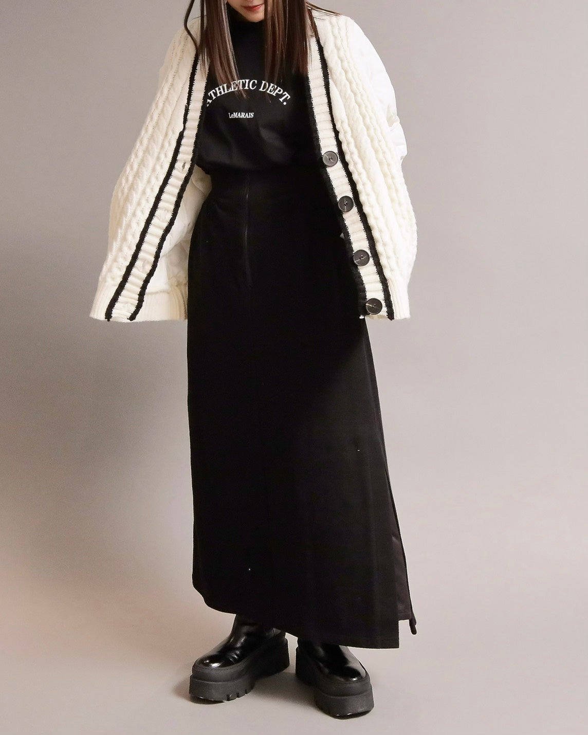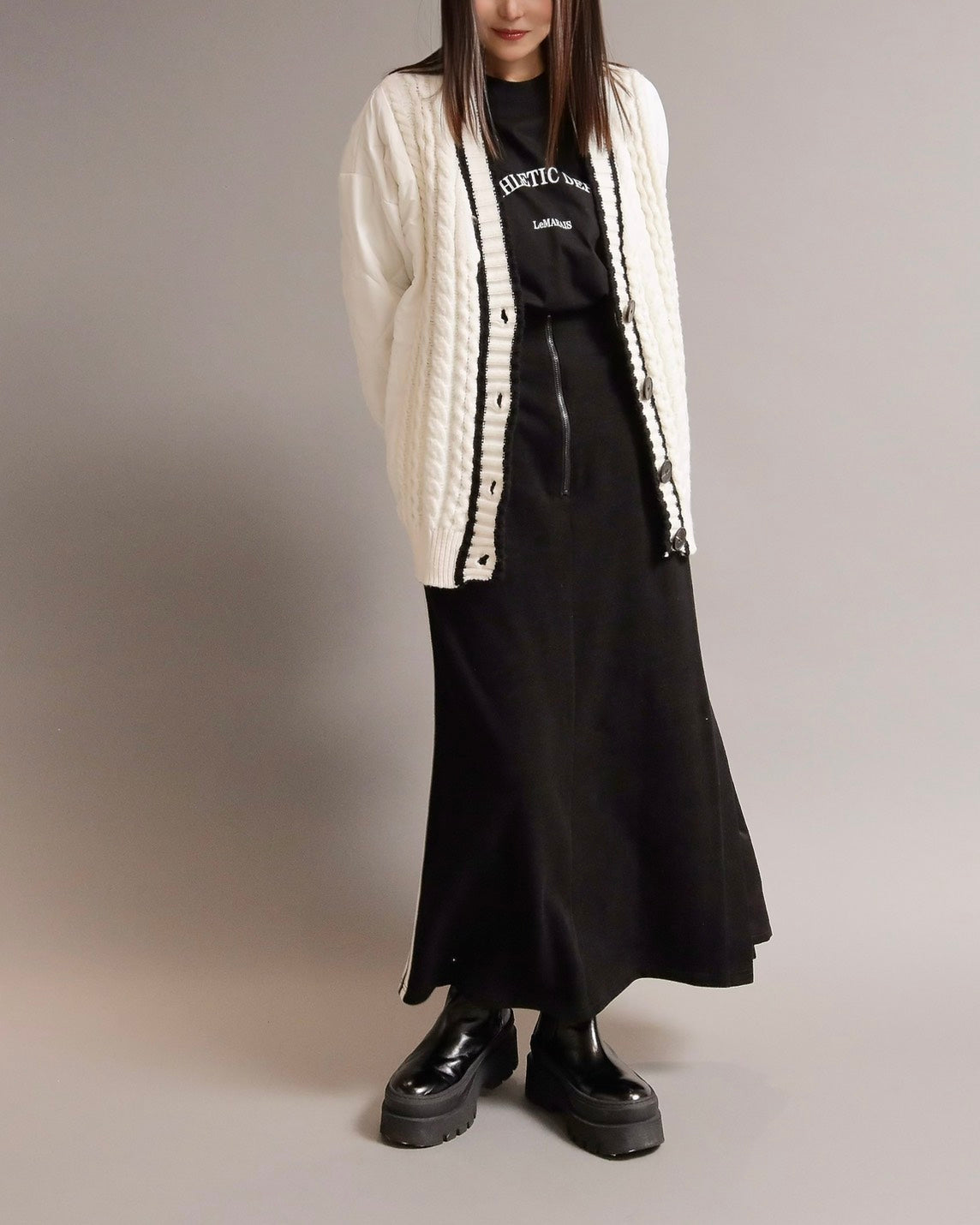 ゆったりしたシルエットながら、落ち感のある素材使いで着ぶくれしにくく、カーディガンの軽さとアウターの防寒性を兼ね備えています。