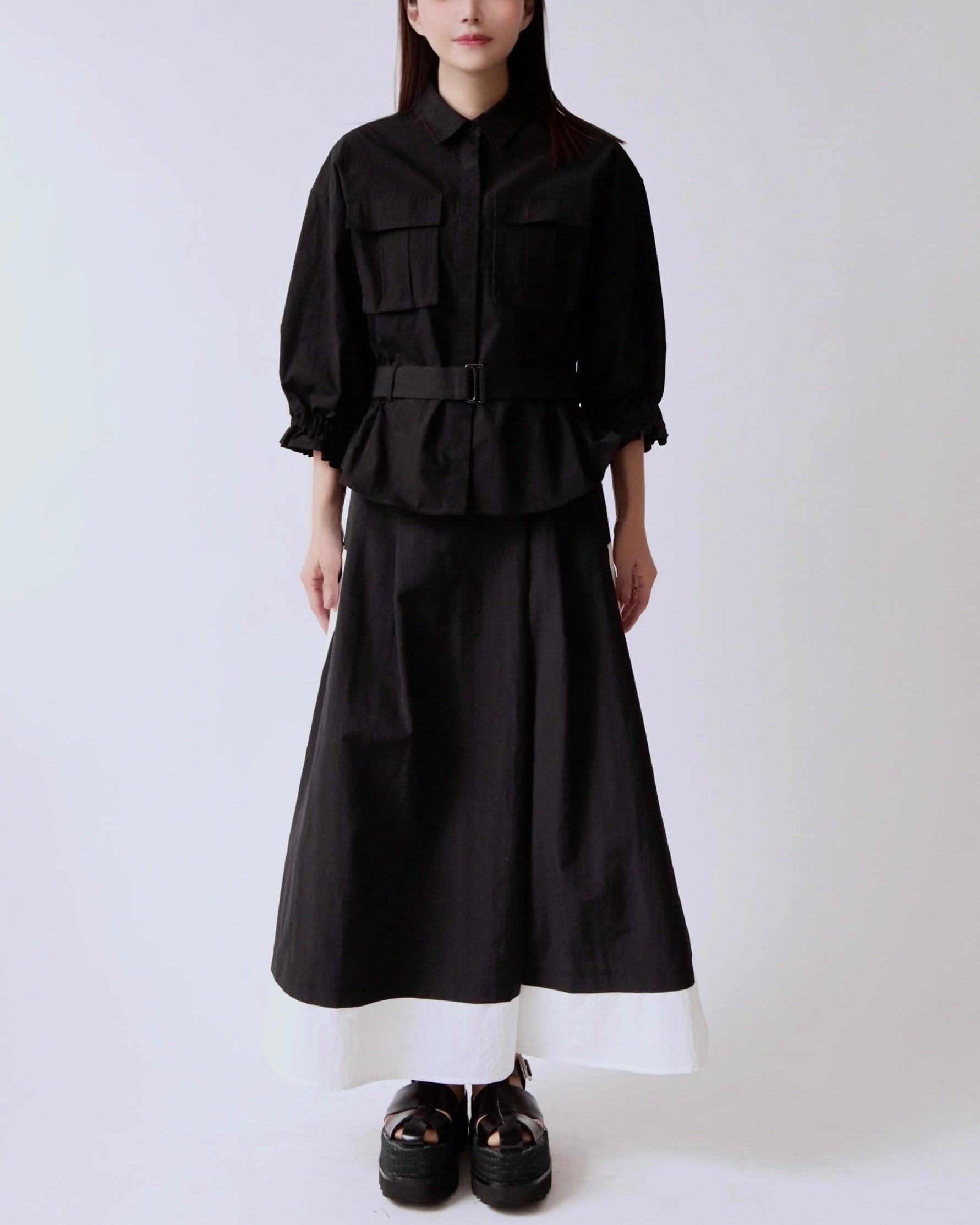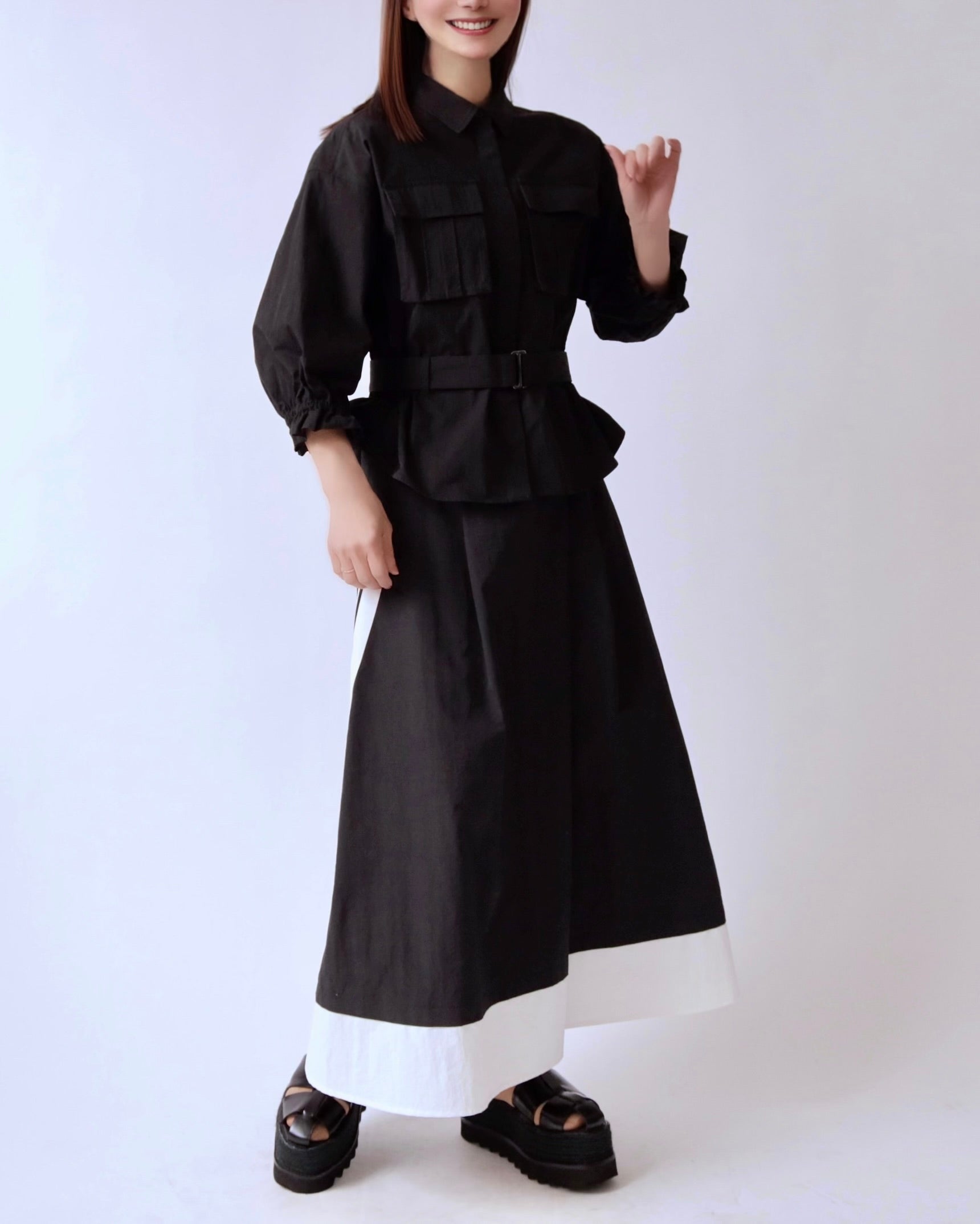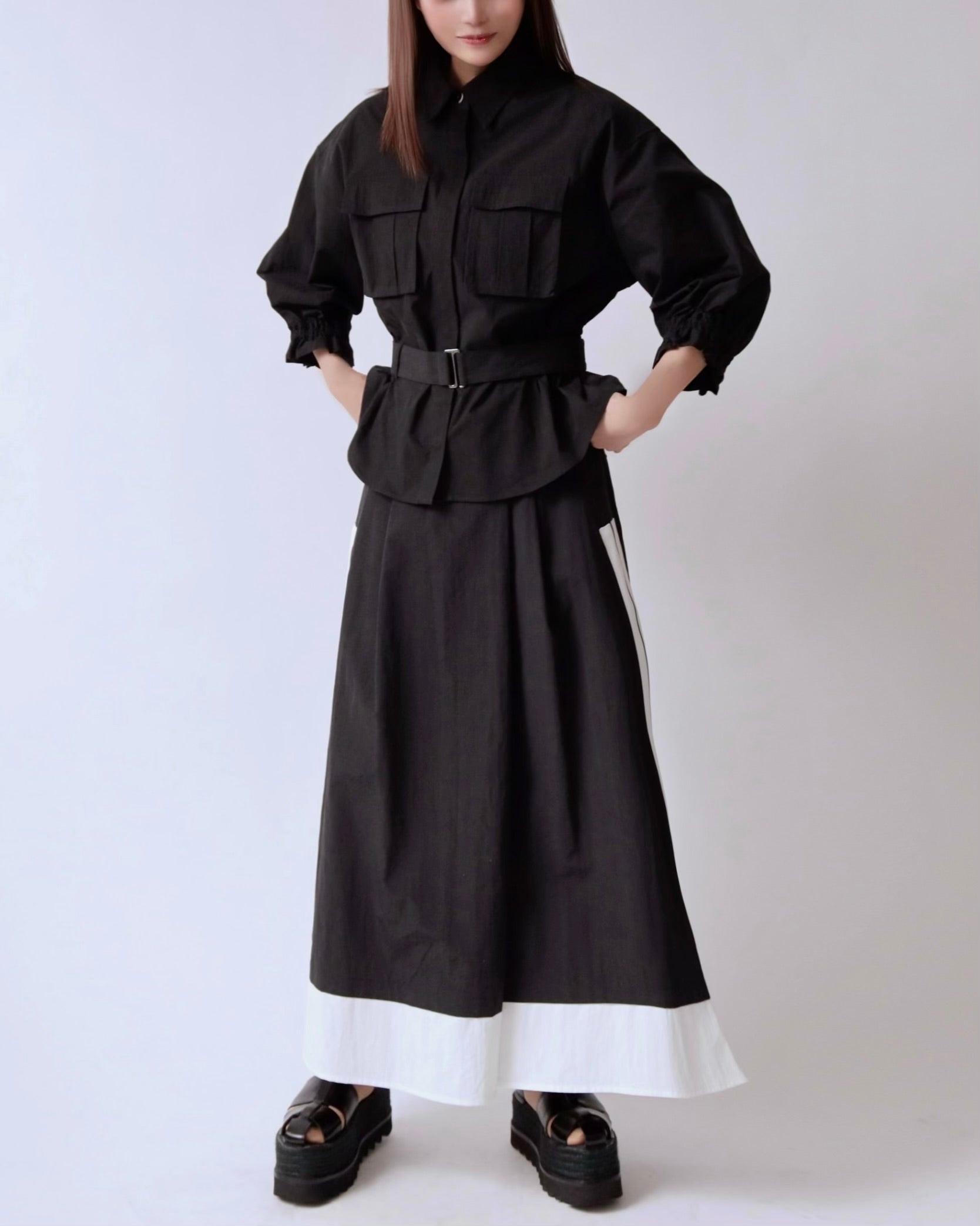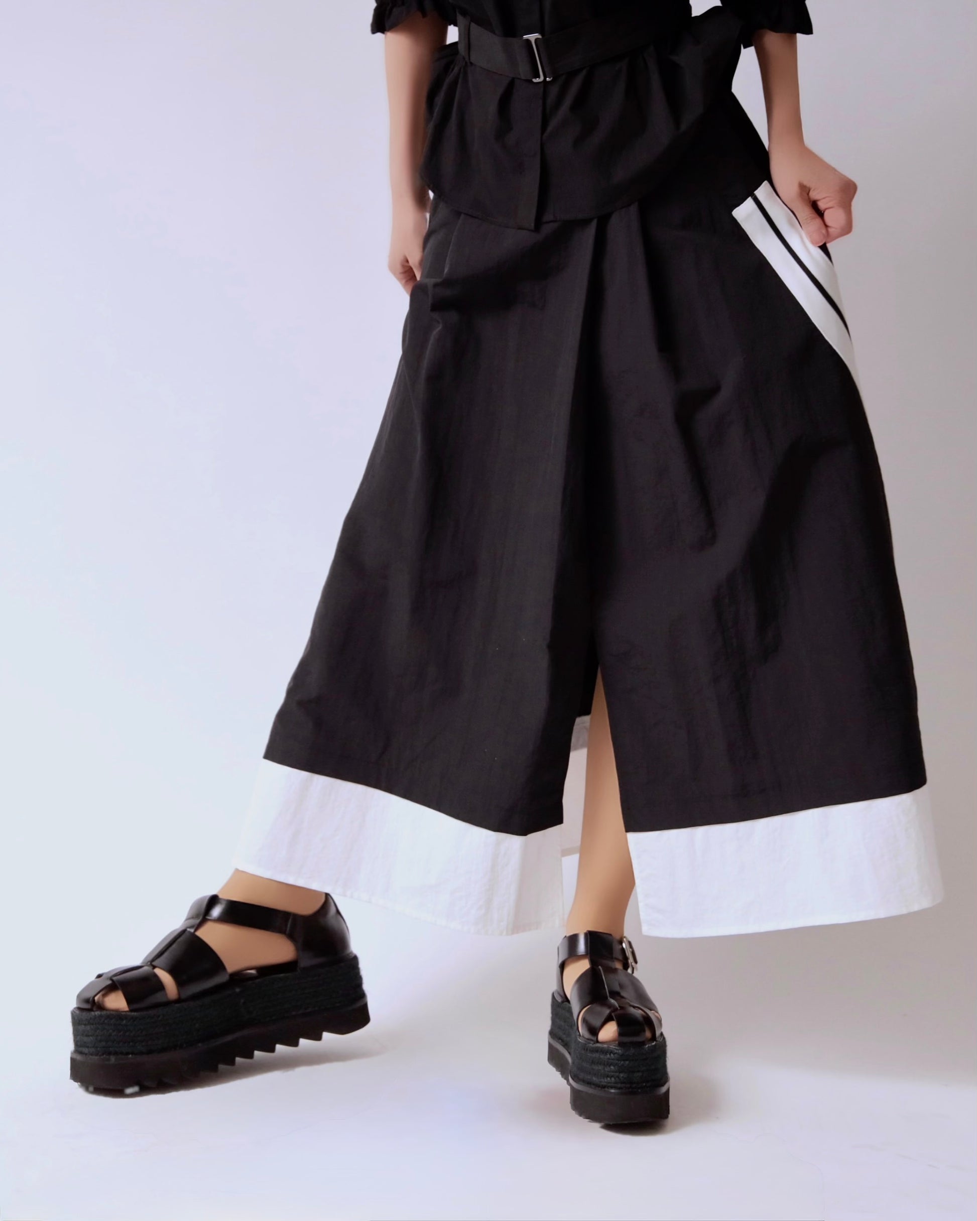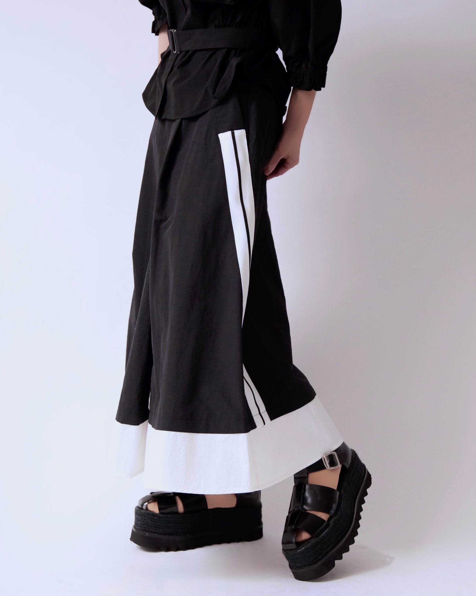 サイドに効かせたコントラストラインがスタイリングにさりげないエッジを添えるレイヤードスカート。