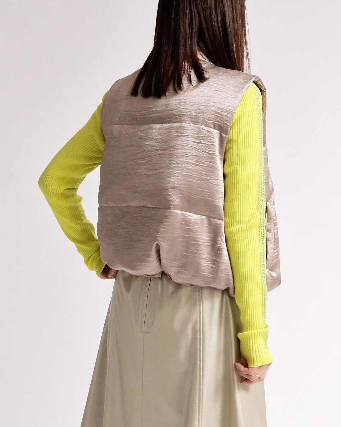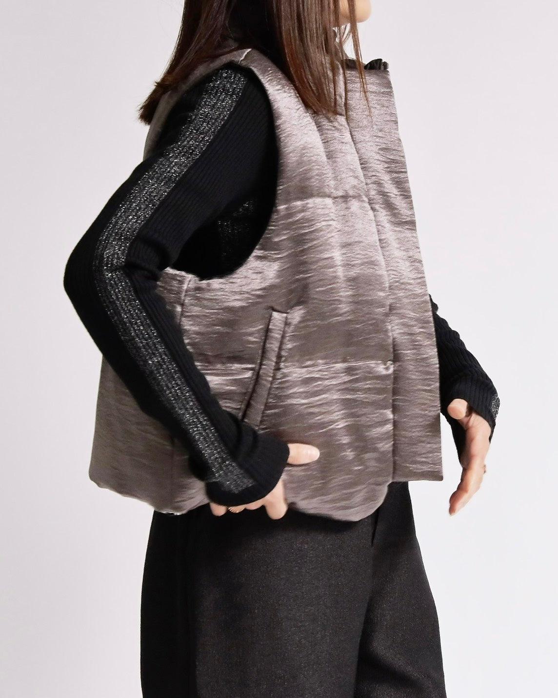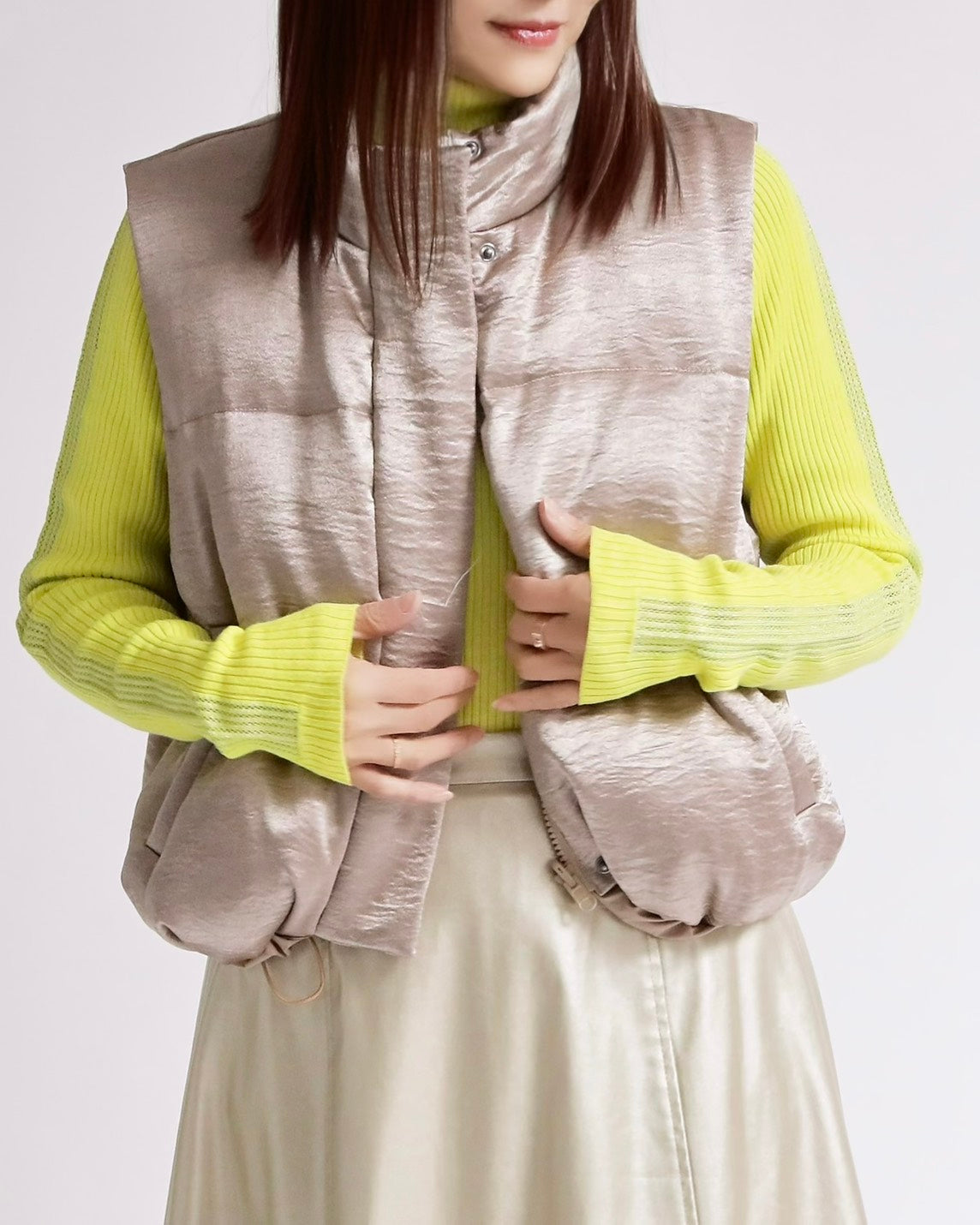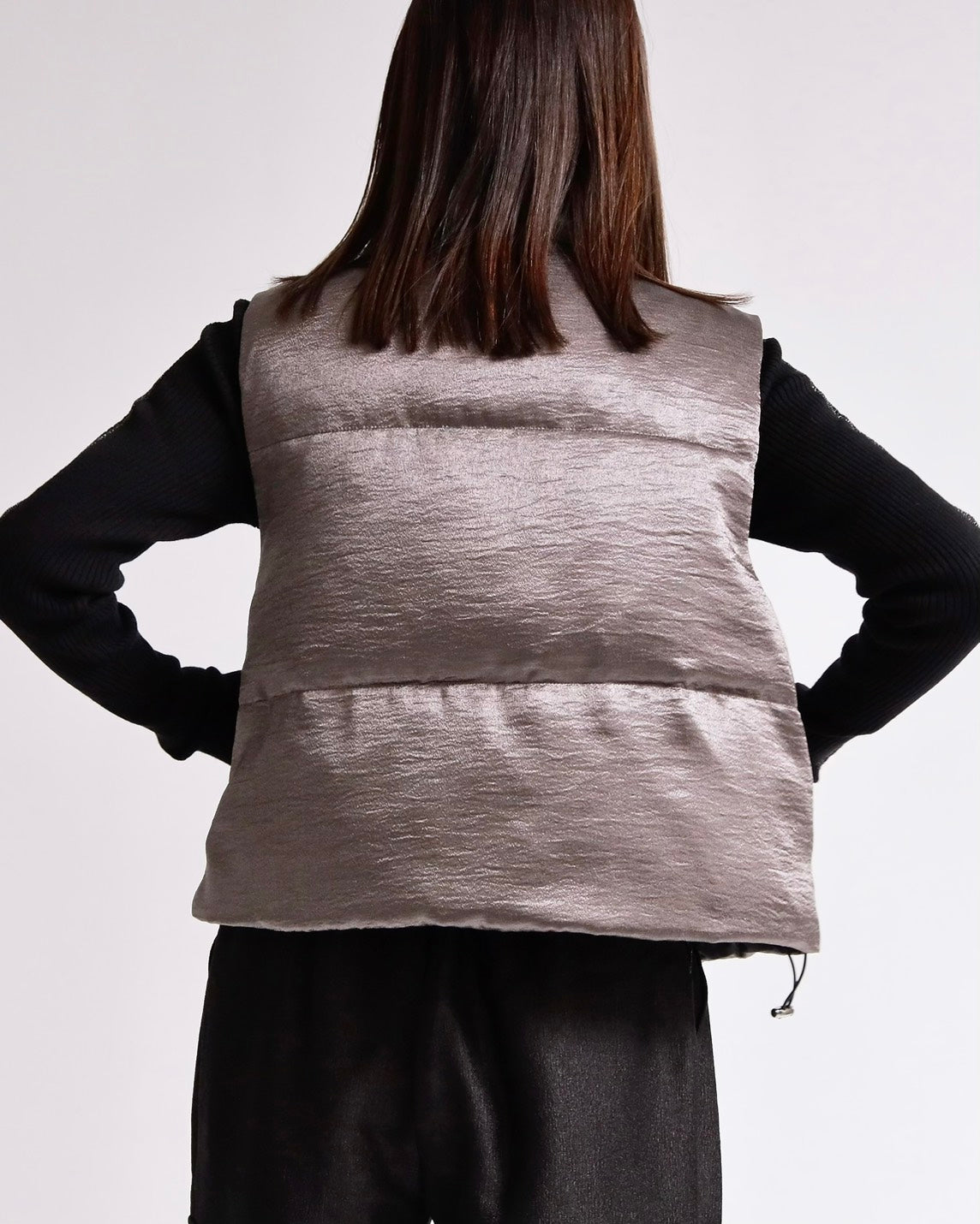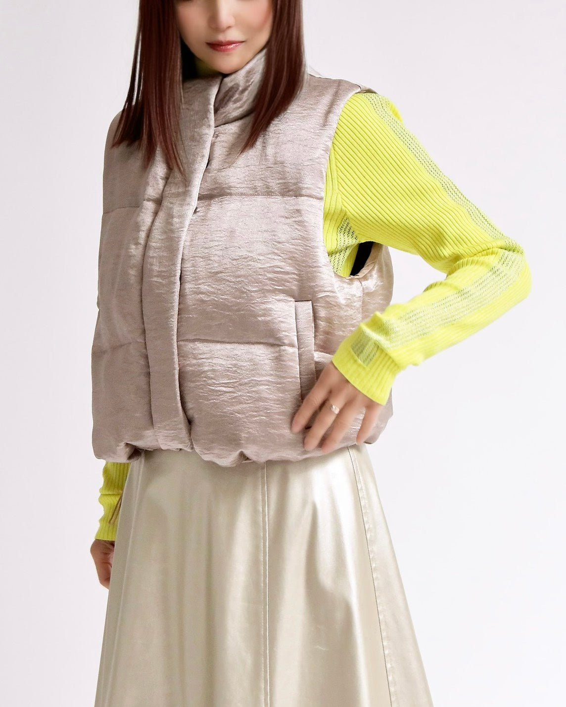 上品な光沢感のあるサテンタッチ素材を使用した、中綿入りスタンドベスト。