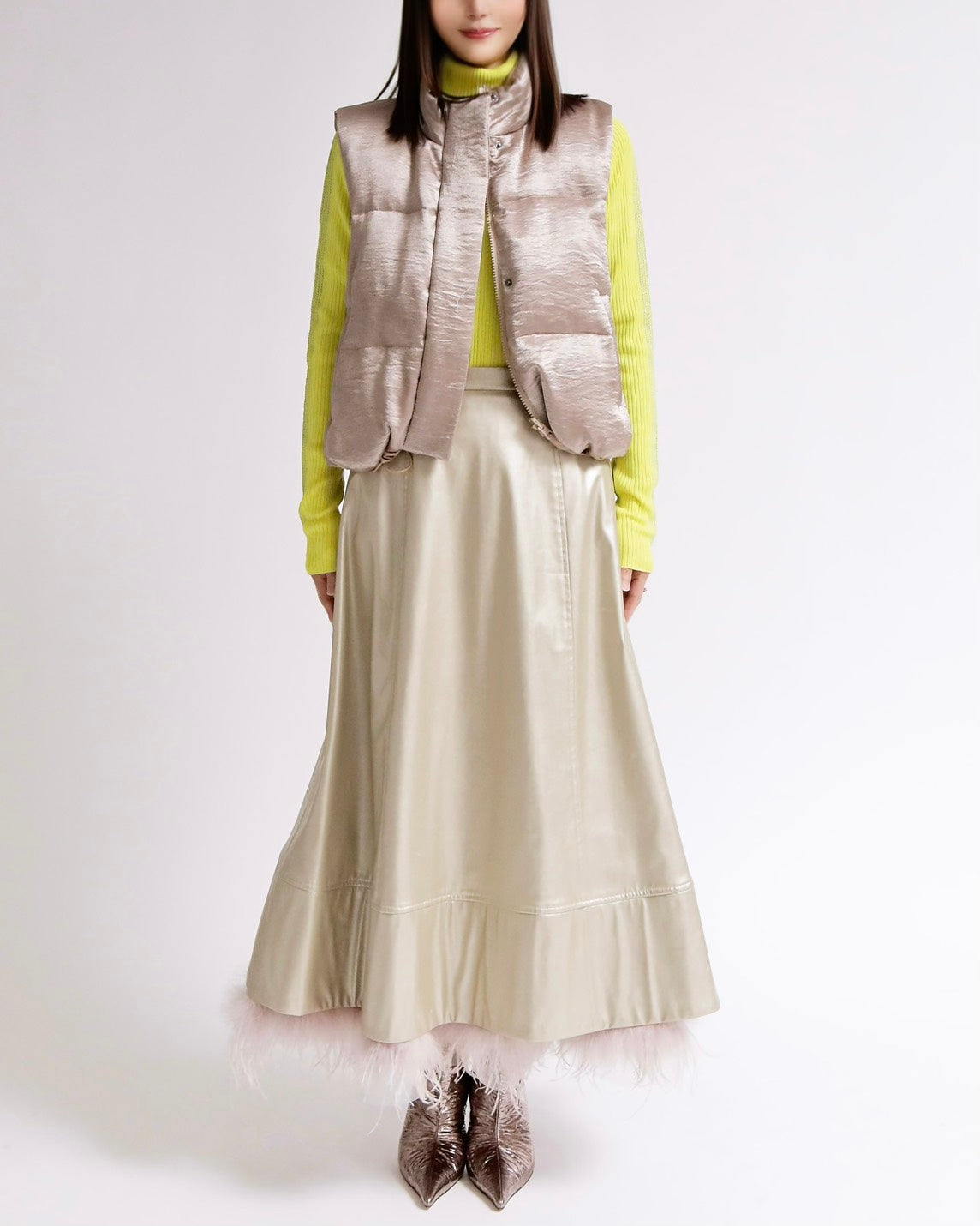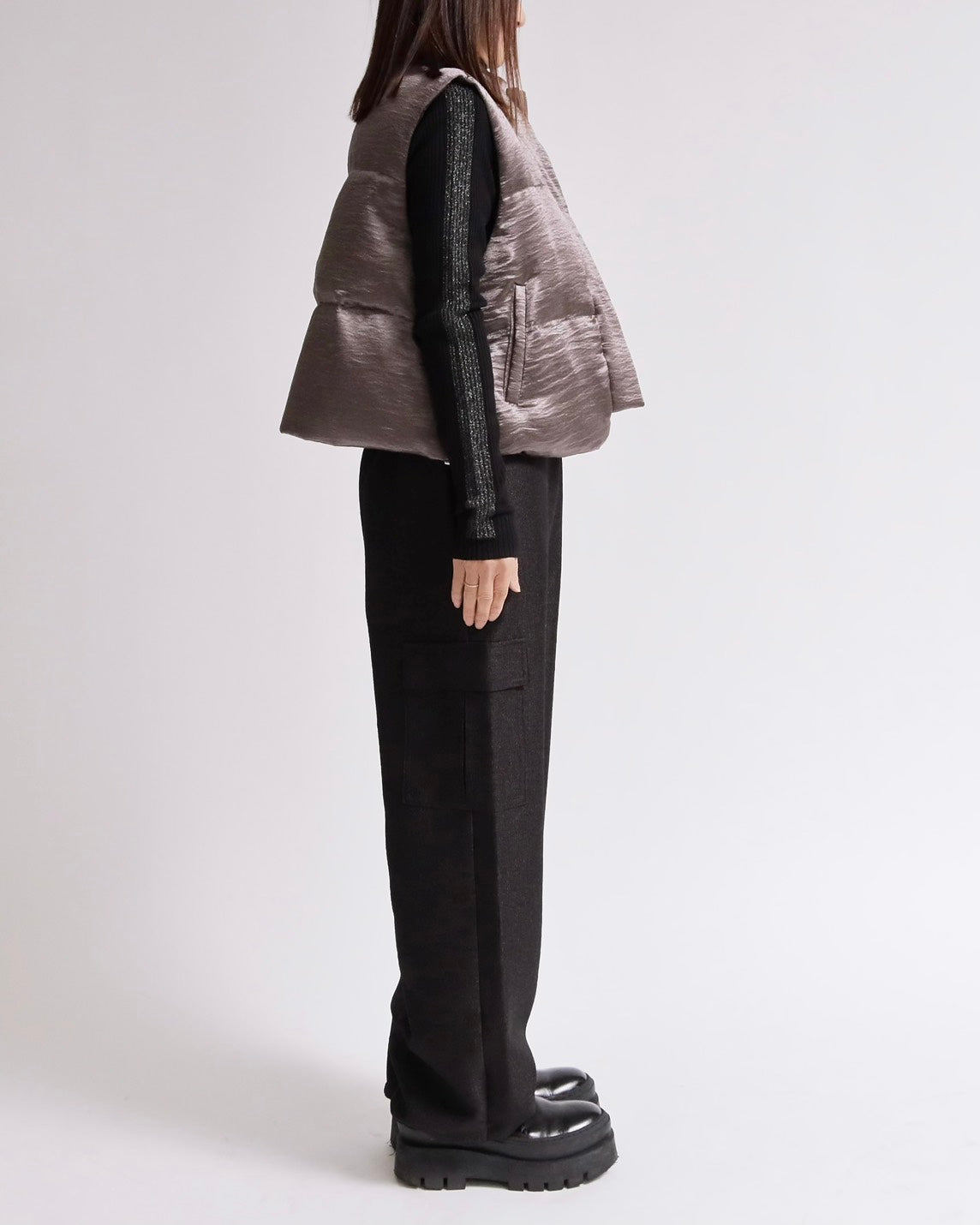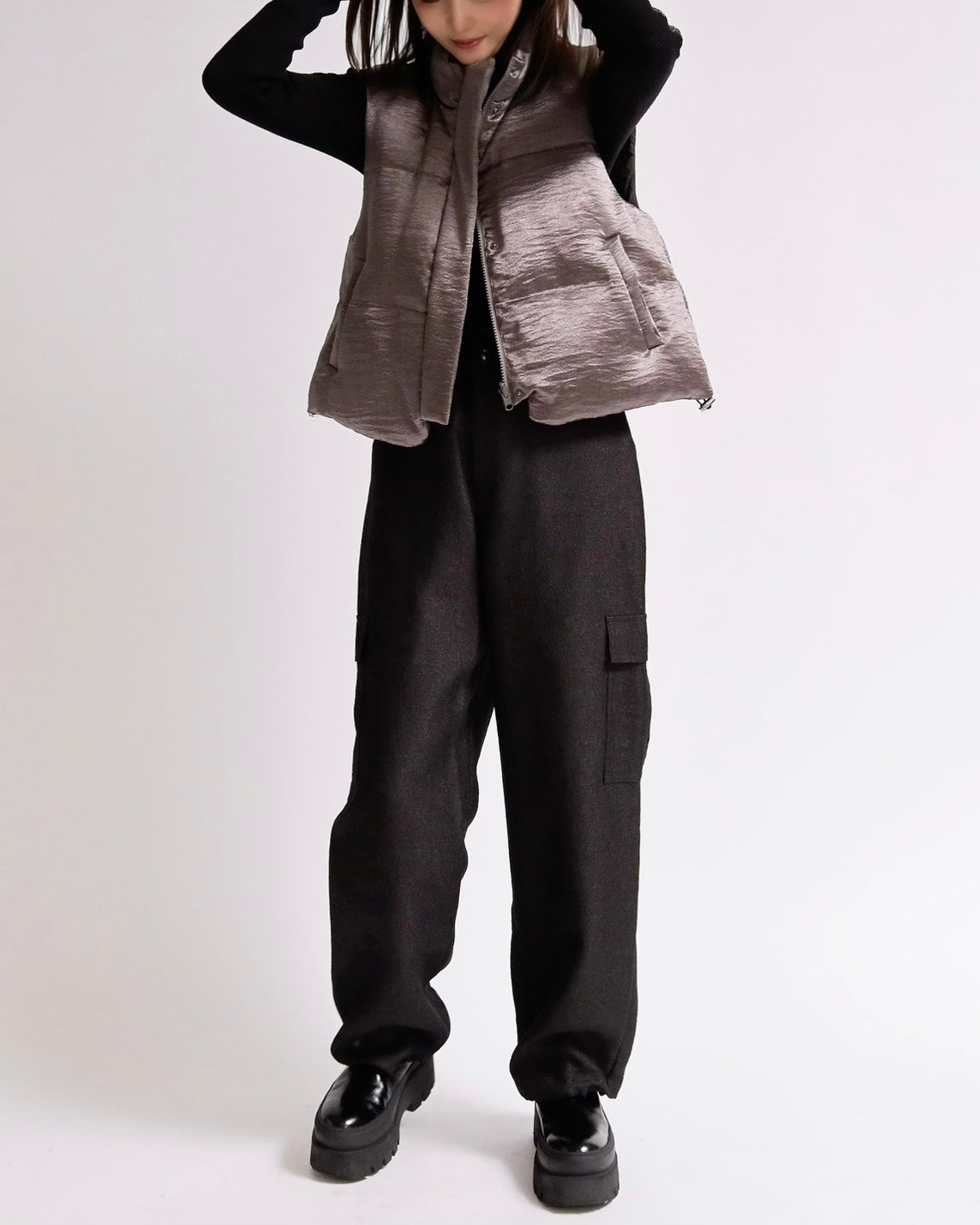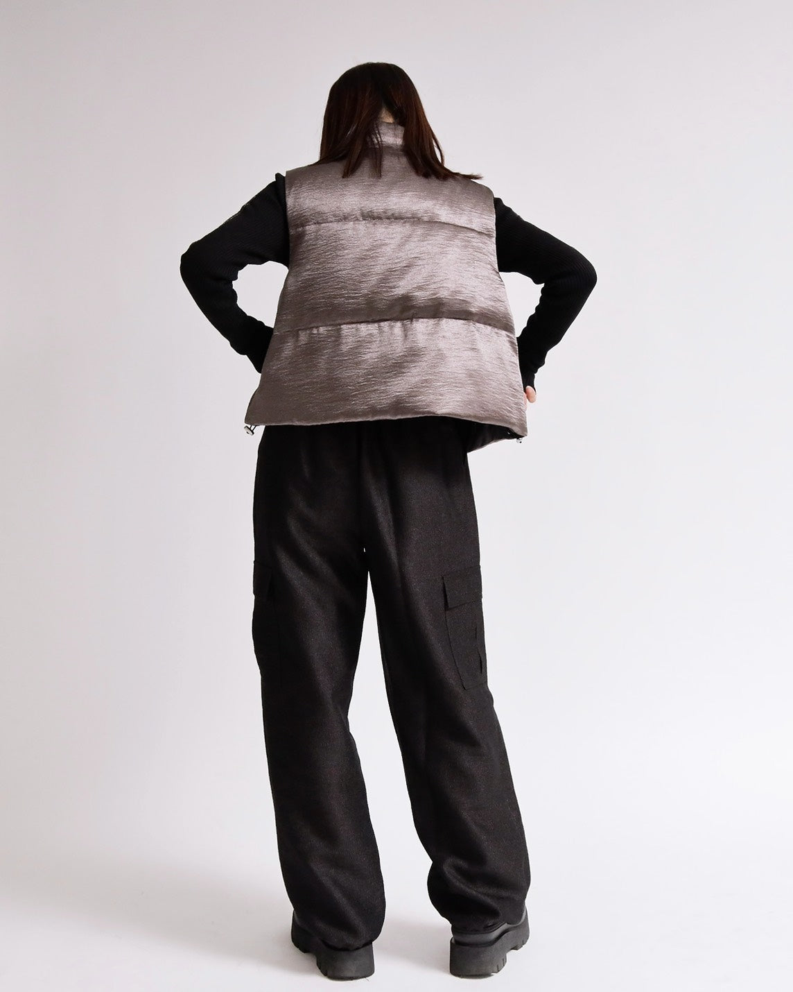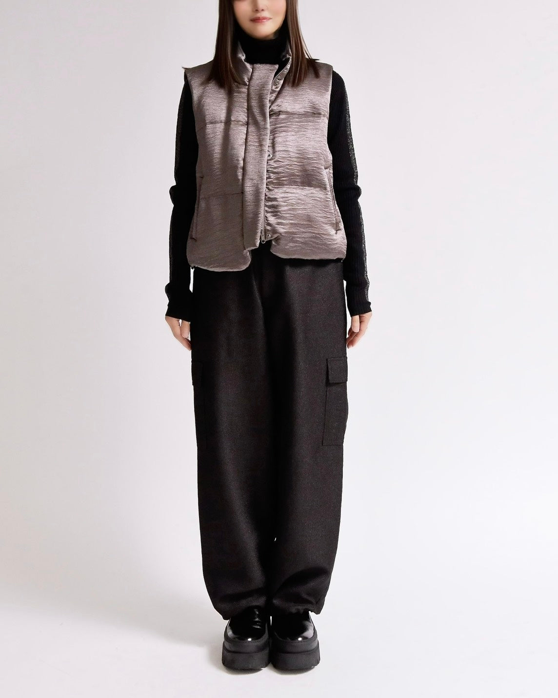 上品な光沢感のあるサテンタッチ素材を使用した、中綿入りスタンドベスト。