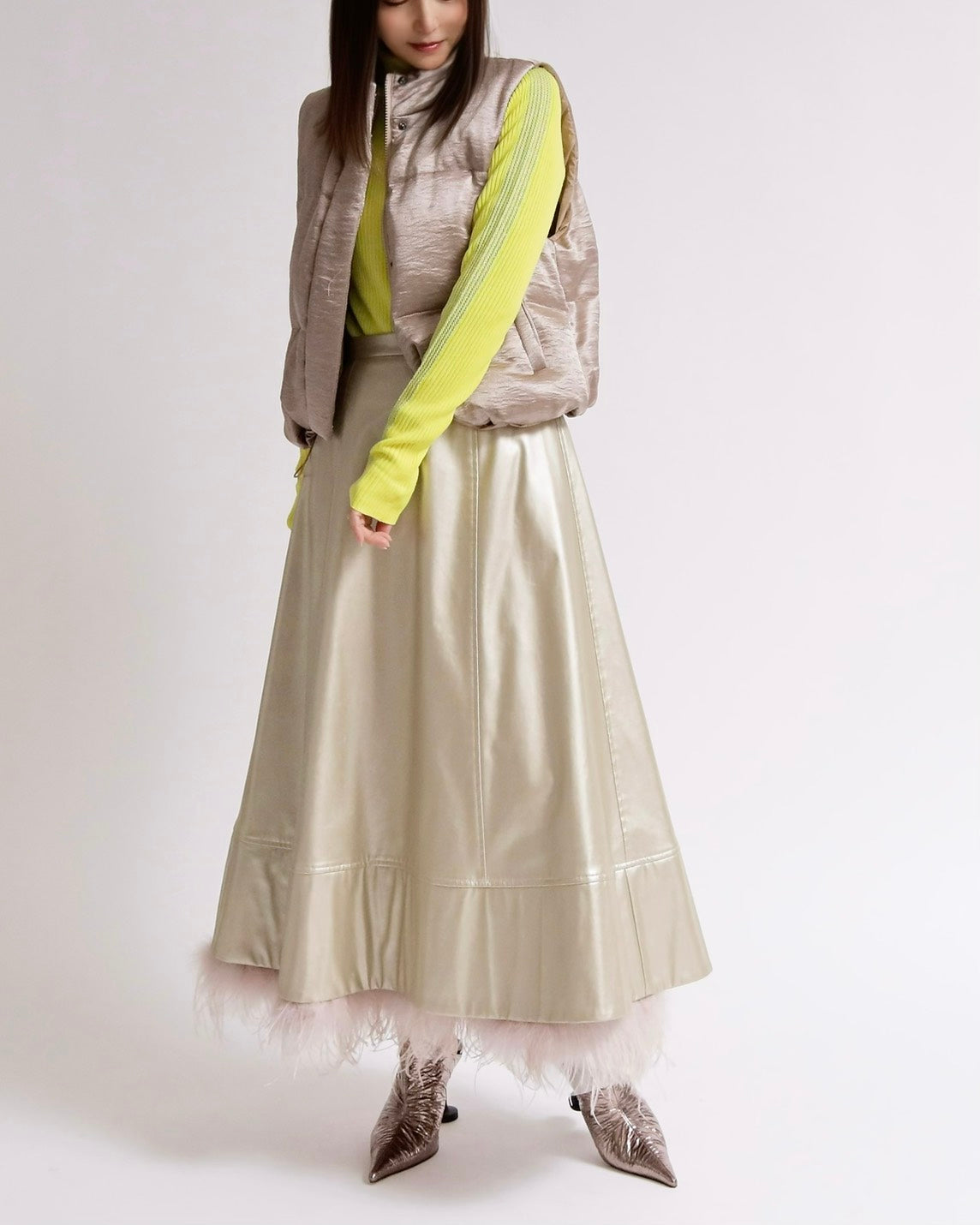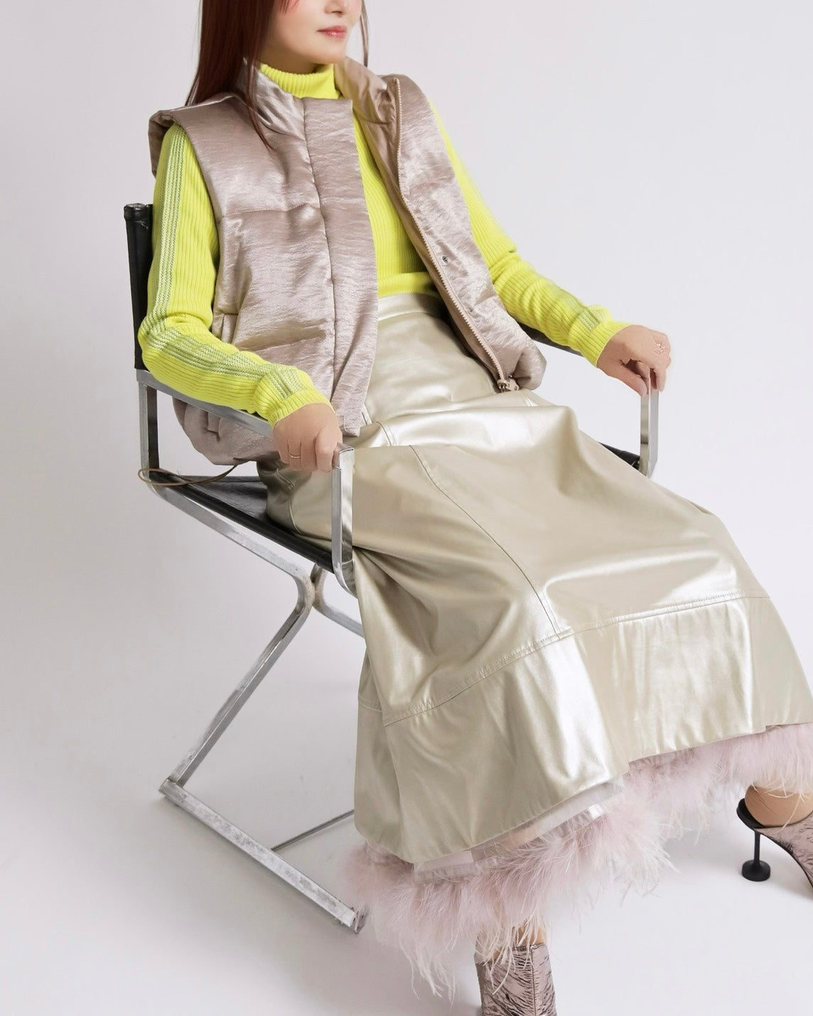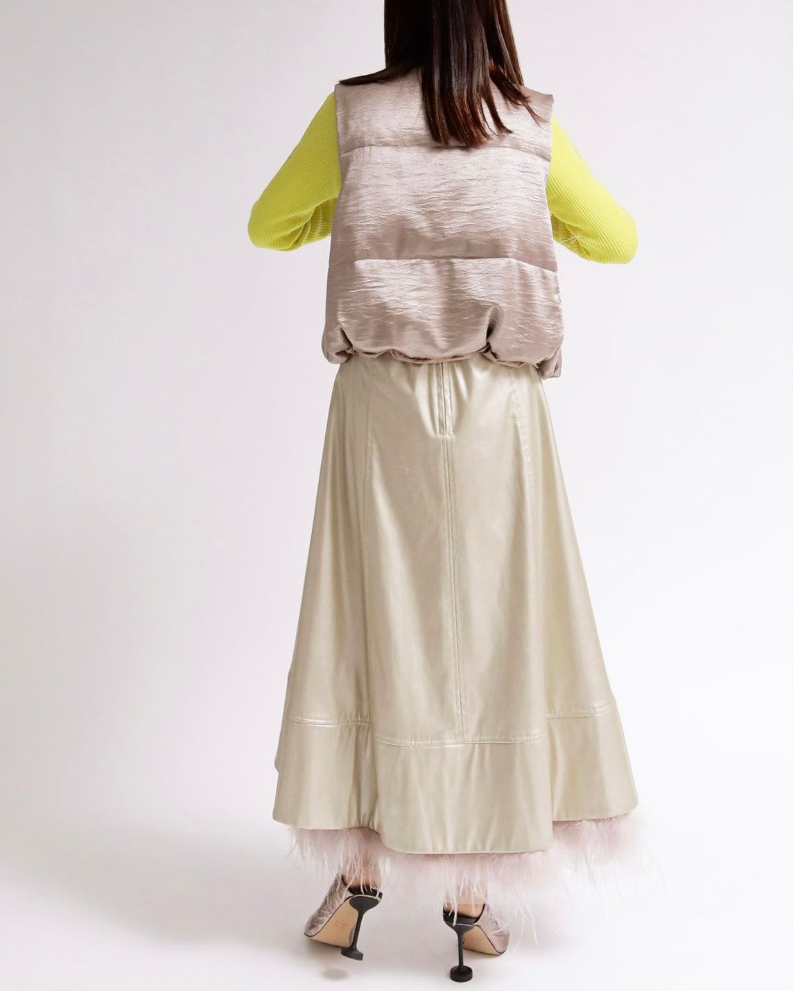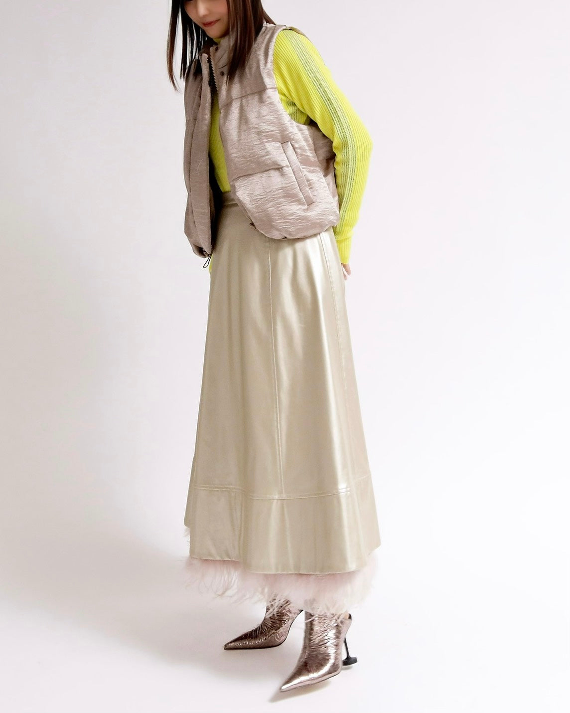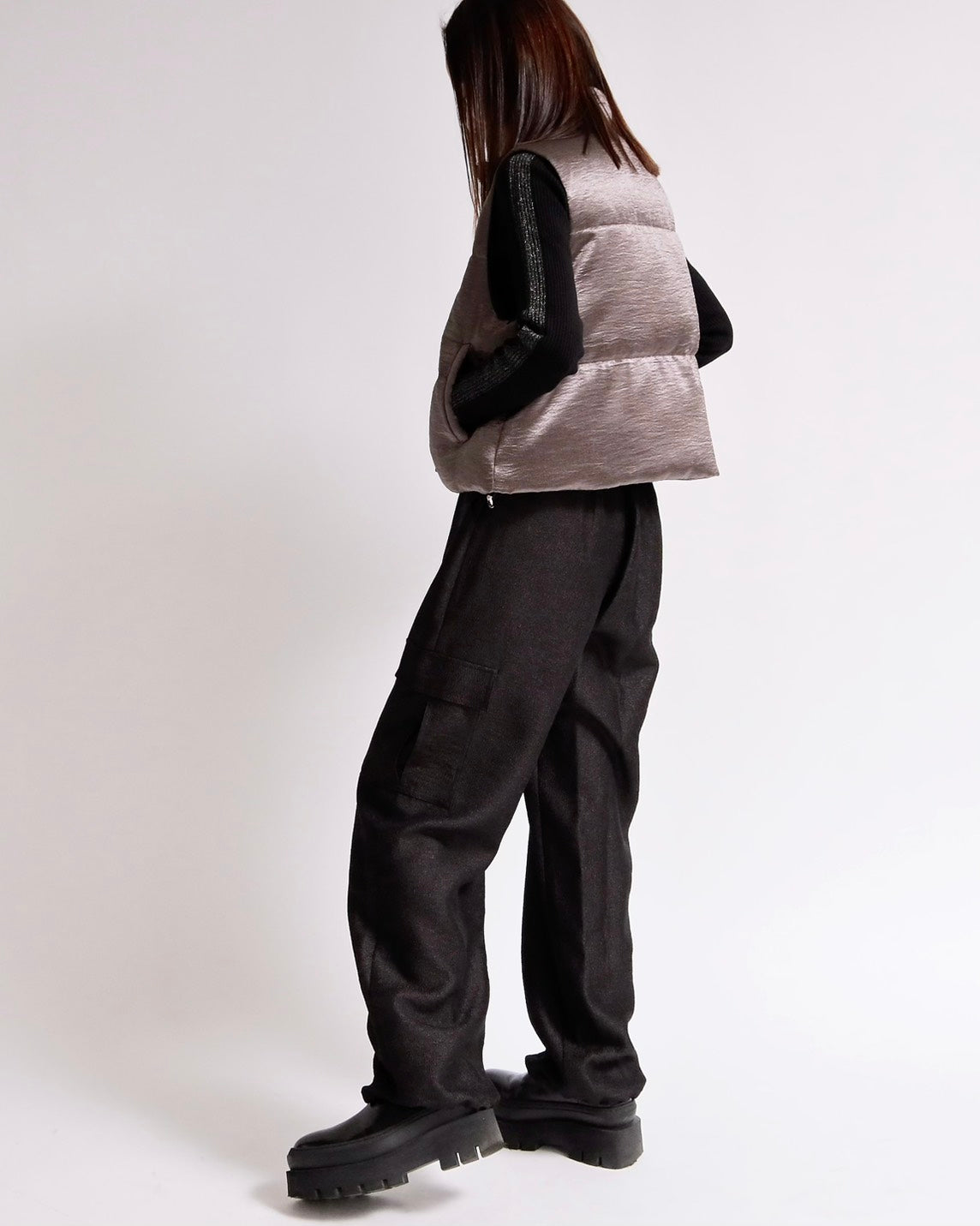 上品な光沢感のあるサテンタッチ素材を使用した、中綿入りスタンドベスト。