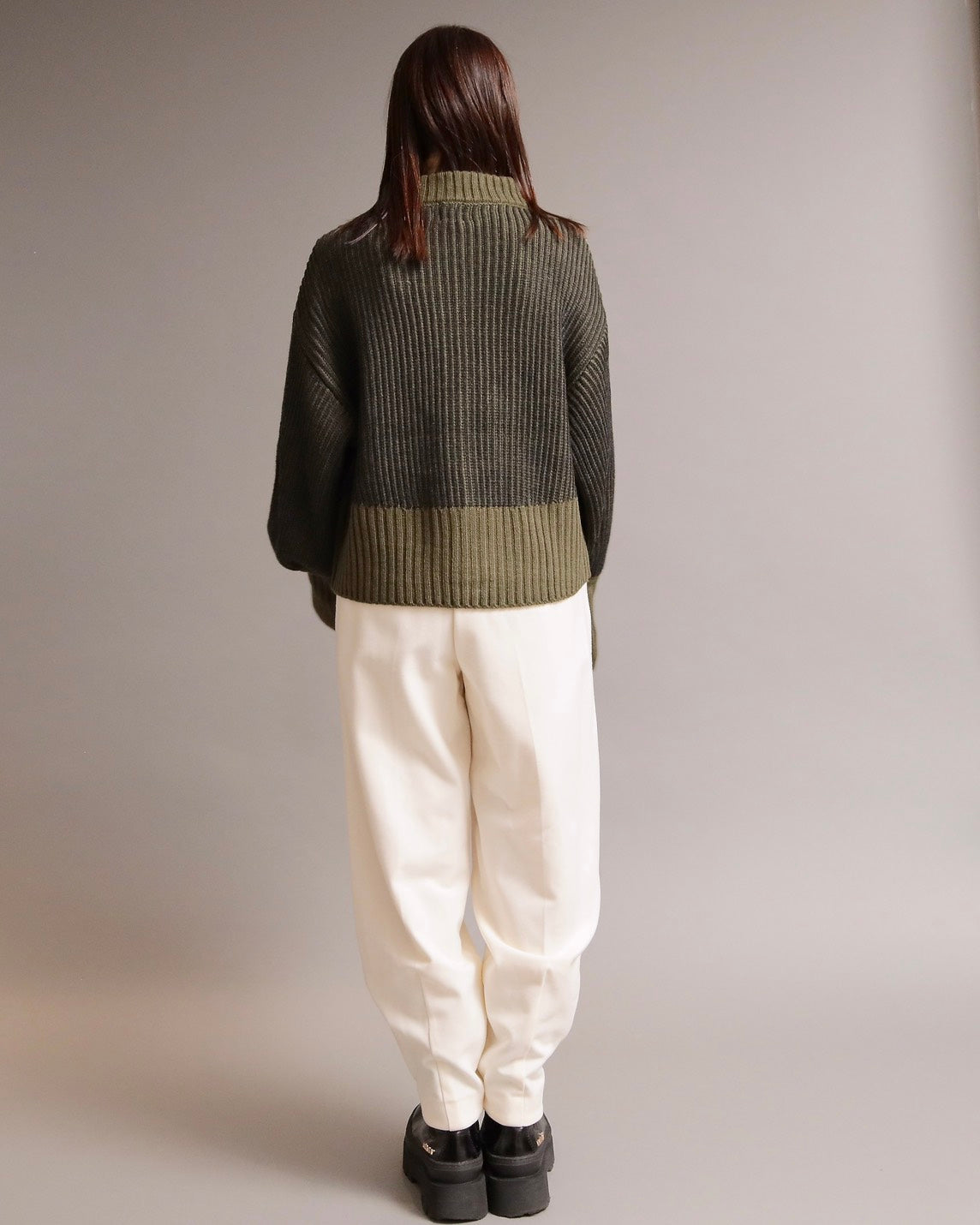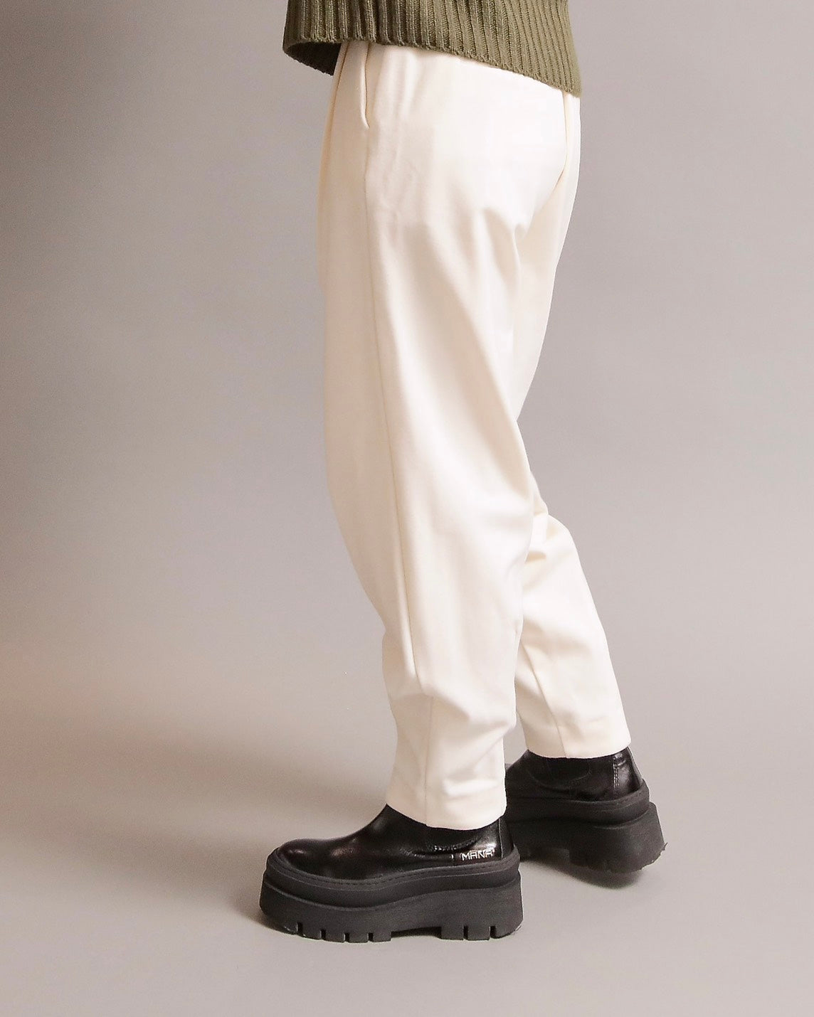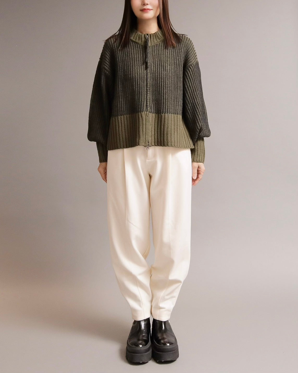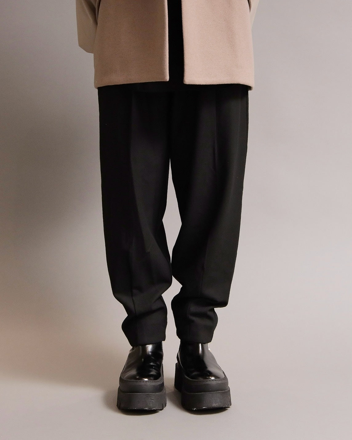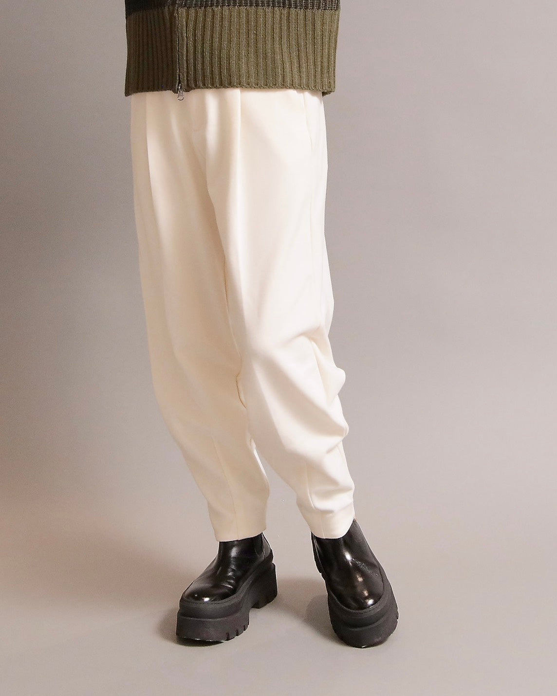 立体的なタックと緩やかなカーブラインが生み出す、美しいフォルムが魅力のカーブシルエットパンツ。腰回りにはゆとりを持たせつつ、足首に向かってすっきりと収まるテーパードシルエットで、スタイルアップ効果も抜群です。