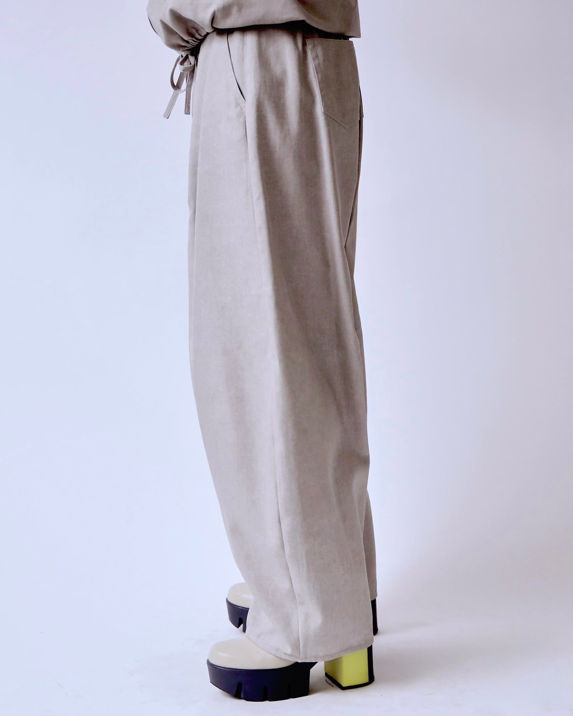 ウエストはドローストリング仕様で、リラックスした穿き心地ながら、落ち感のある素材によりカジュアル過ぎない印象に。