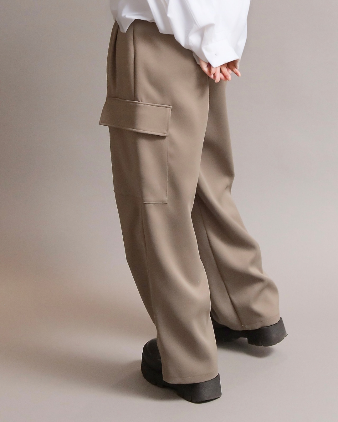 サイドに配したフラップポケットは立体的すぎず、都会的で洗練された印象。タック入りのゆるやかなワイドラインは脚をまっすぐ見せ、トップスを選ばず着回せる万能シルエットです。