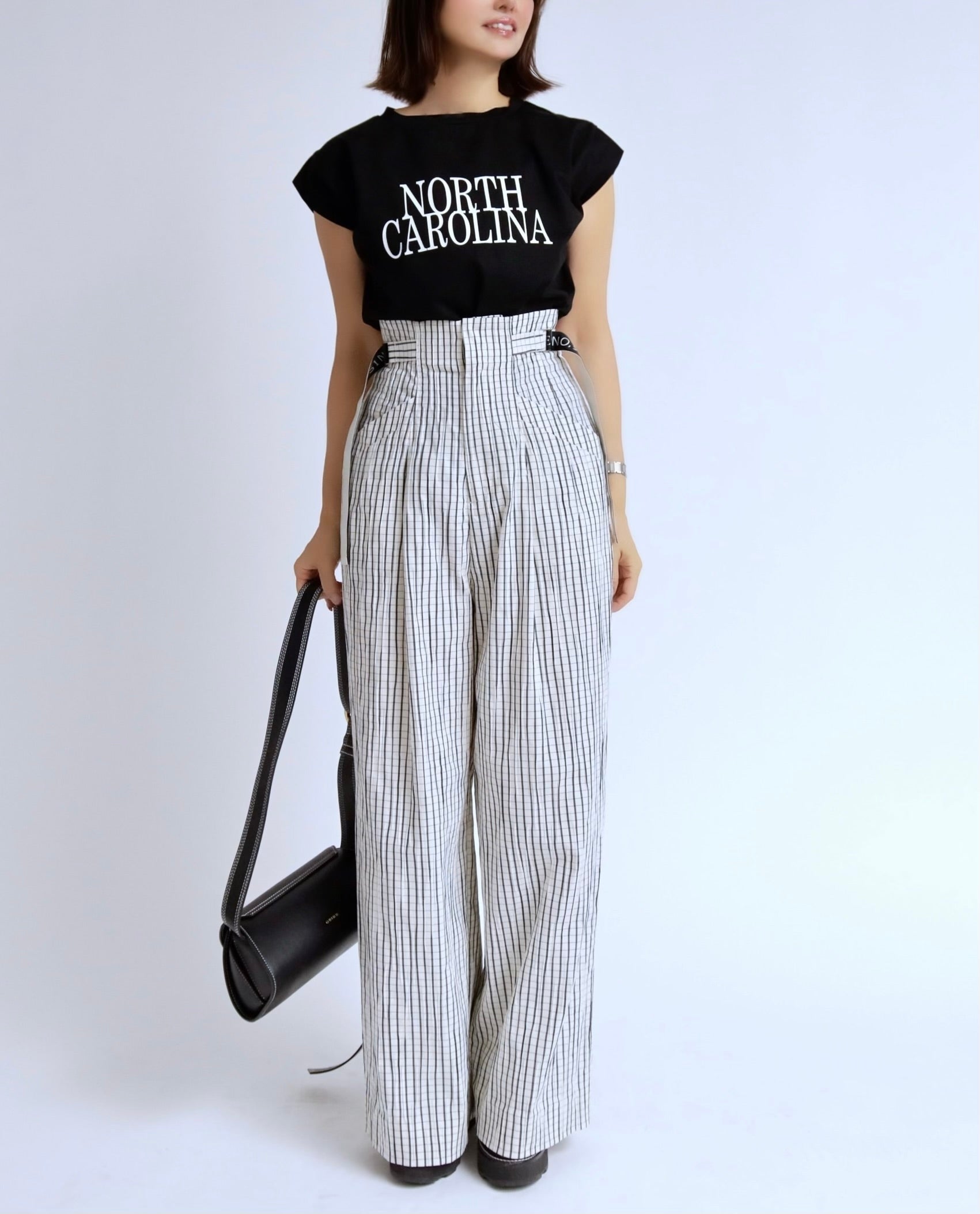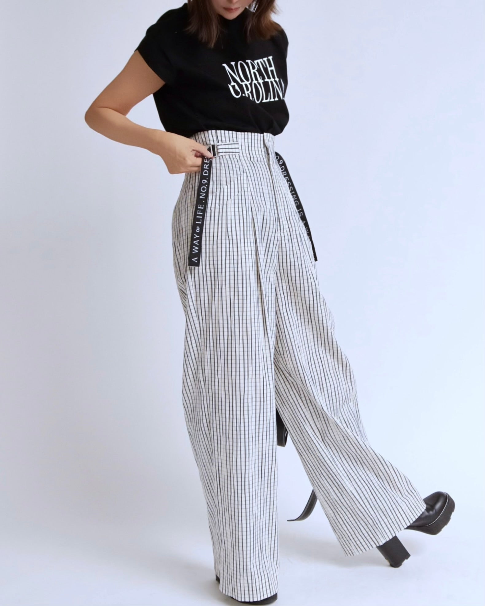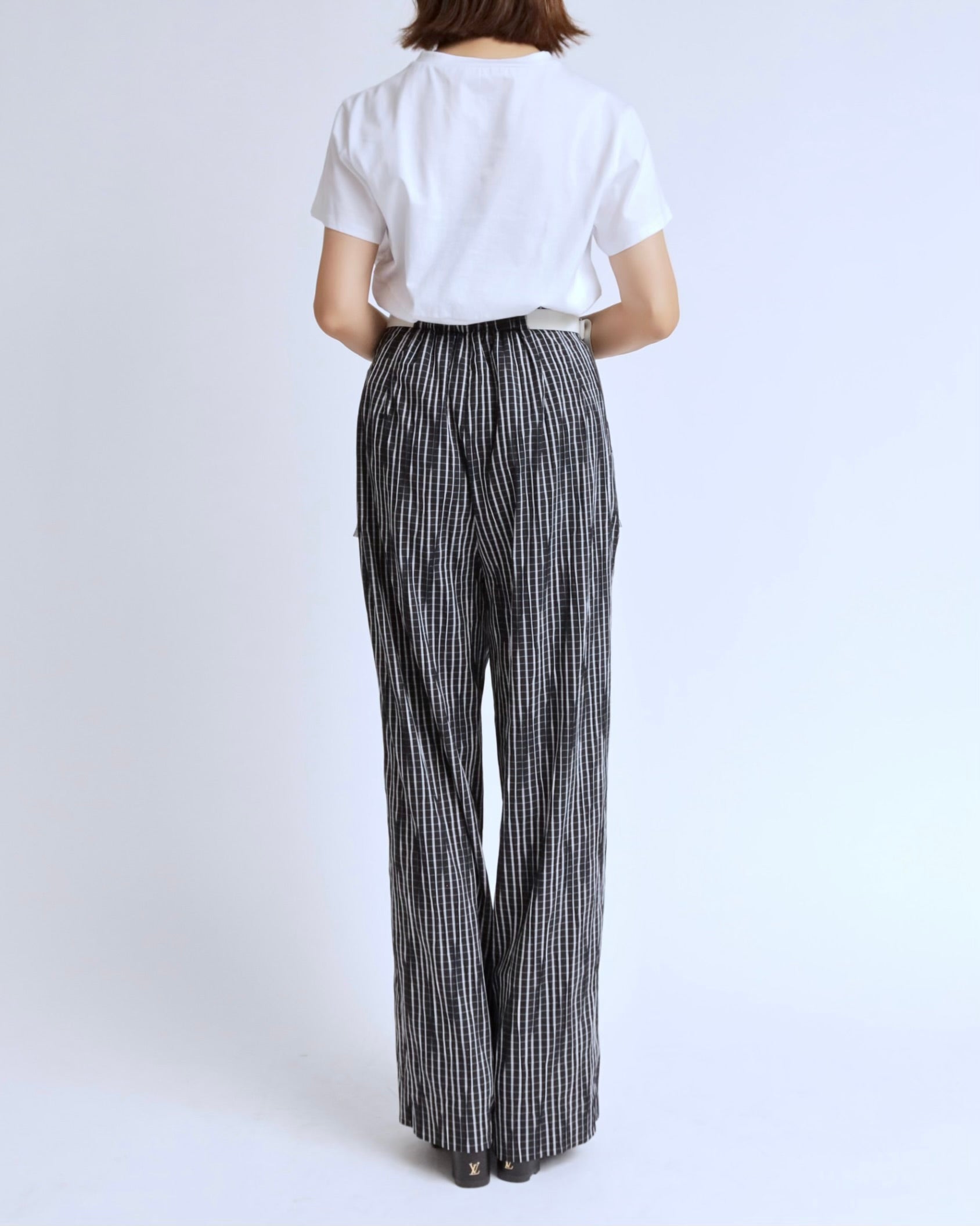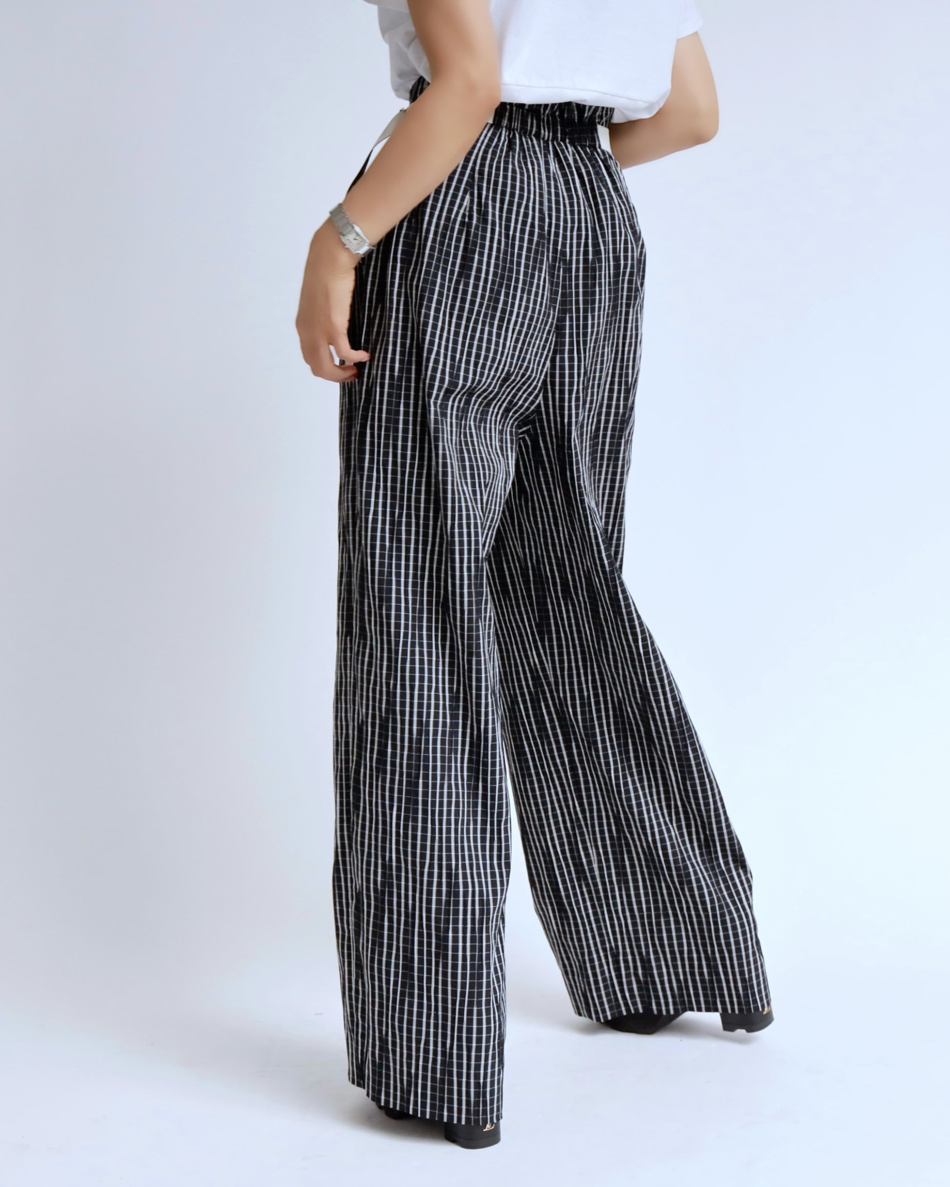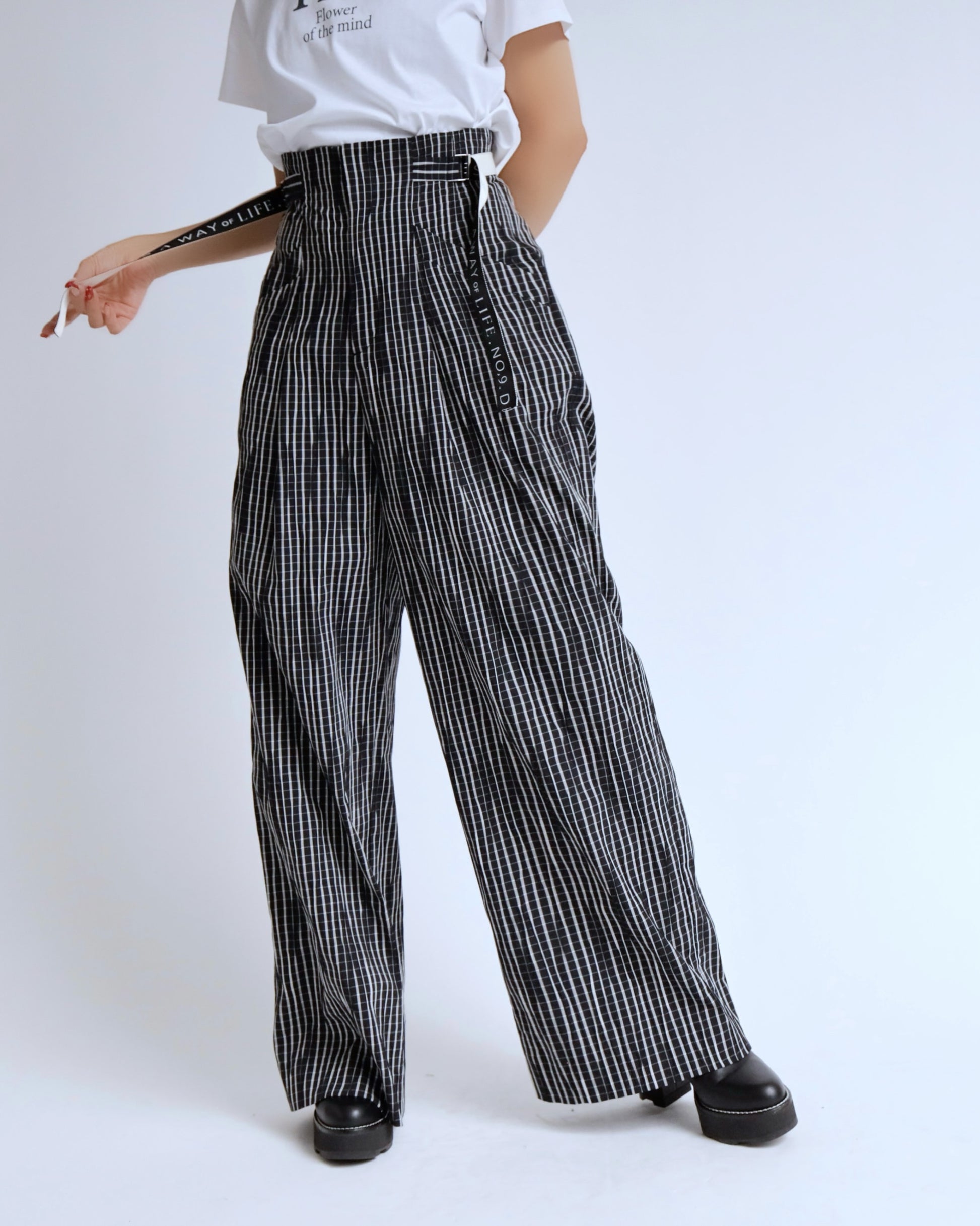 ハイウエストの美しいラインと、存在感のあるチェック柄が印象的なワイドパンツ。