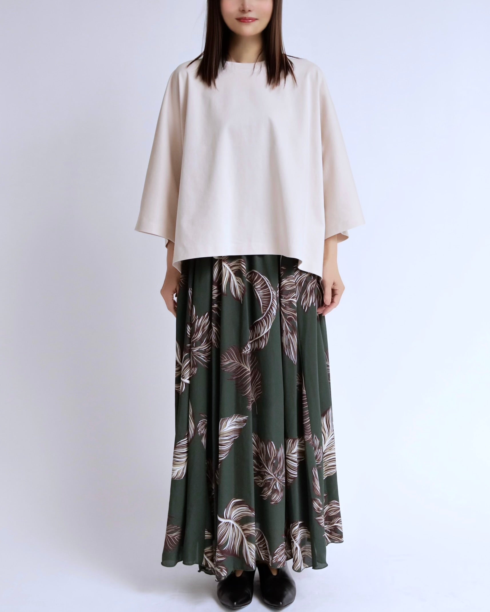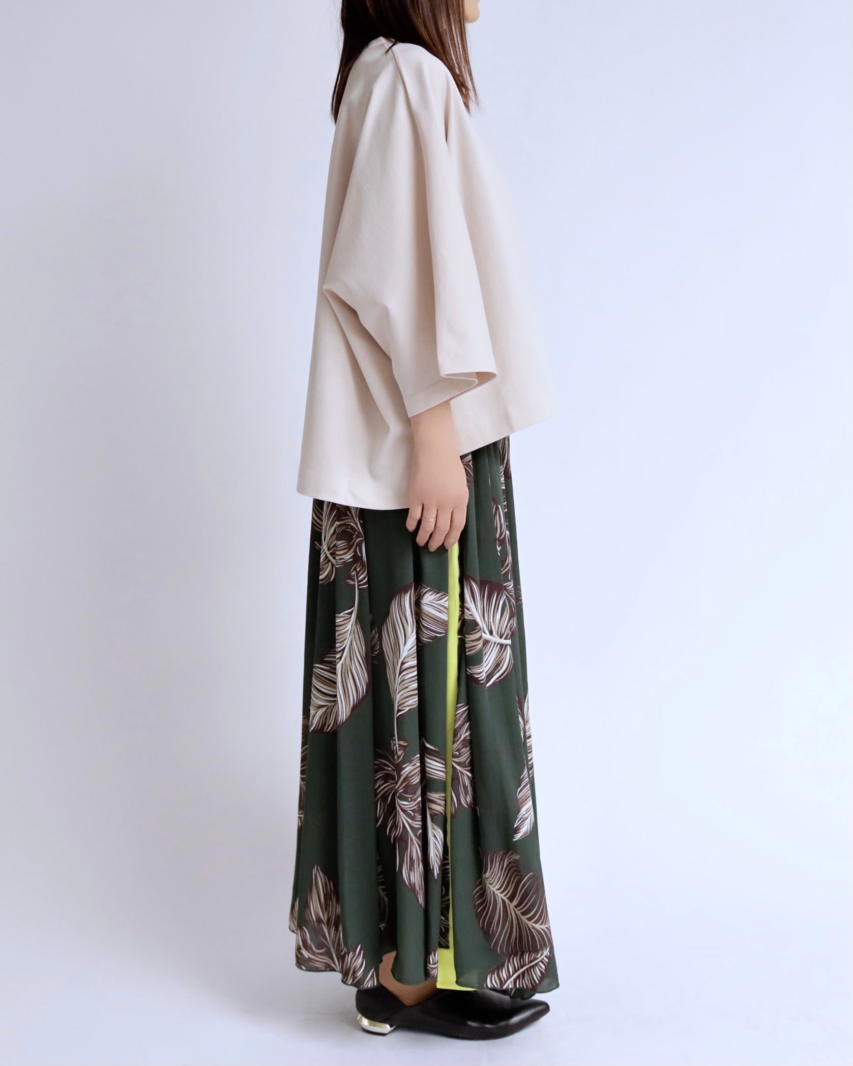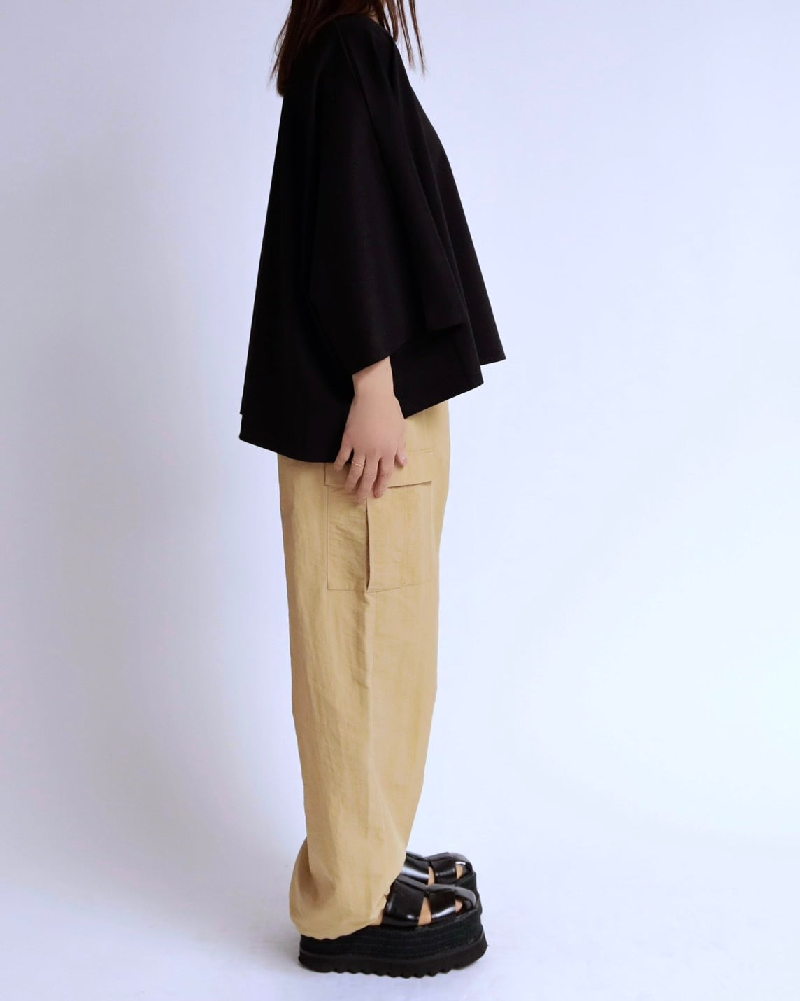 布をたっぷり使ったワイドなシルエットが、動くたびに自然なドレープを生み、シンプルながらも存在感のある一枚に仕上がっています。