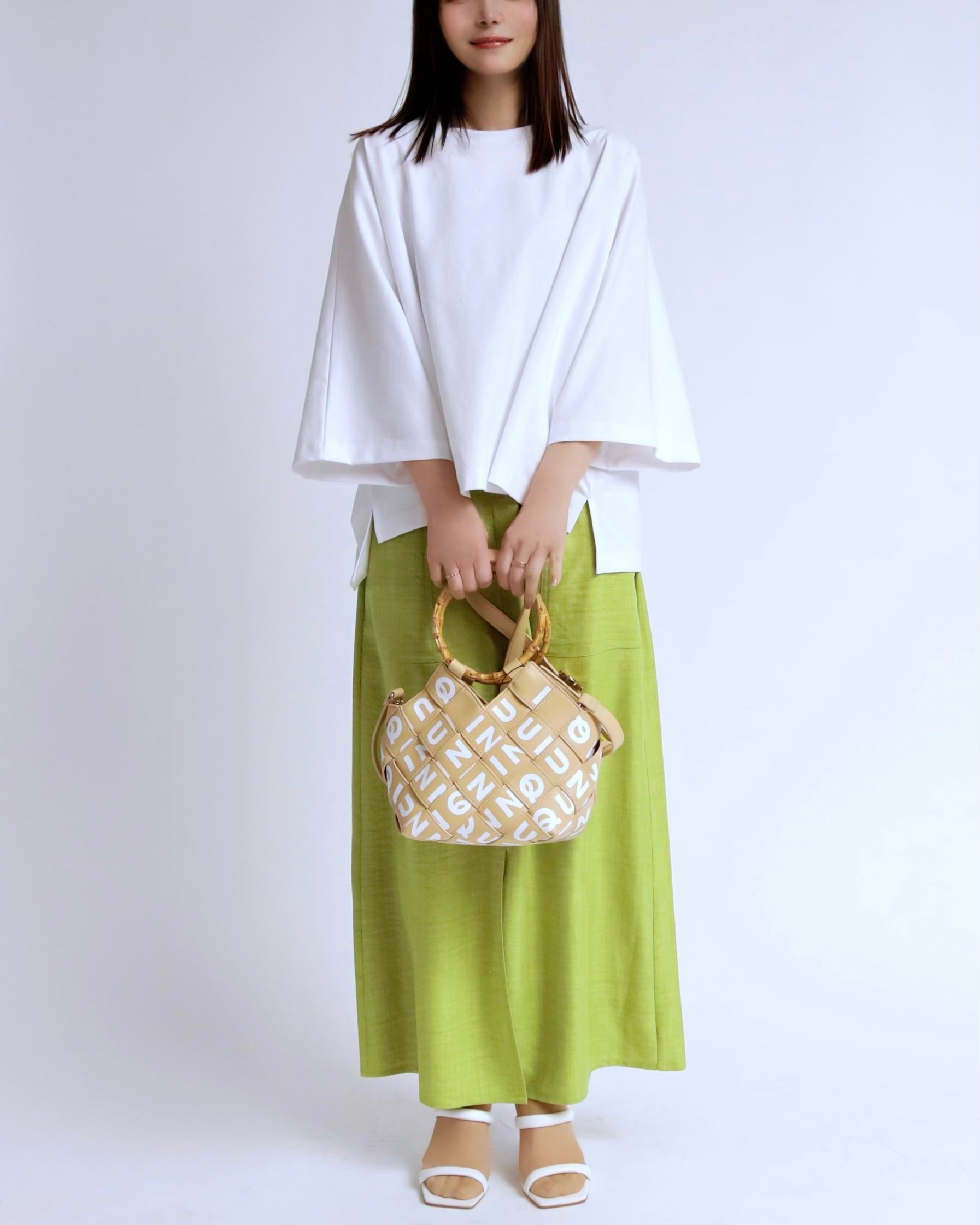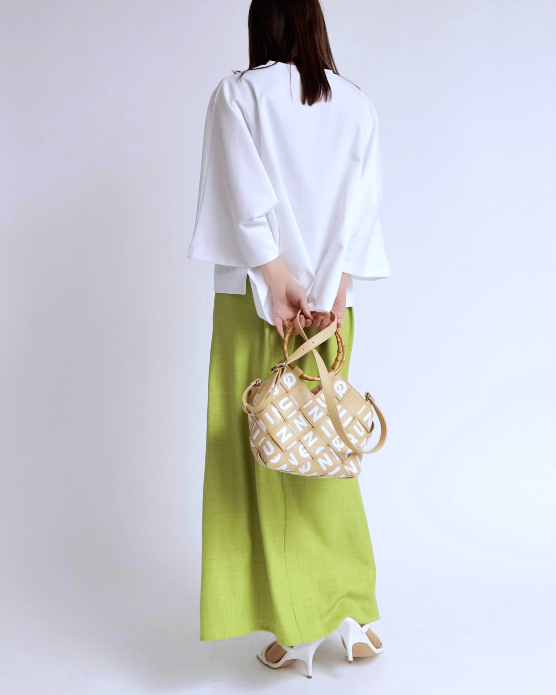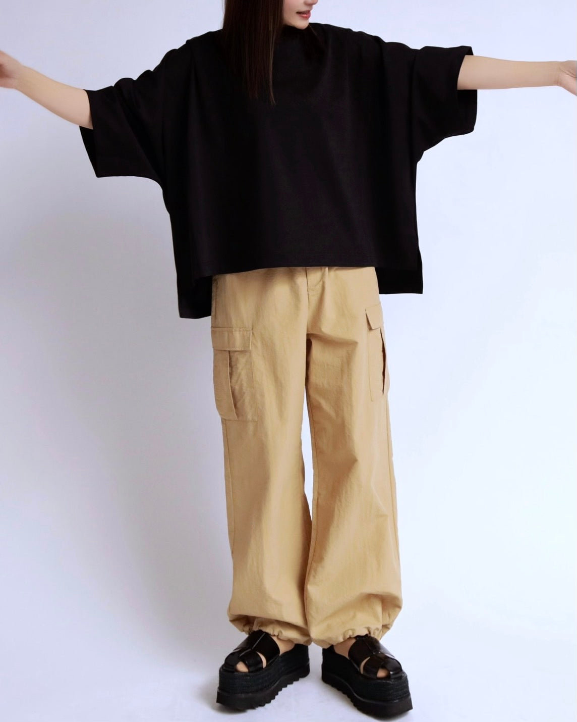 布をたっぷり使ったワイドなシルエットが、動くたびに自然なドレープを生み、シンプルながらも存在感のある一枚に仕上がっています。