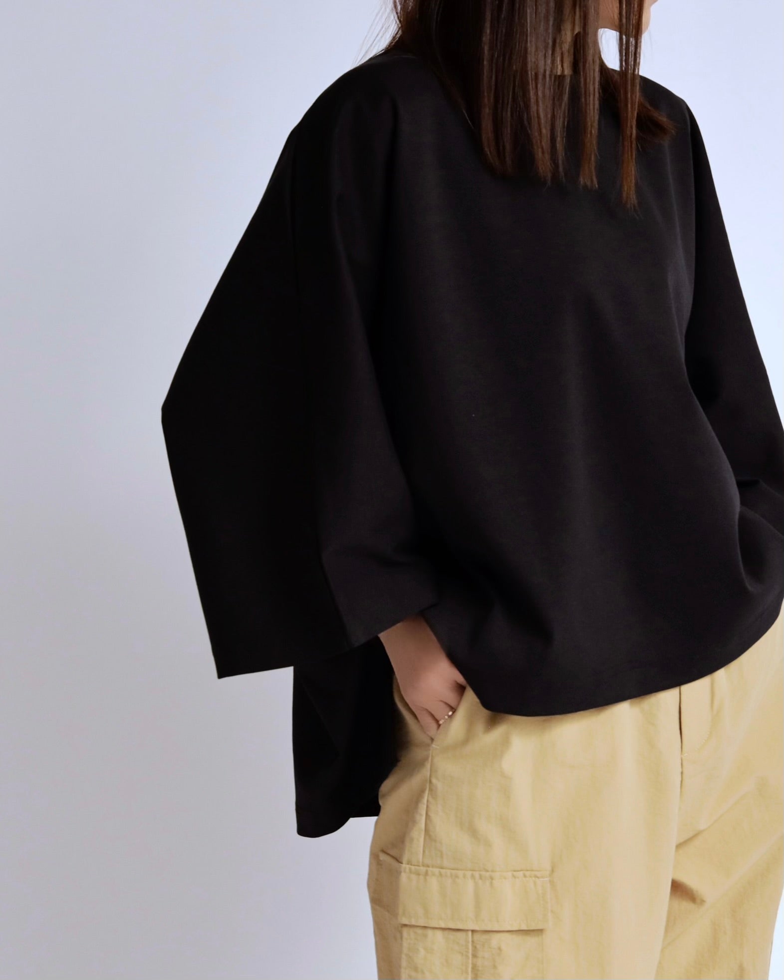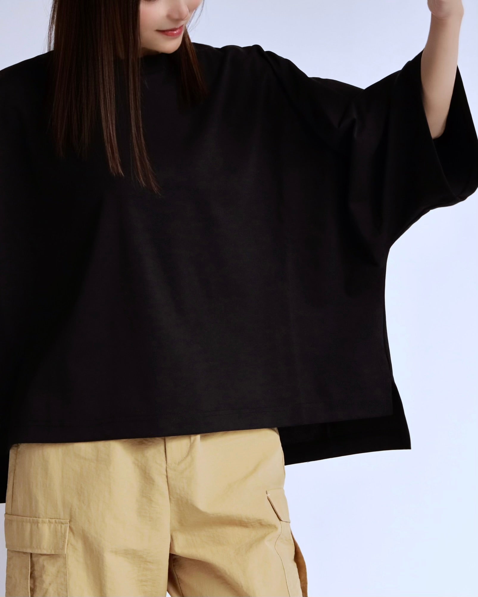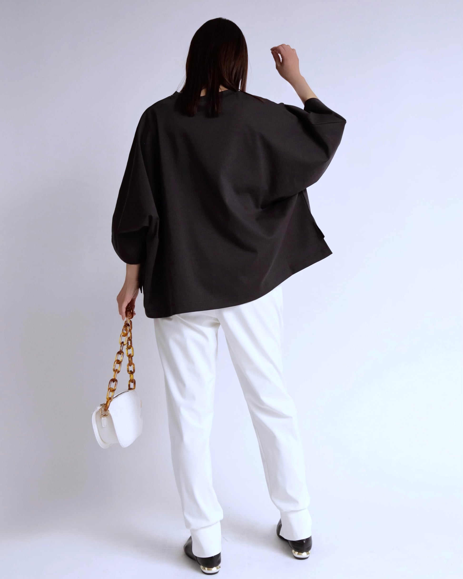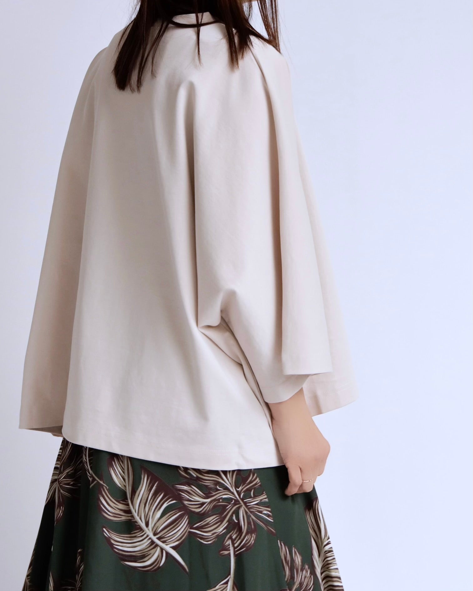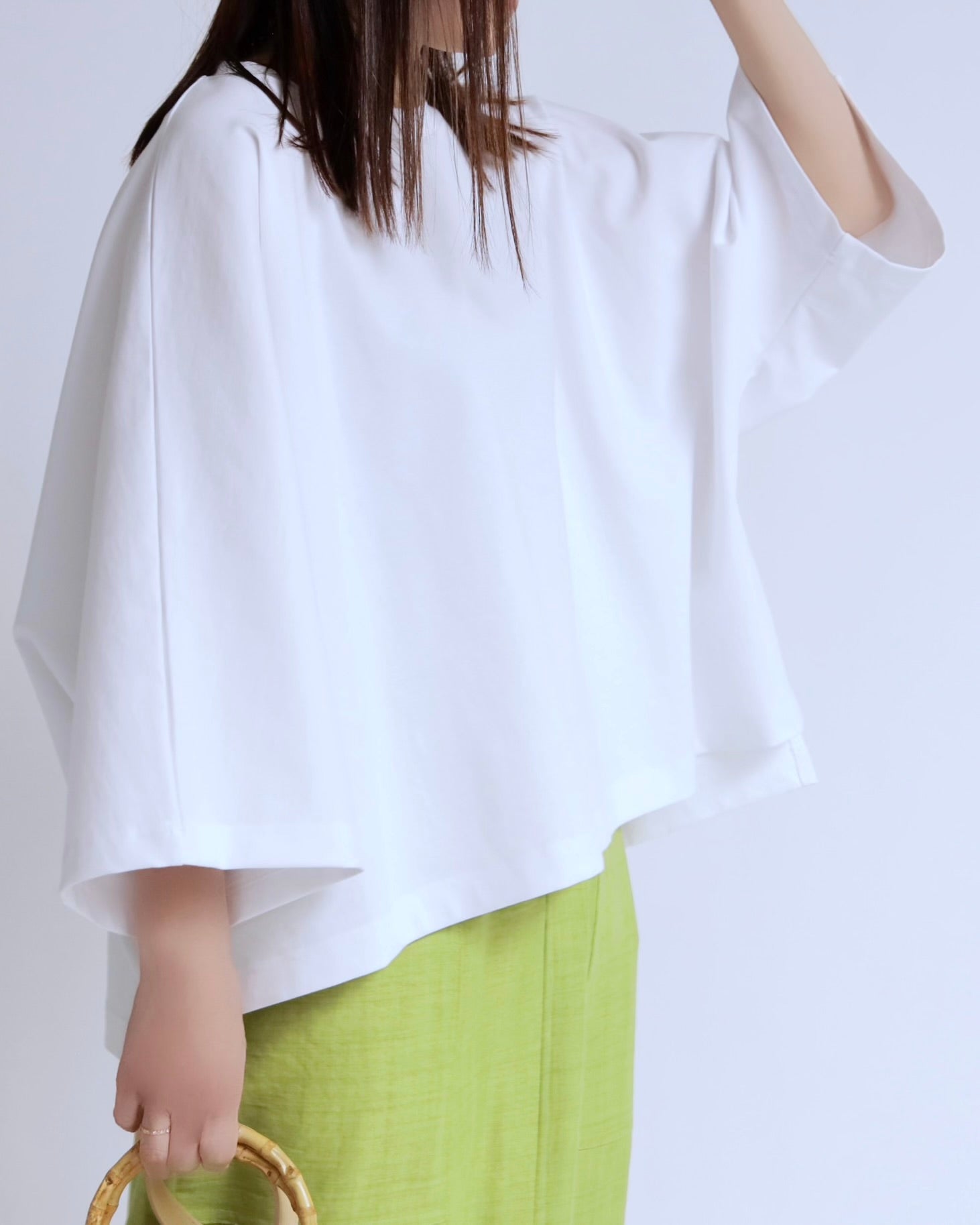 身体のラインを拾わない、ゆったりとしたドルマンスリーブが魅力のミニマルトップス。