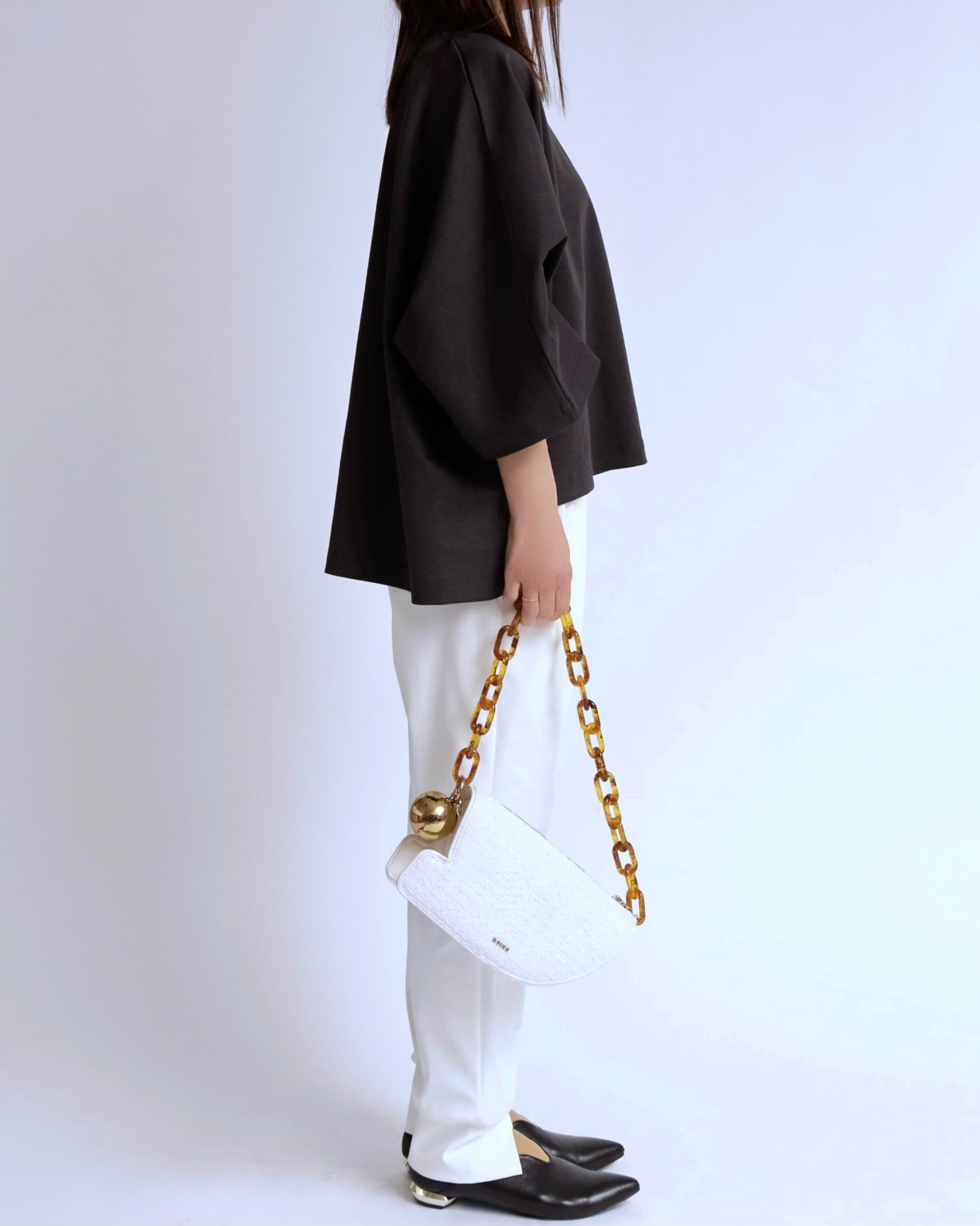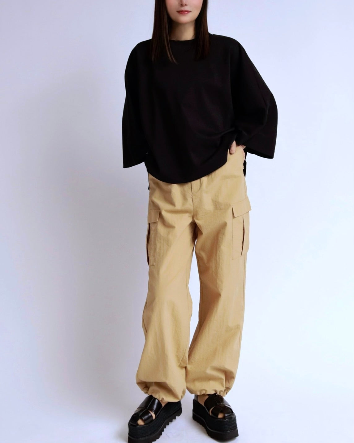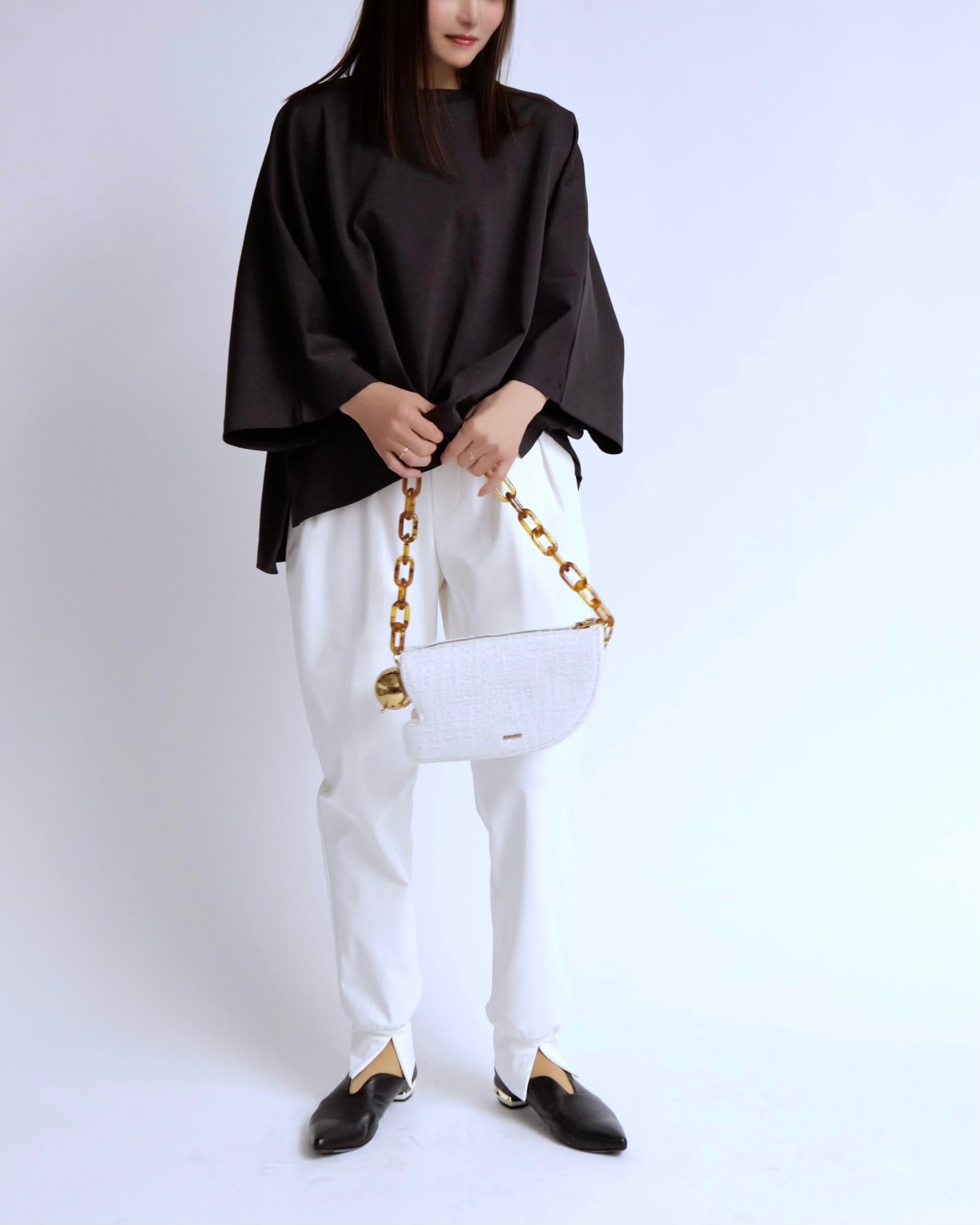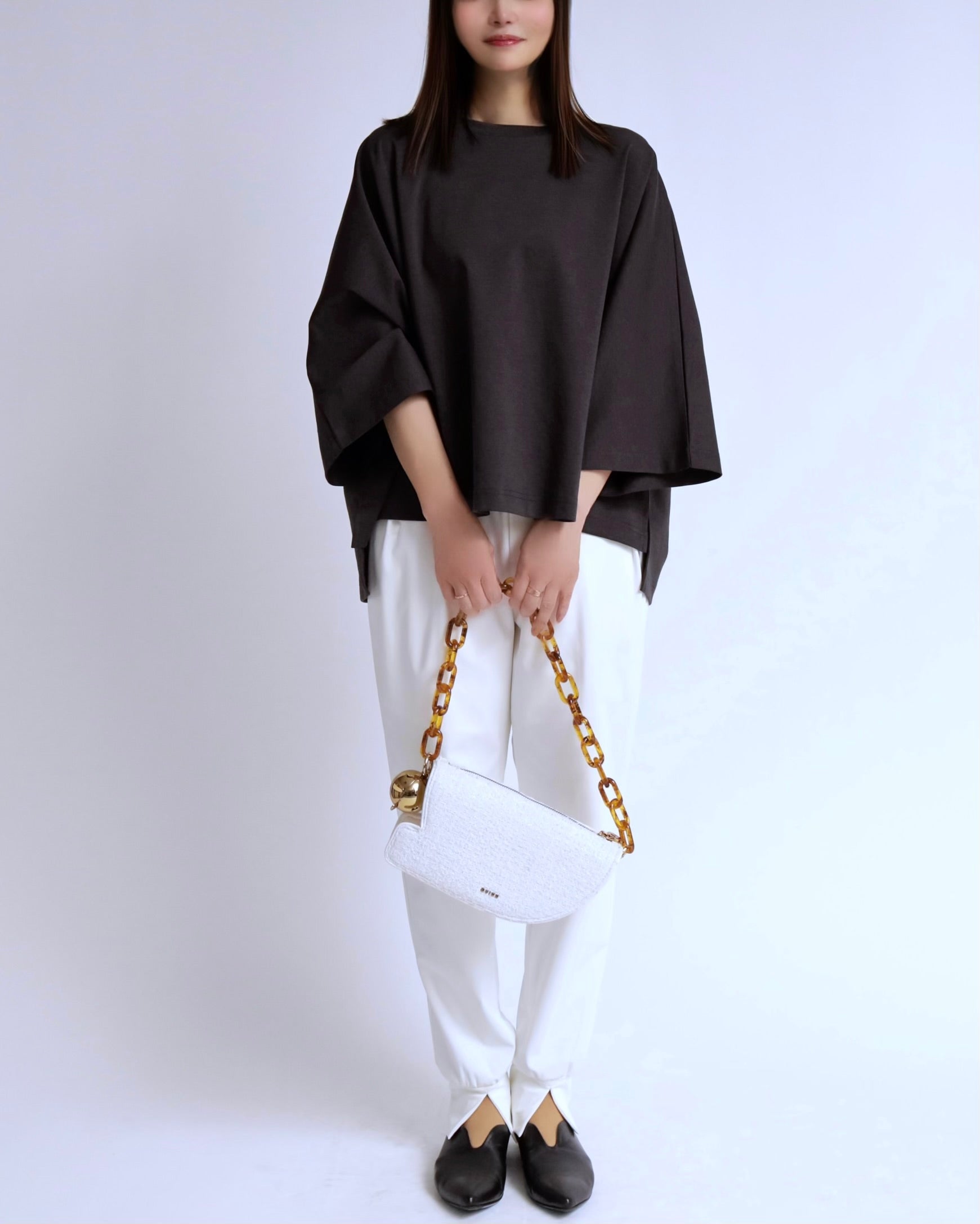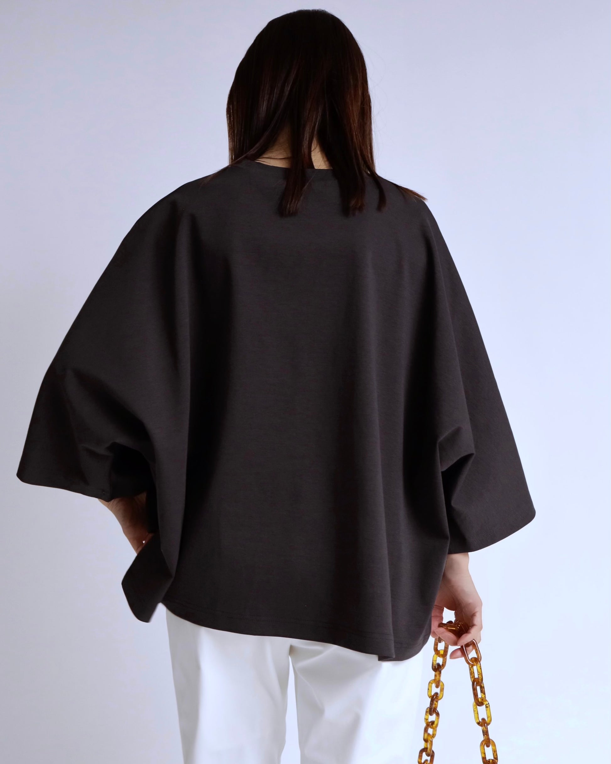 身体のラインを拾わない、ゆったりとしたドルマンスリーブが魅力のミニマルトップス。