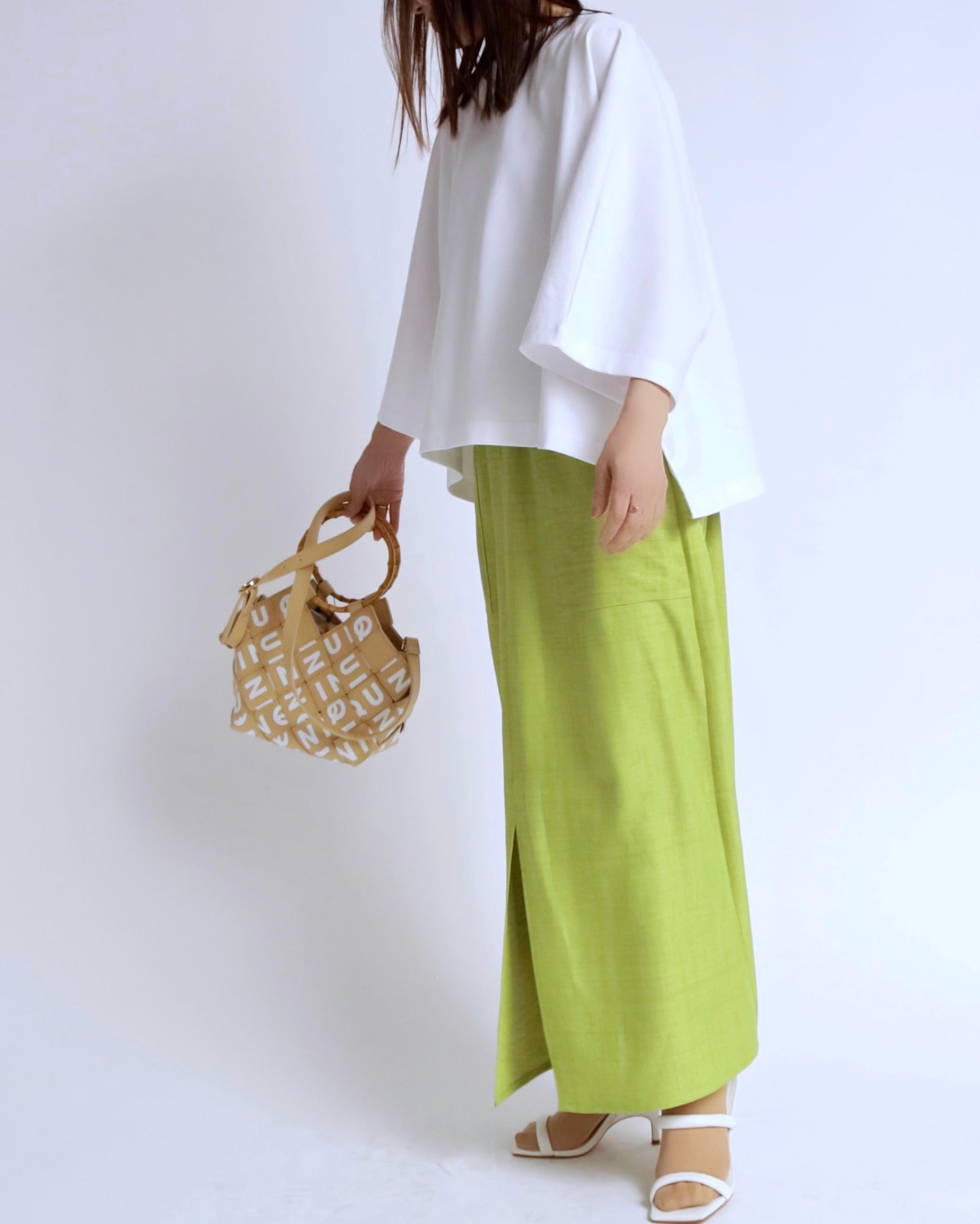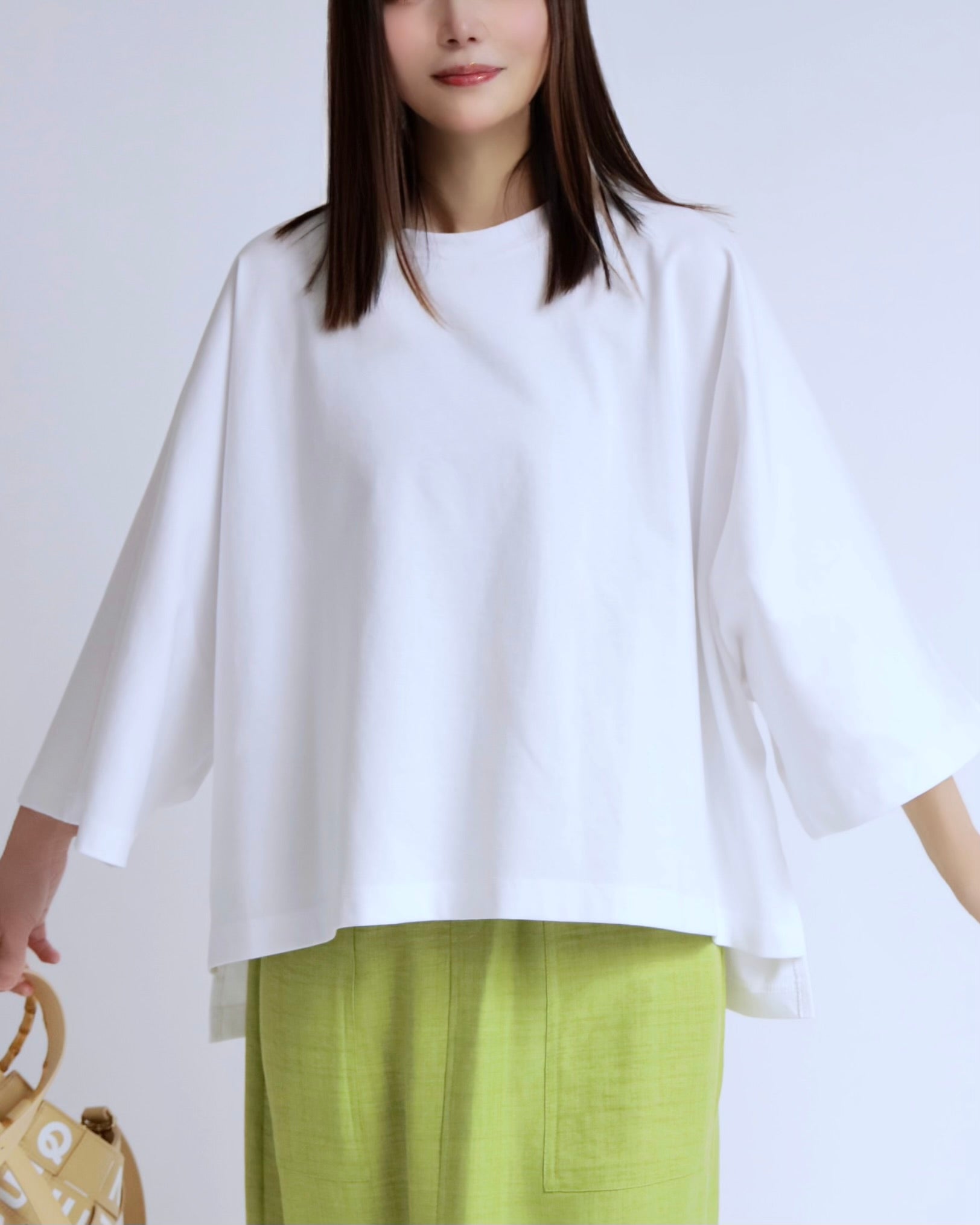 肘にかかる程よい袖丈と、前後差のある着丈バランスで、パンツにもスカートにも好相性。