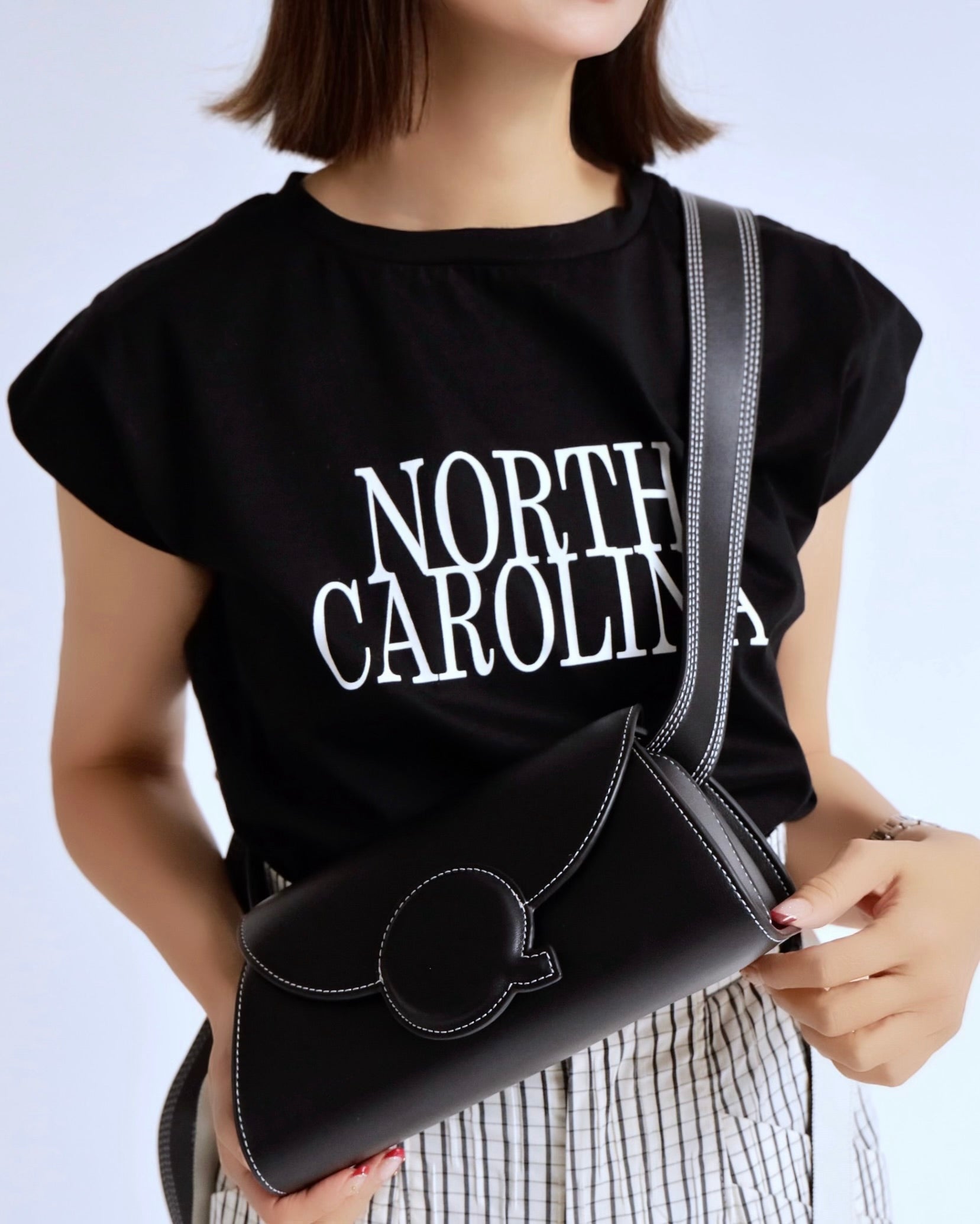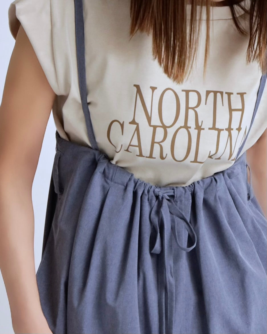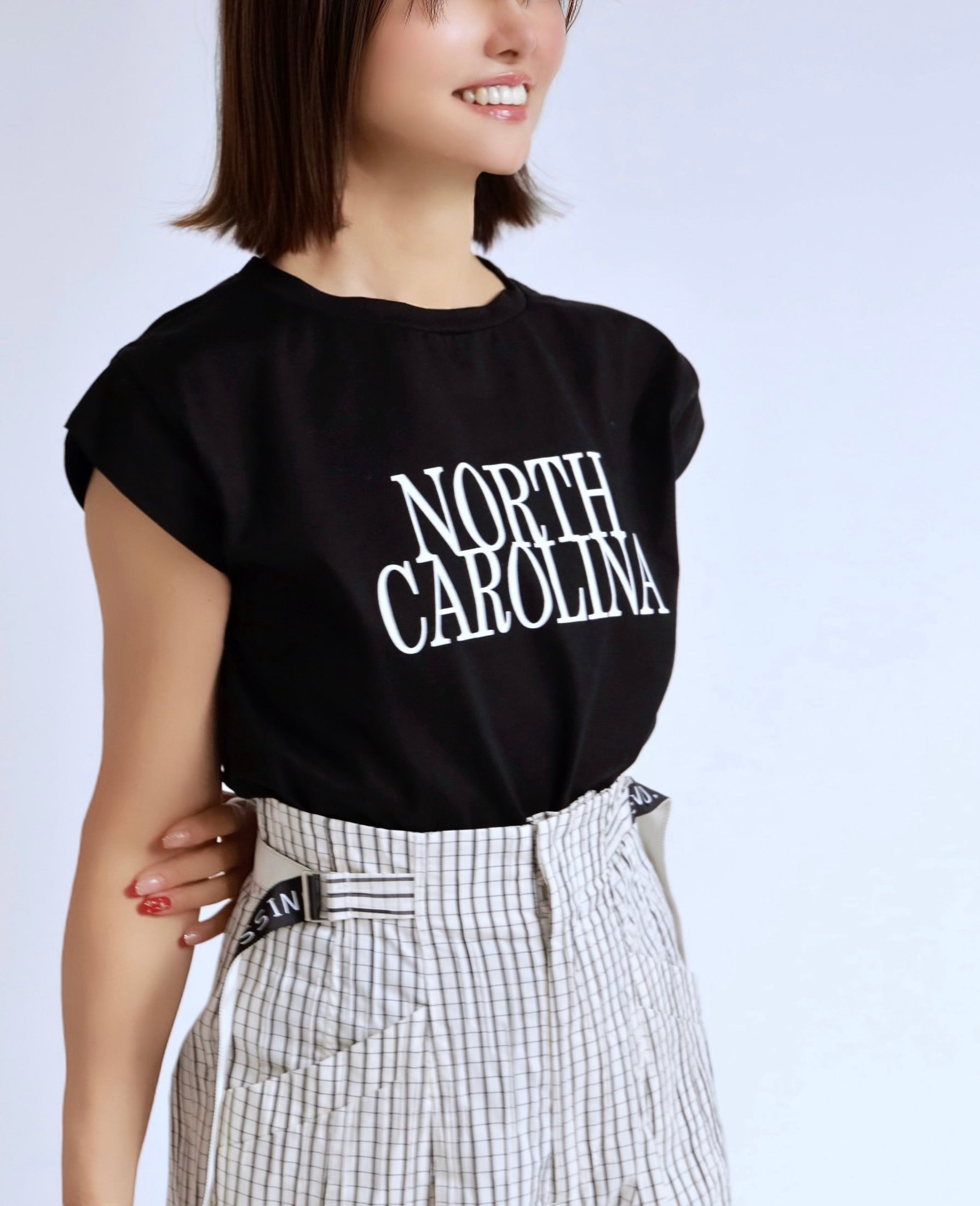 フロントの NORTH CAROLINA ロゴは主張しすぎないサイズ感とカラーで、スラックスやスカート、サロペットのインナーにも好相性。