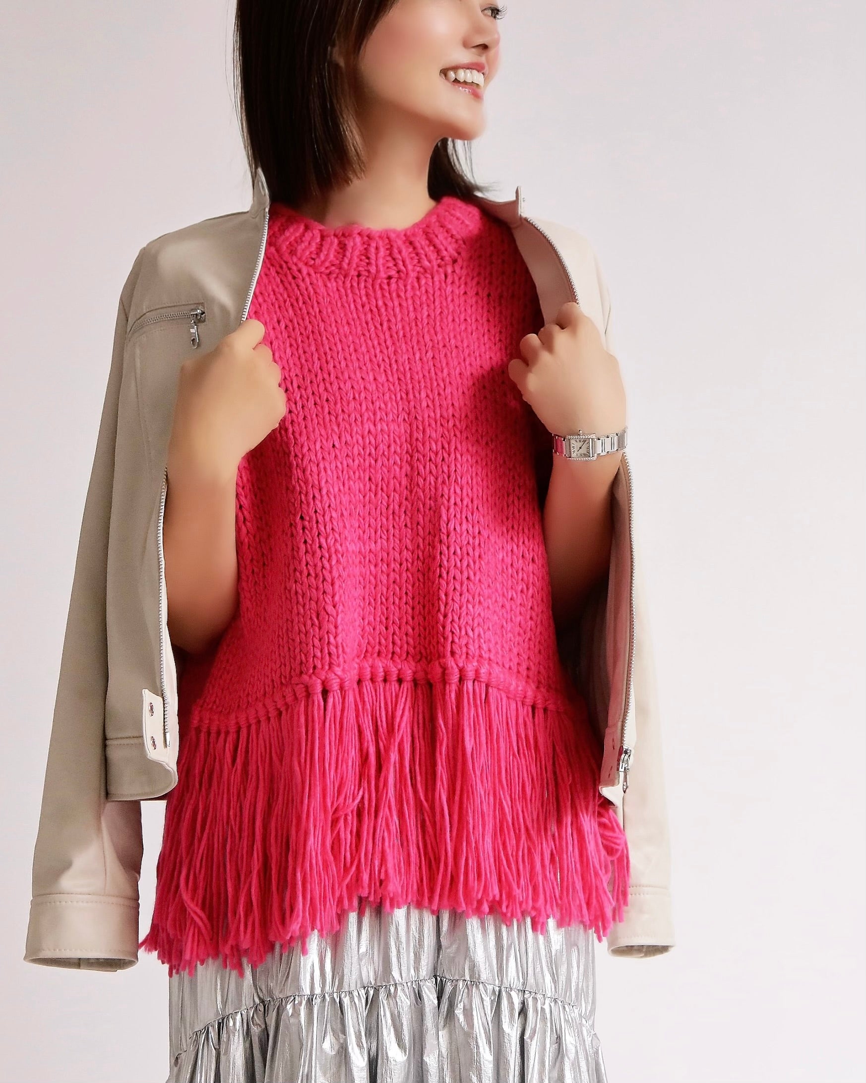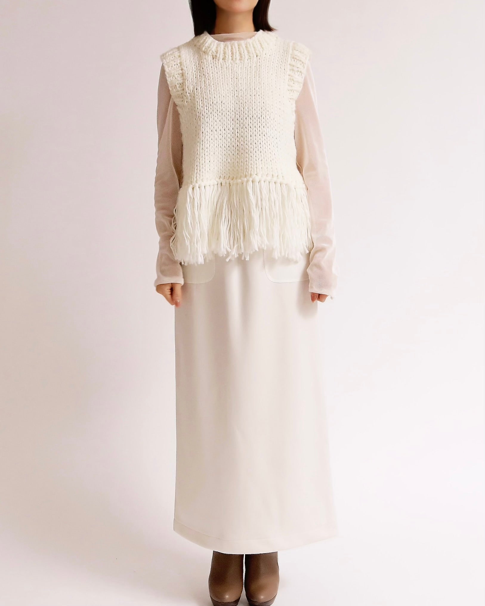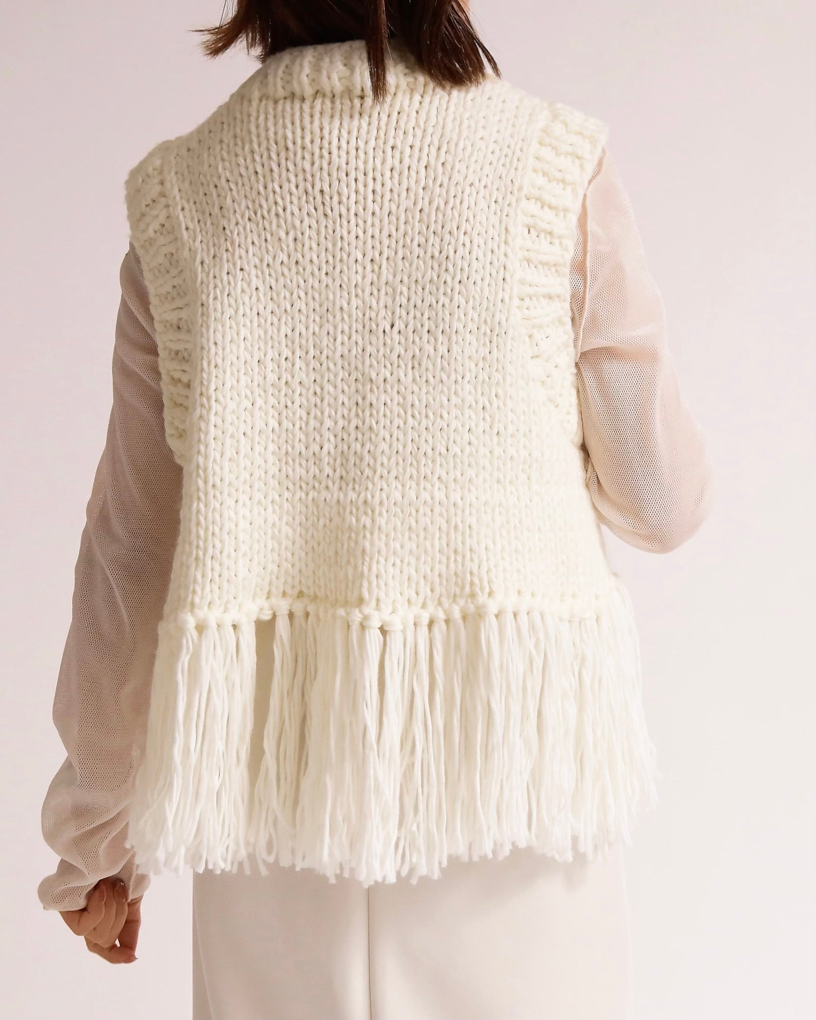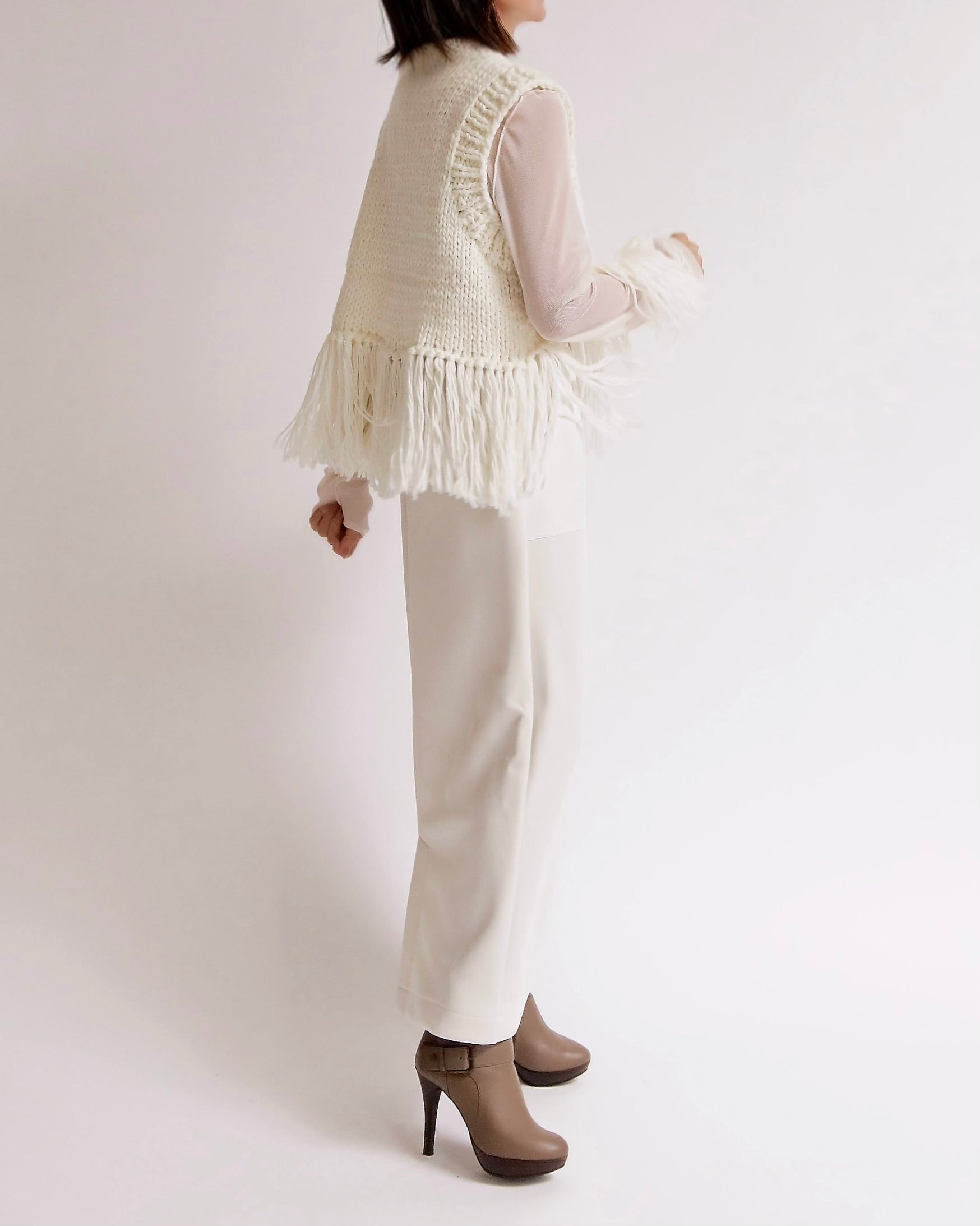 ざっくりと編み上げたハンドニットに、動きのあるフリンジを大胆にあしらったベスト。