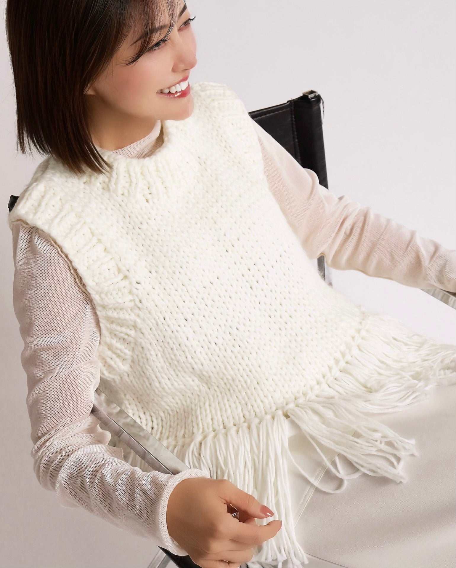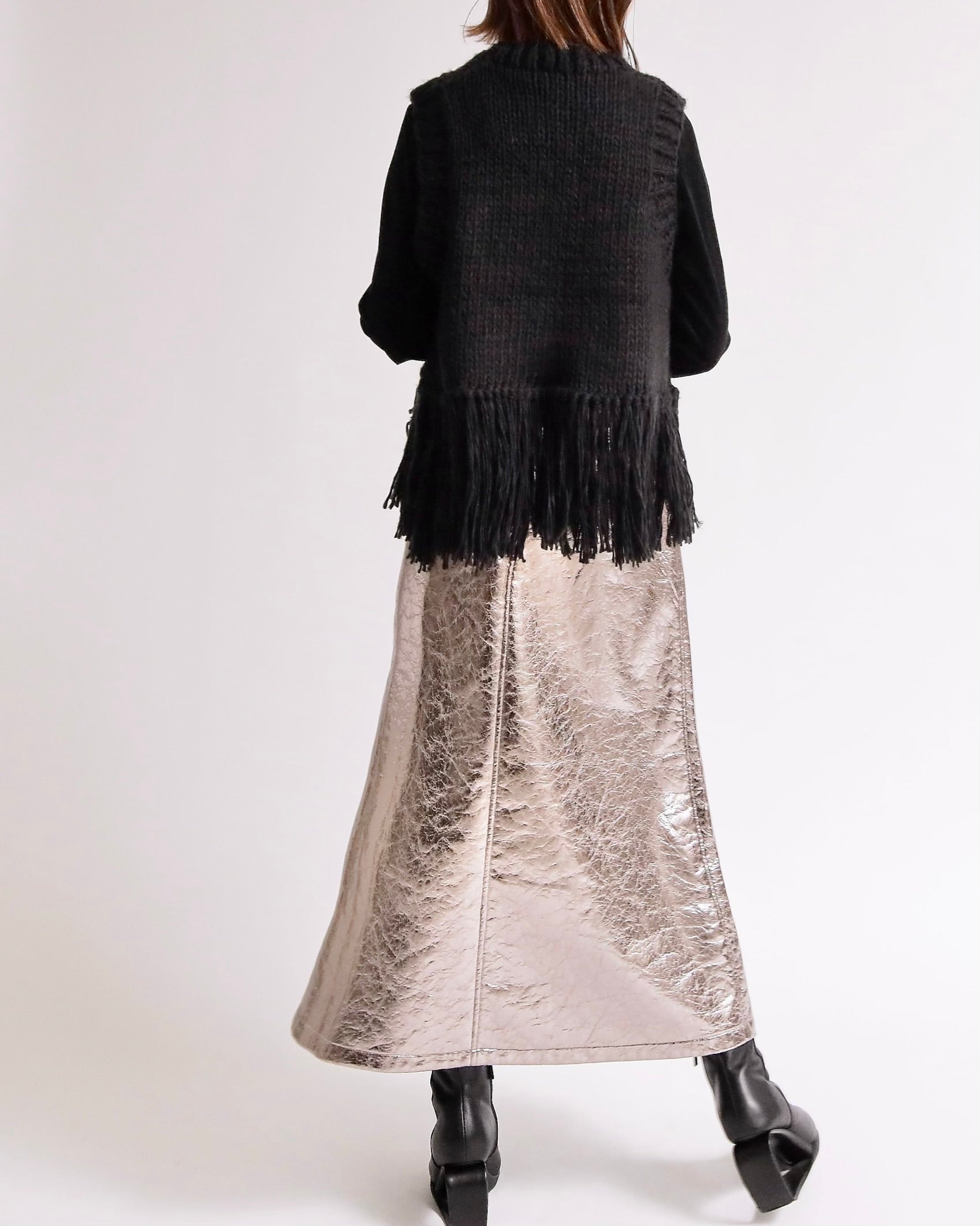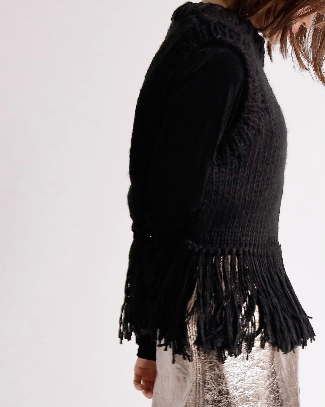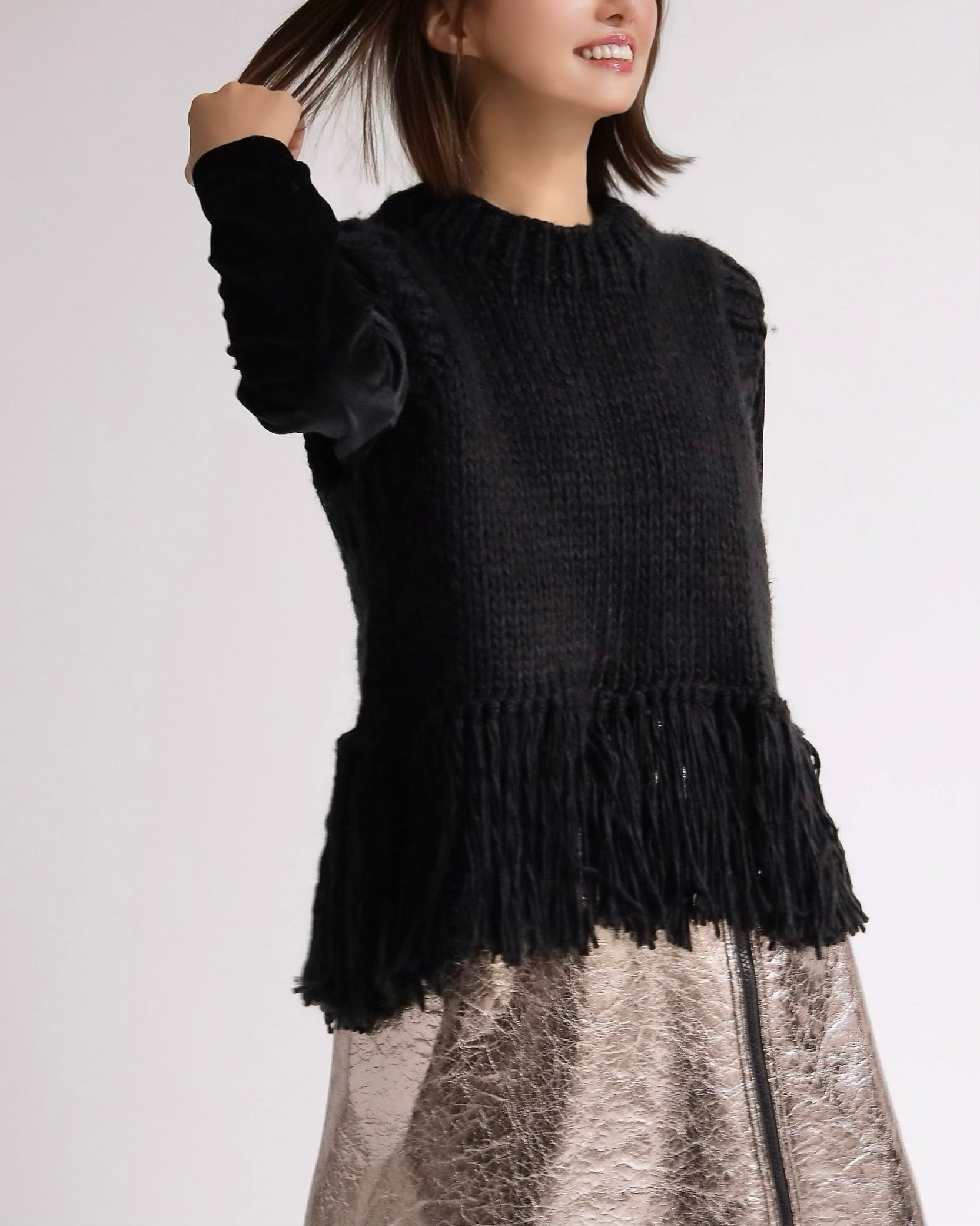 ざっくりと編み上げたハンドニットに、動きのあるフリンジを大胆にあしらったベスト。
