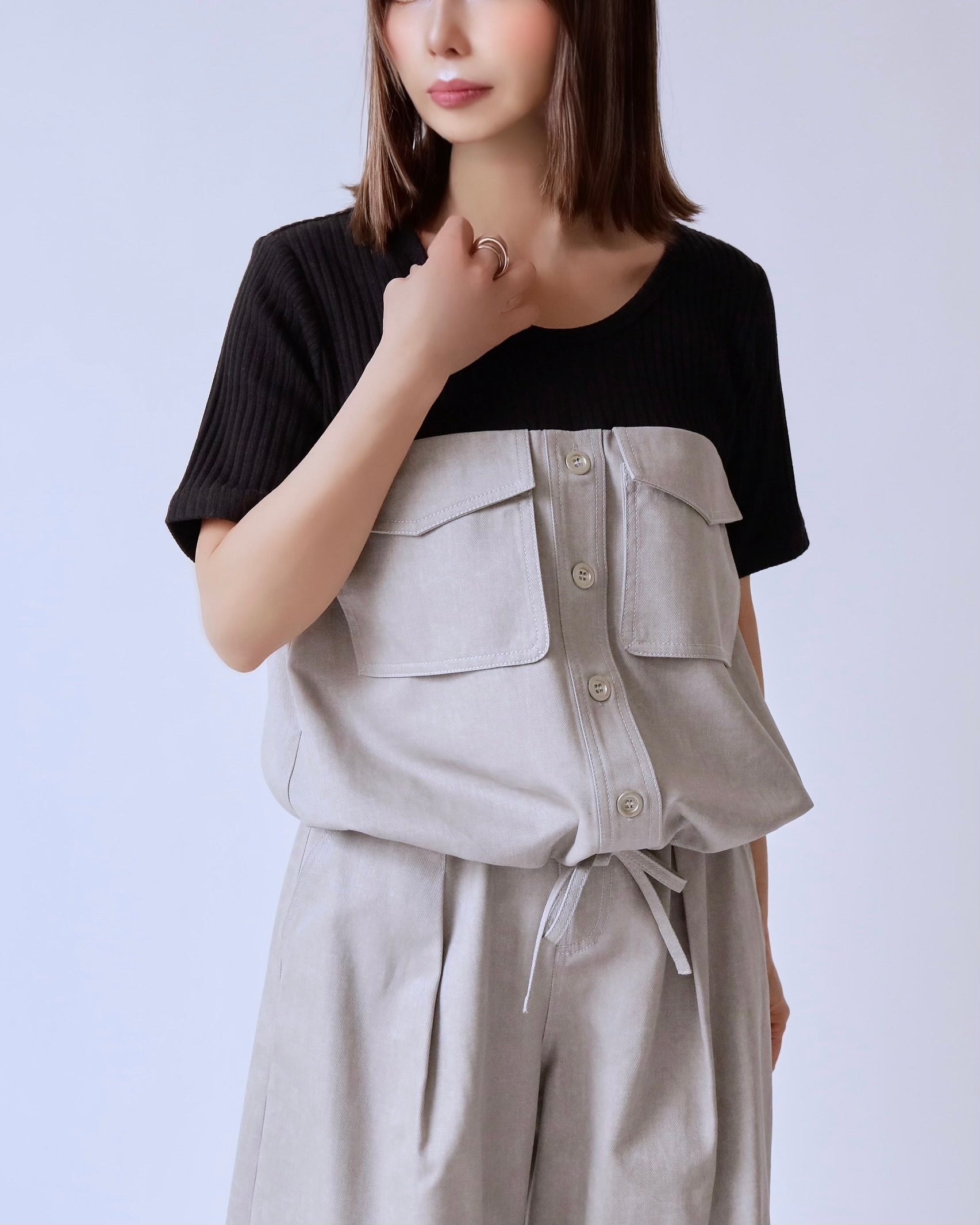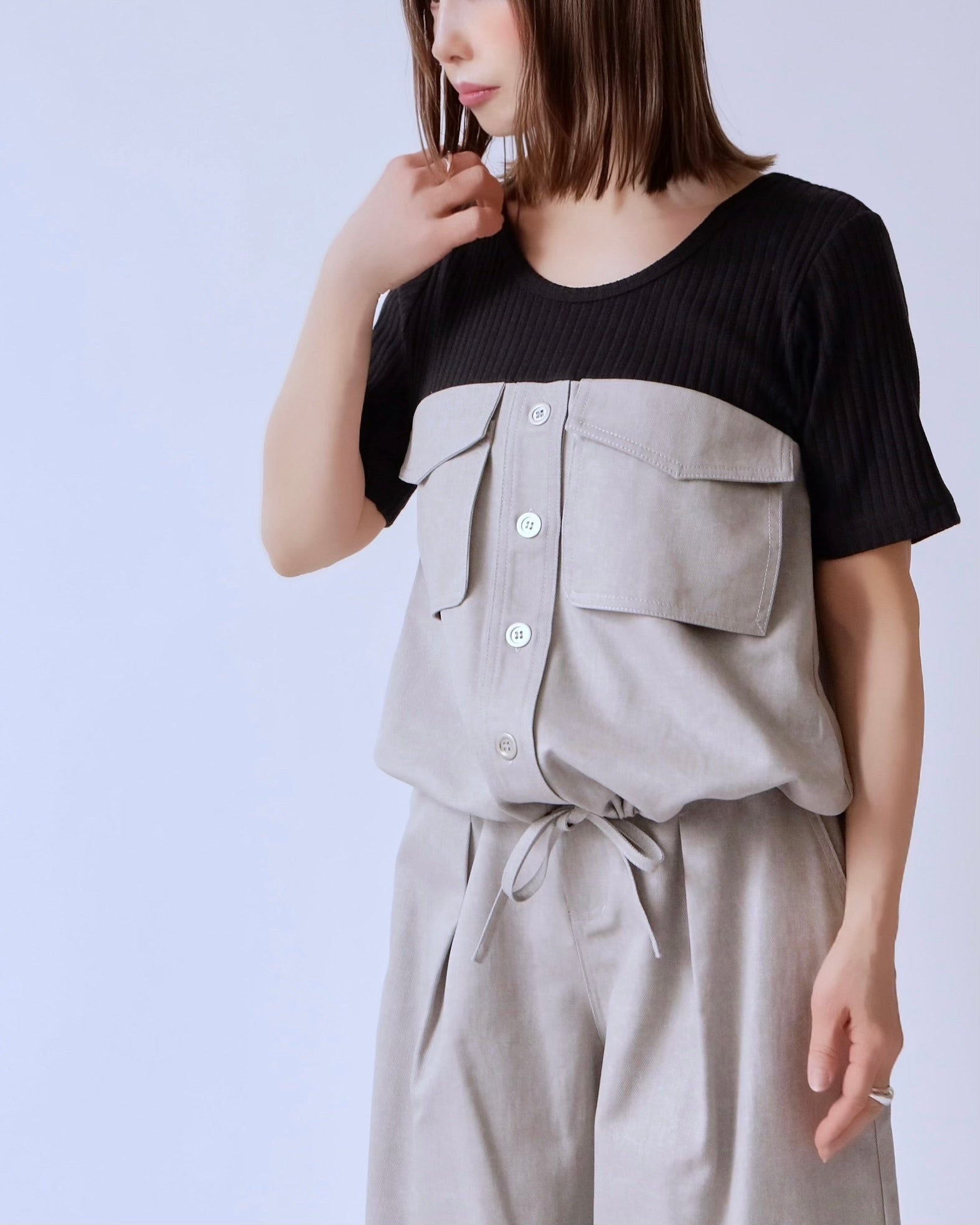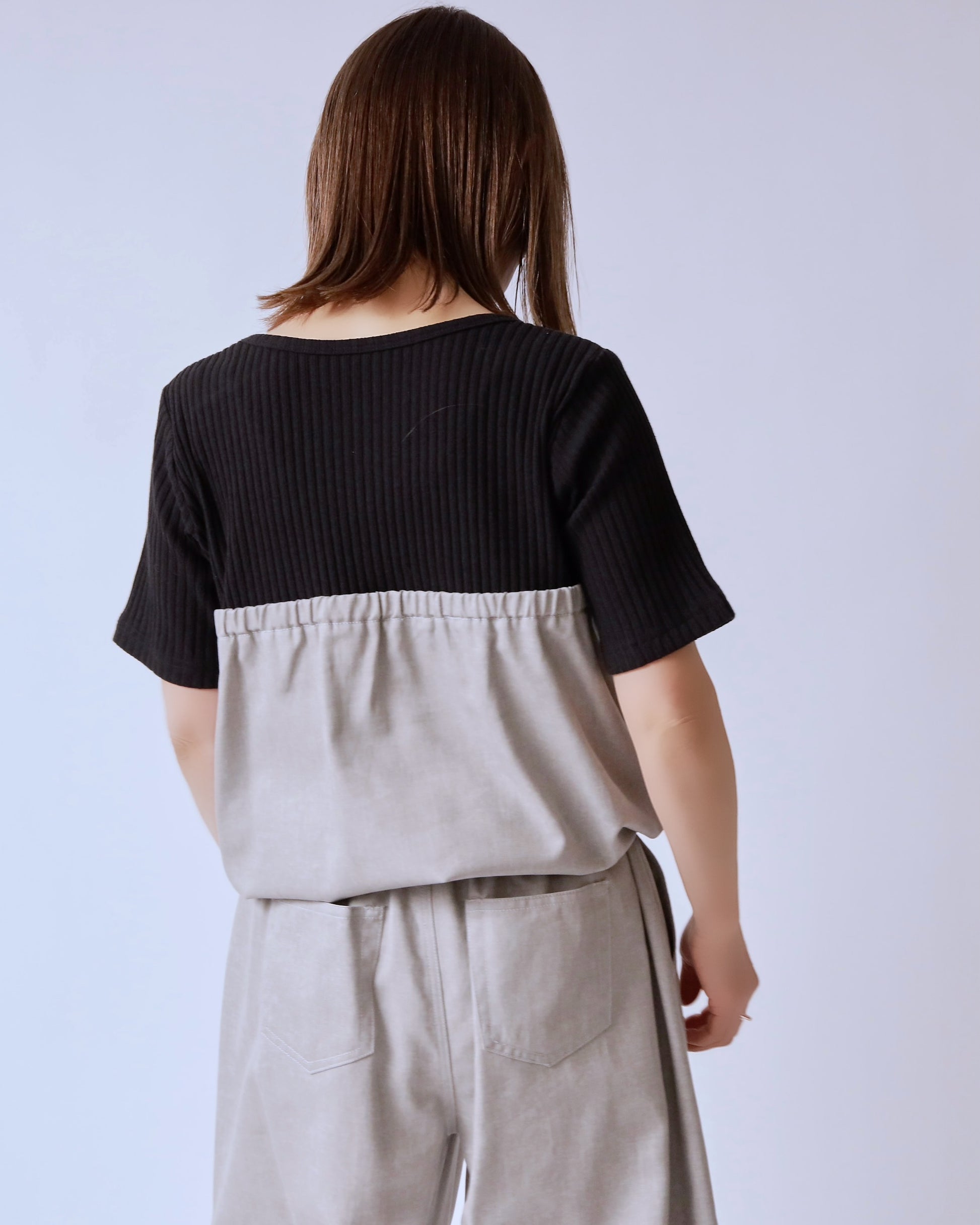 リブカットソーと布帛素材をドッキングした、異素材コンビネーショントップ。