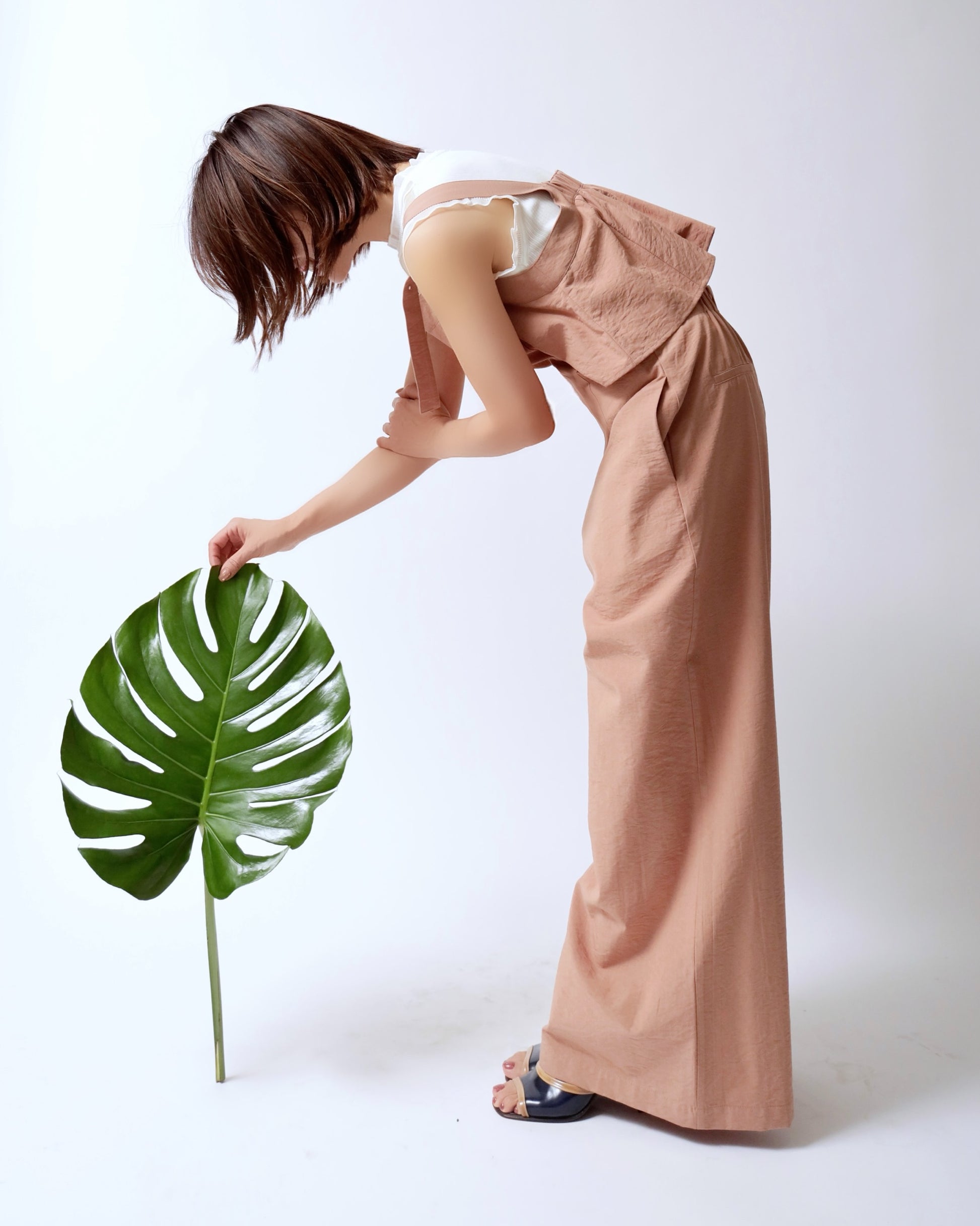 ワイドシルエットのパンツラインは身体のラインを拾いにくく、リラックス感がありながらも縦のラインを強調し、すっきりとした印象に。
