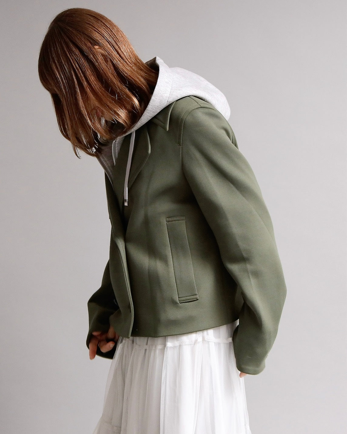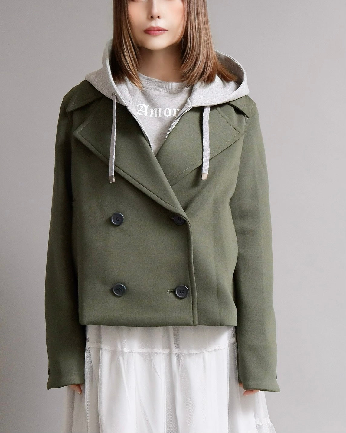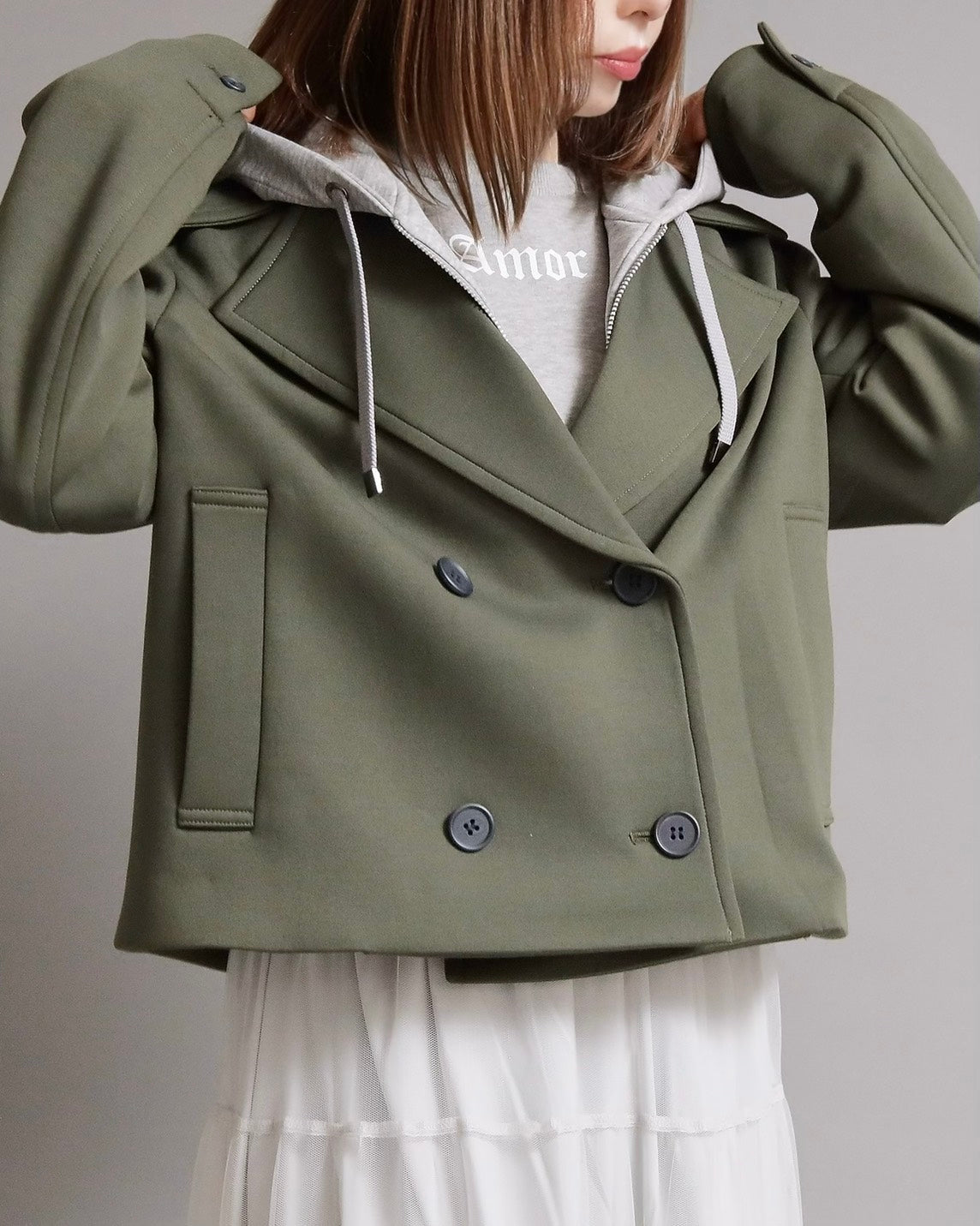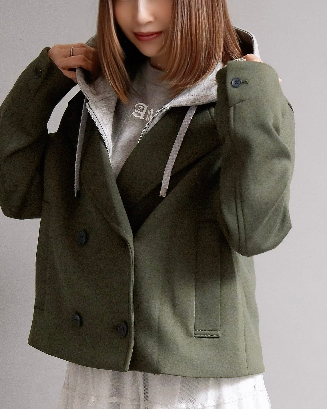 フード付きのカジュアル感と、ショートジャケットのきちんと感を一枚で楽しめる2WAYデザイン。フード部分は 取り外し可能 なので、その日の気分やコーディネートに合わせて表情を変えられます。
