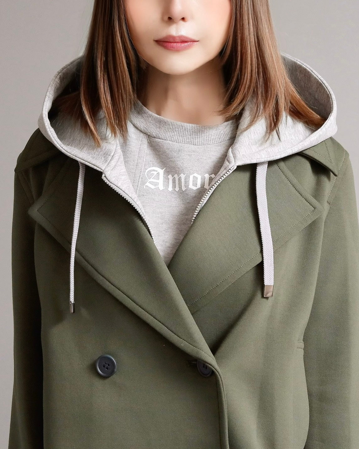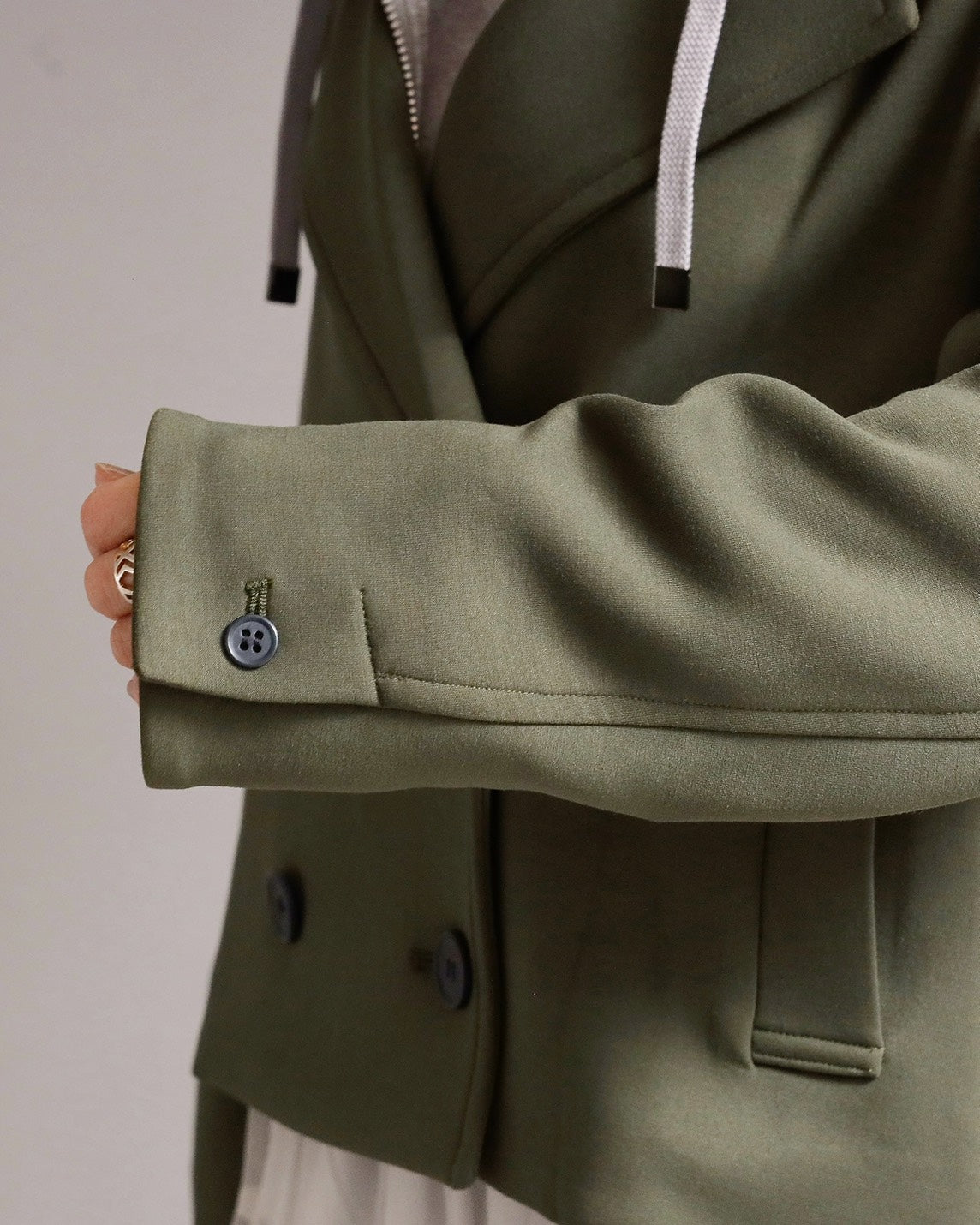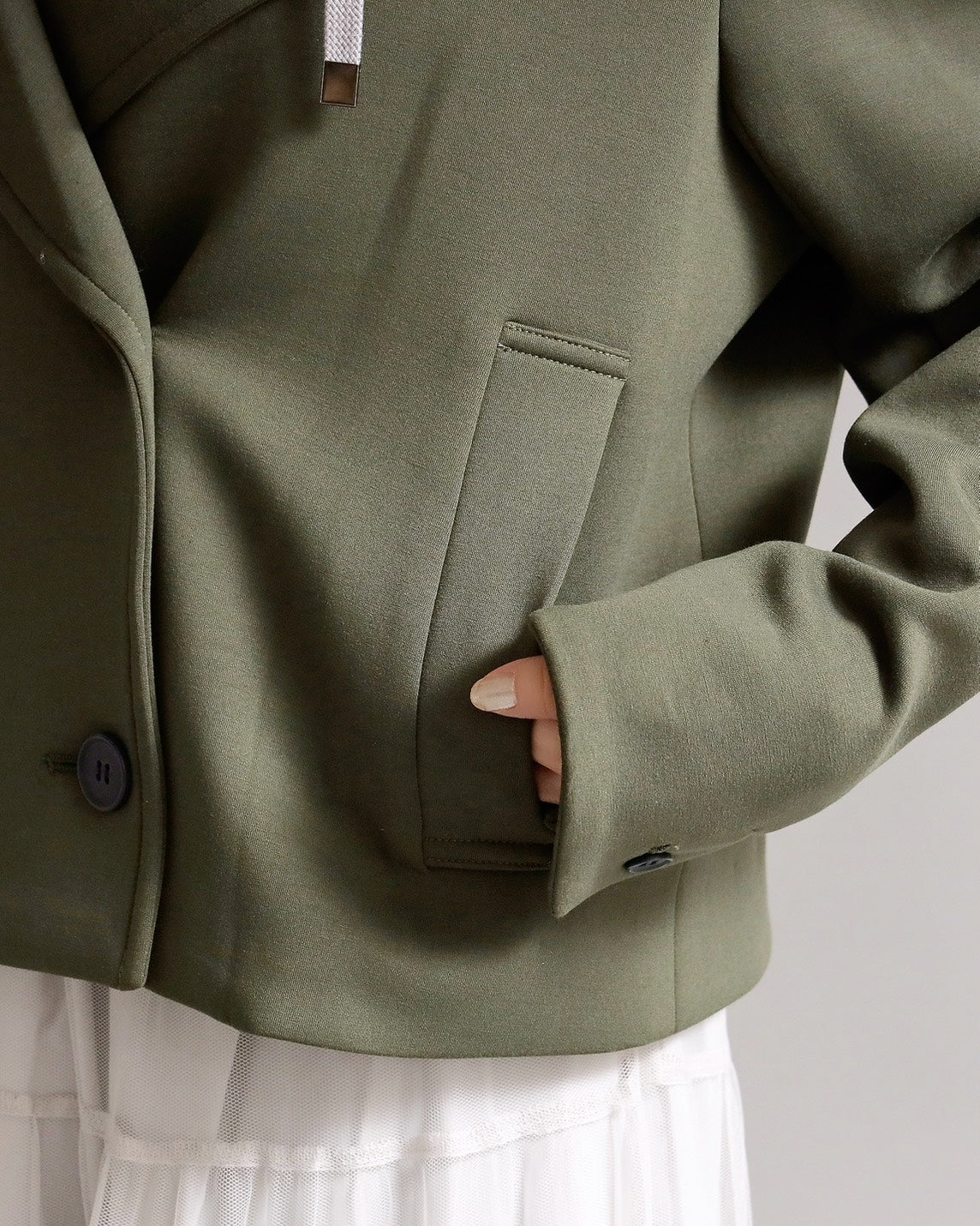 フード付きのカジュアル感と、ショートジャケットのきちんと感を一枚で楽しめる2WAYデザイン。フード部分は 取り外し可能 なので、その日の気分やコーディネートに合わせて表情を変えられます。