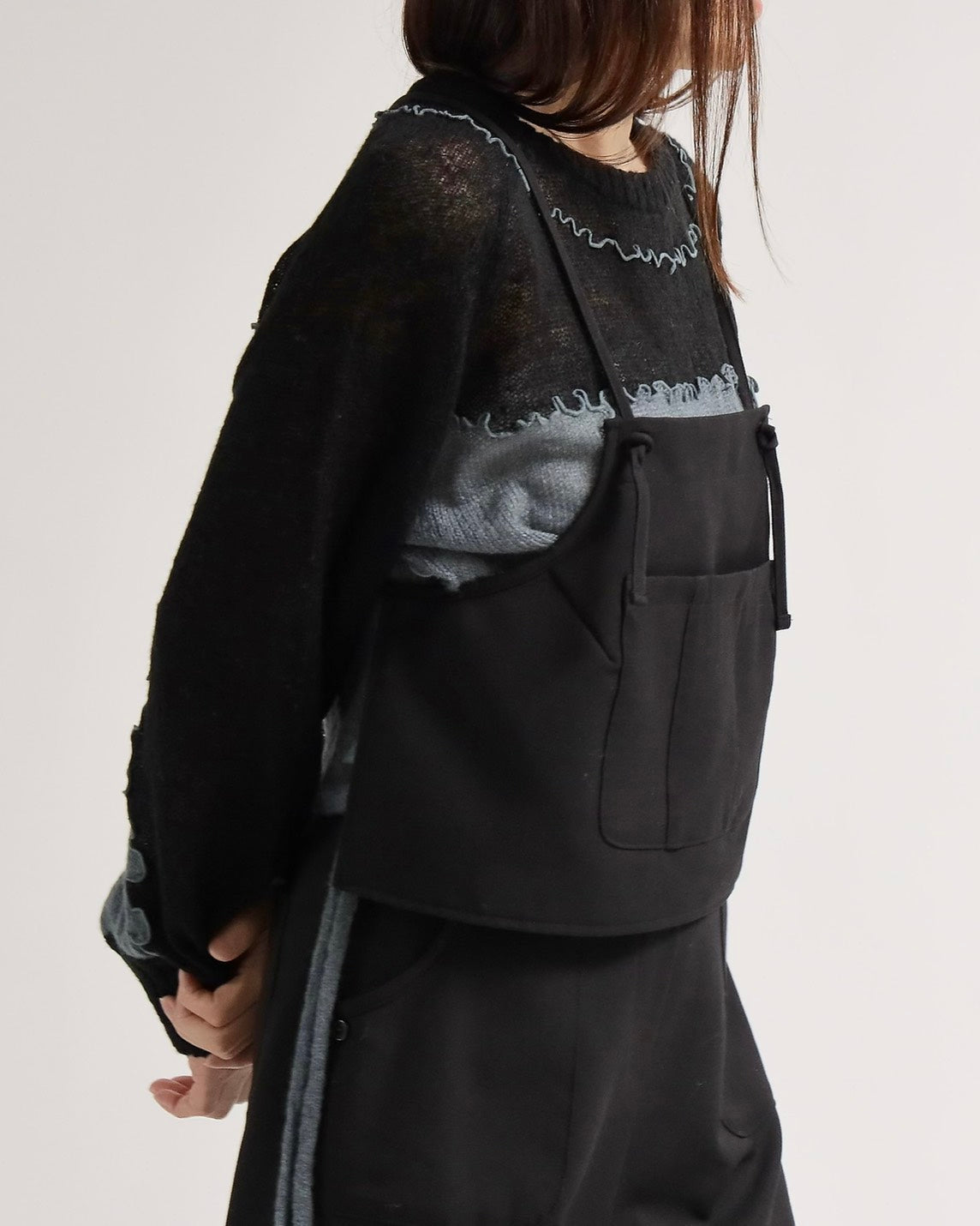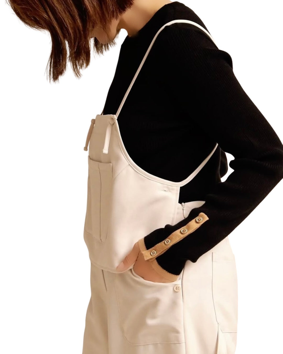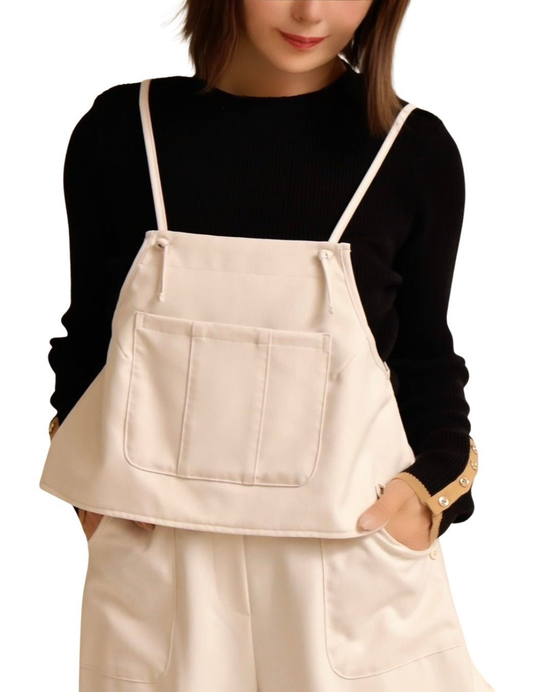 前身頃に大きなポケットを配したビスチェは、肩紐でトップスとして着用できるだけでなく、ボタンを外してエプロンのように腰に巻くアレンジも可能。