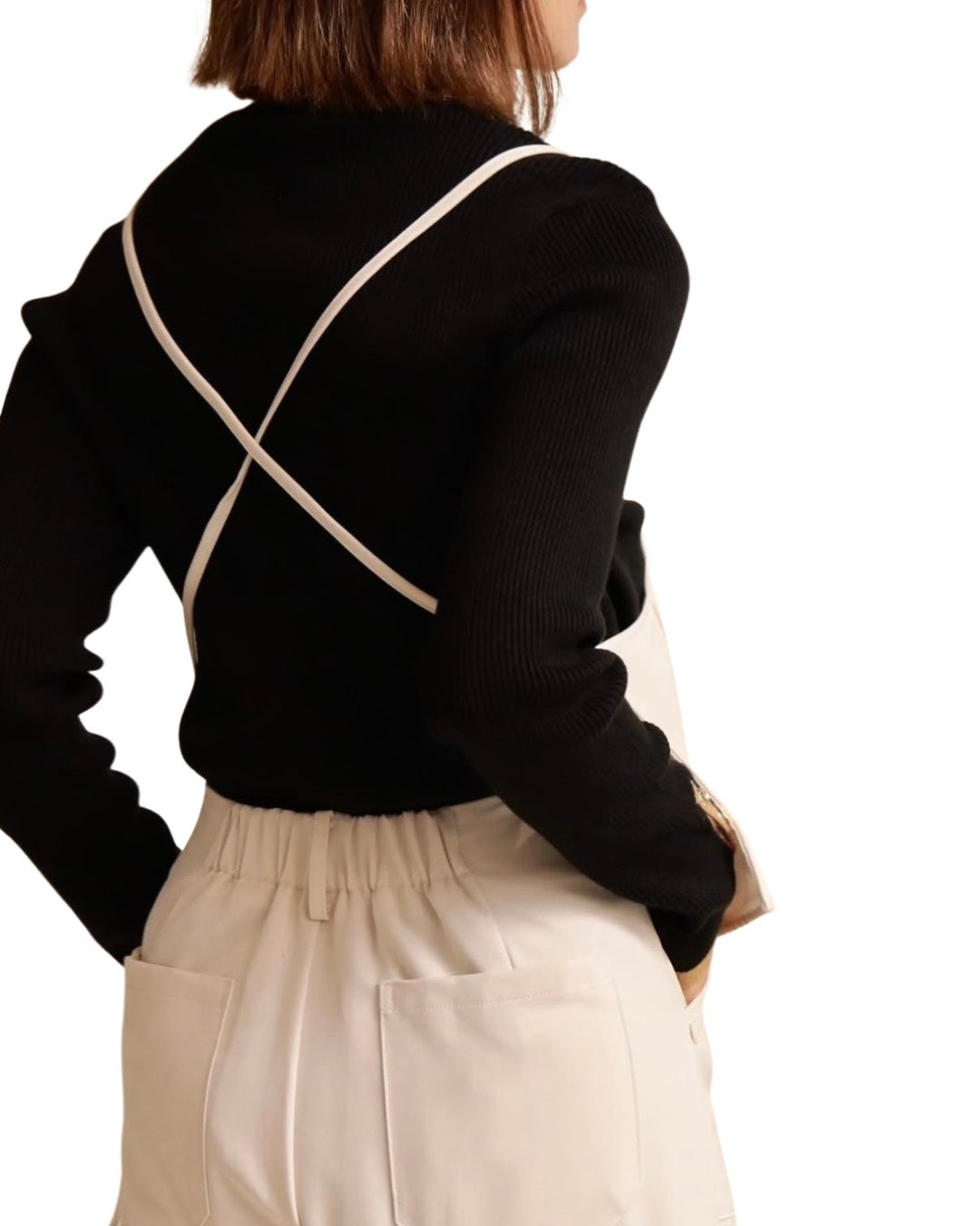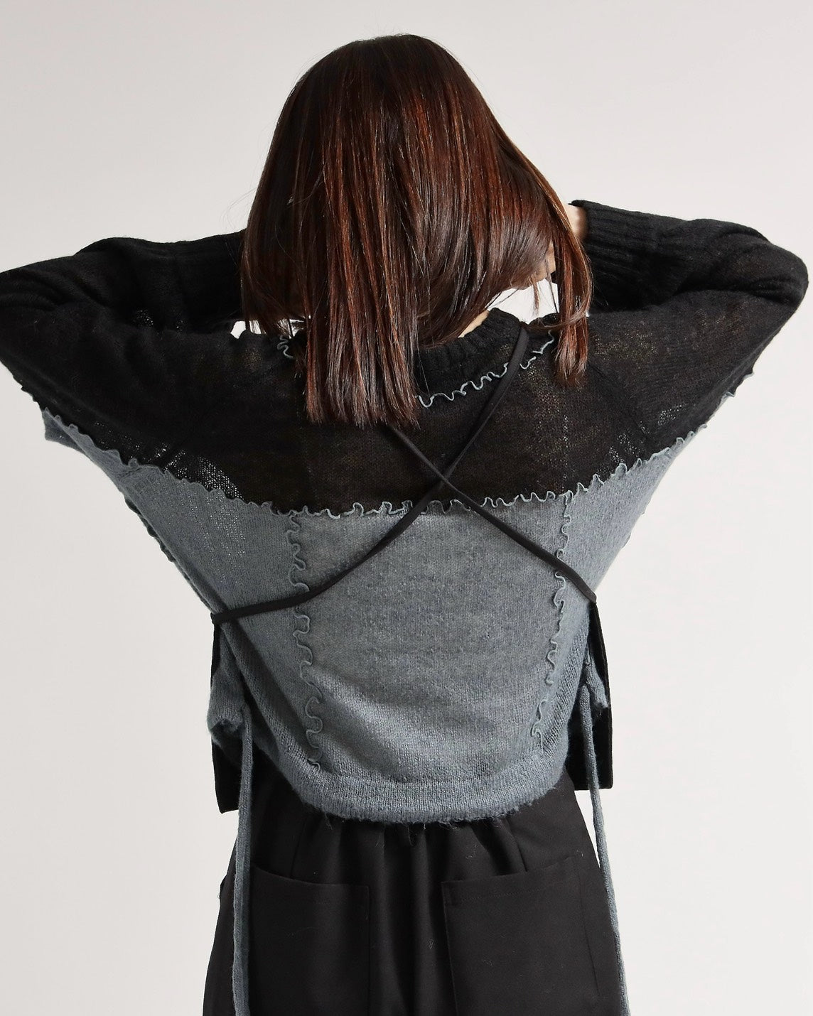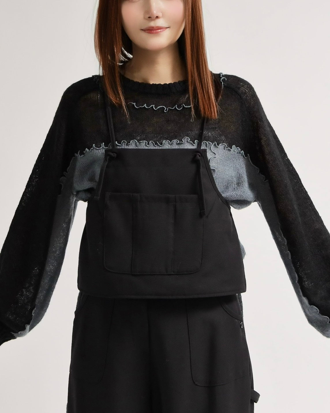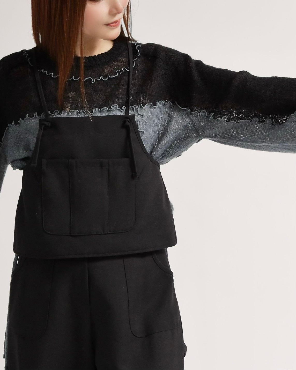 前身頃に大きなポケットを配したビスチェは、肩紐でトップスとして着用できるだけでなく、ボタンを外してエプロンのように腰に巻くアレンジも可能。