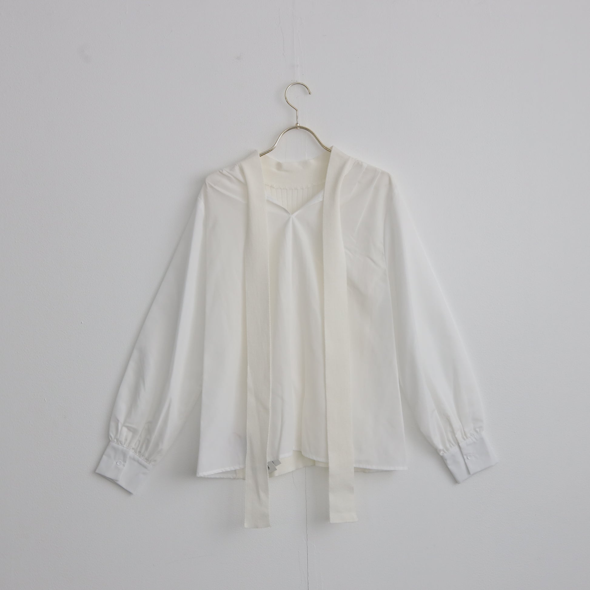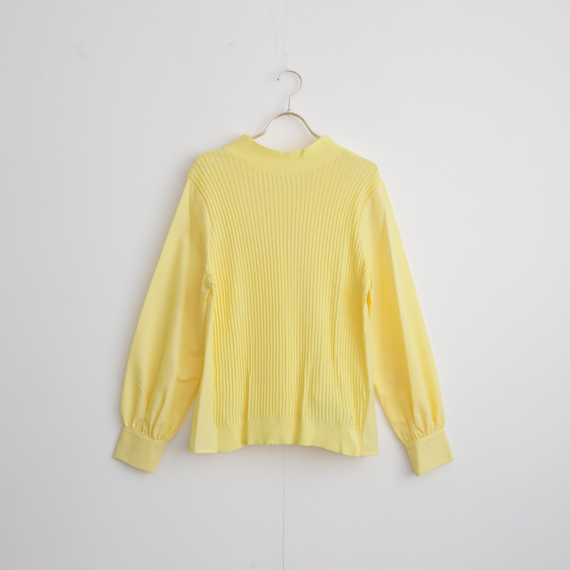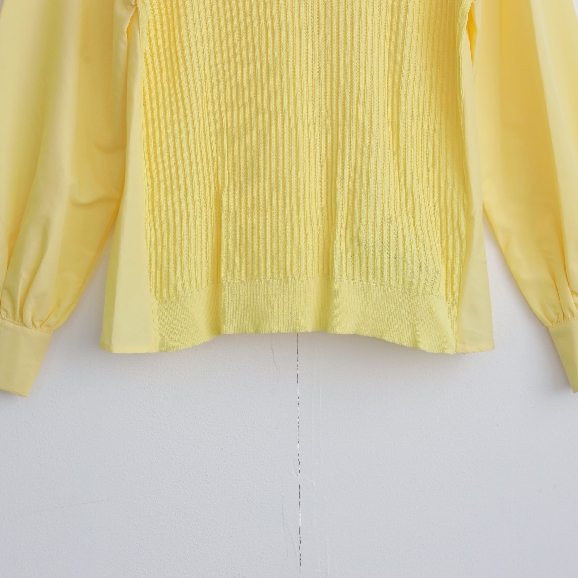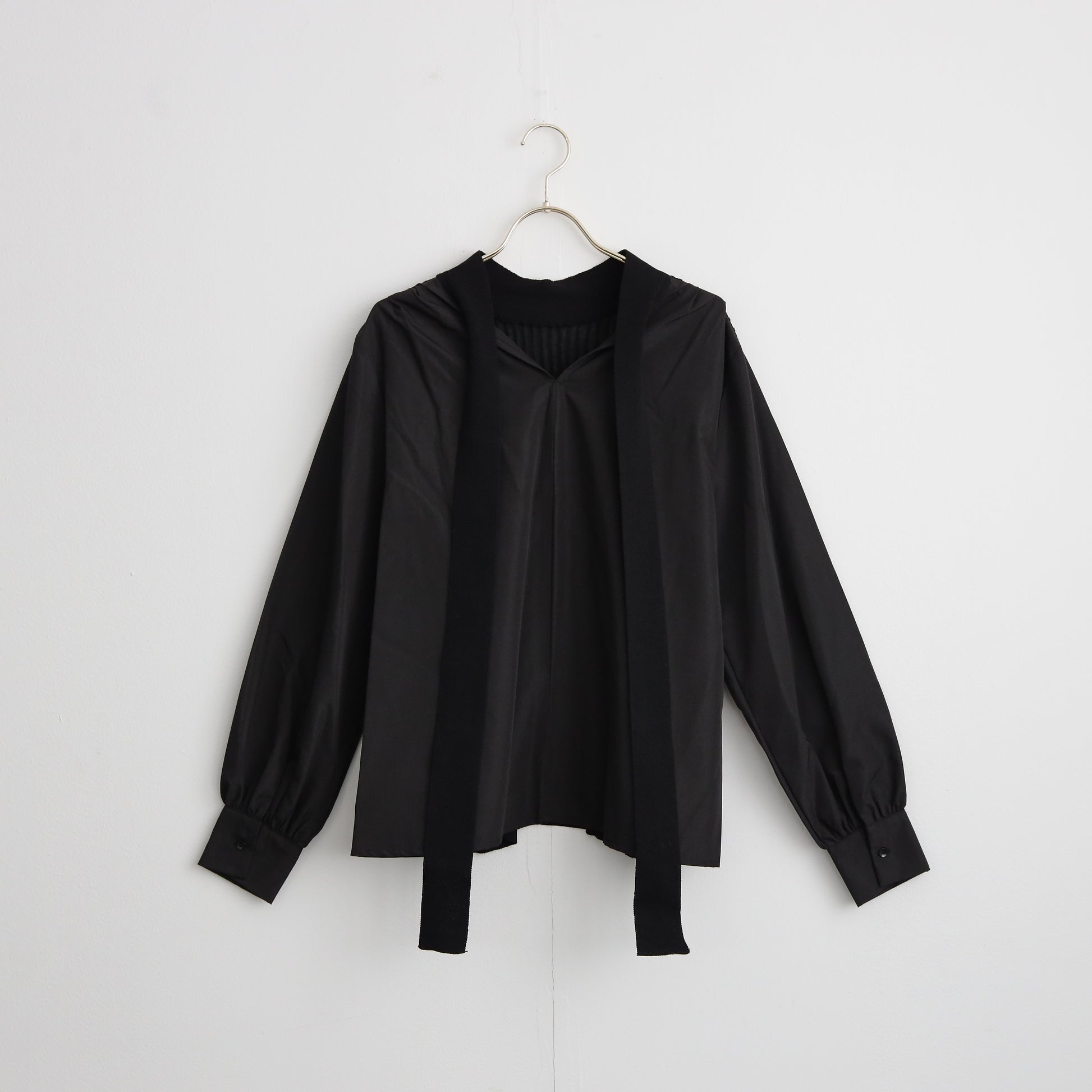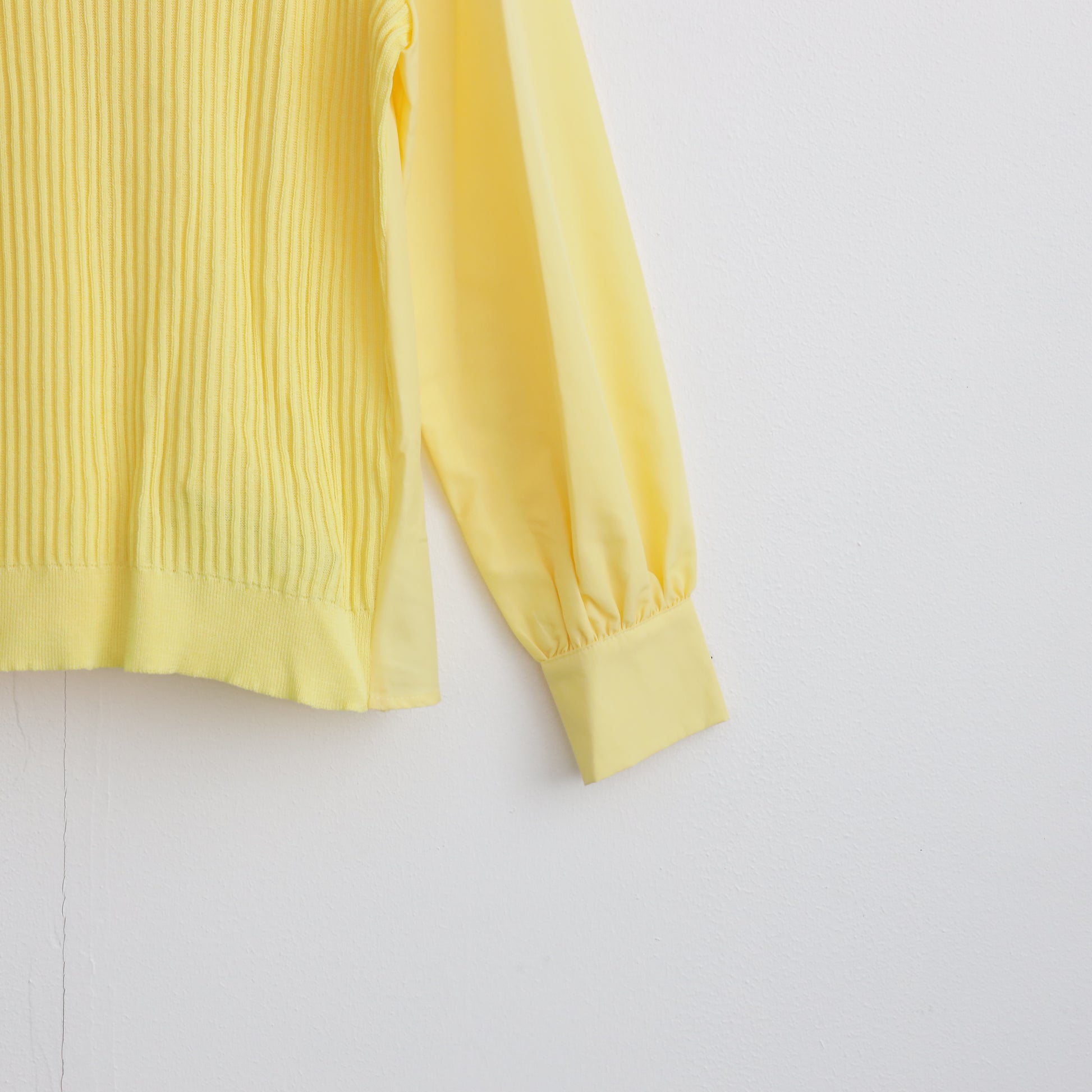 バックリボンデザインのプルオーバー。前身頃はリプニットで背面から袖にかけてはシャツの素材の異素材組み合わせ。後ろ襟元に大きめのリボンがついているので、後ろ姿に華やかさを演出してくれます。