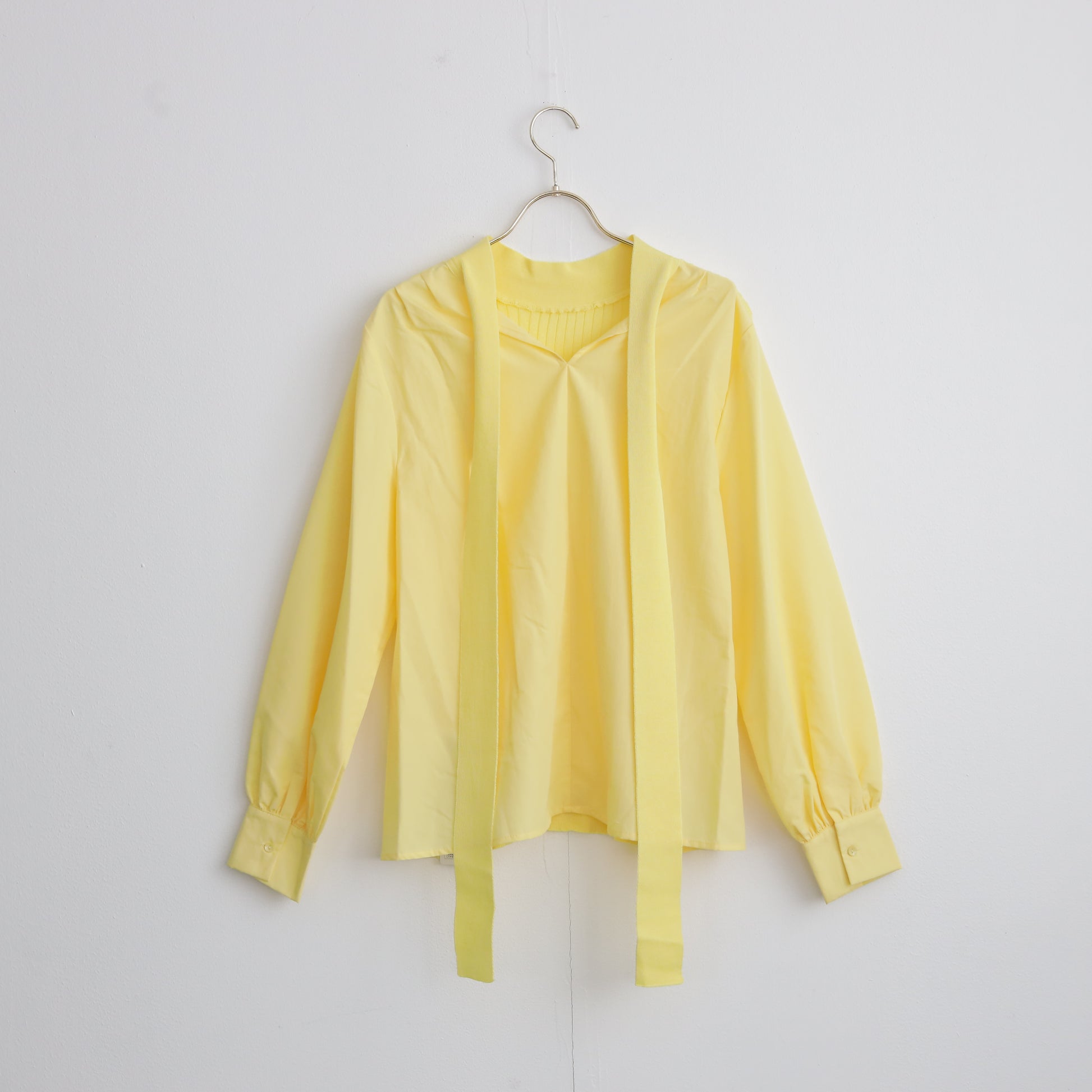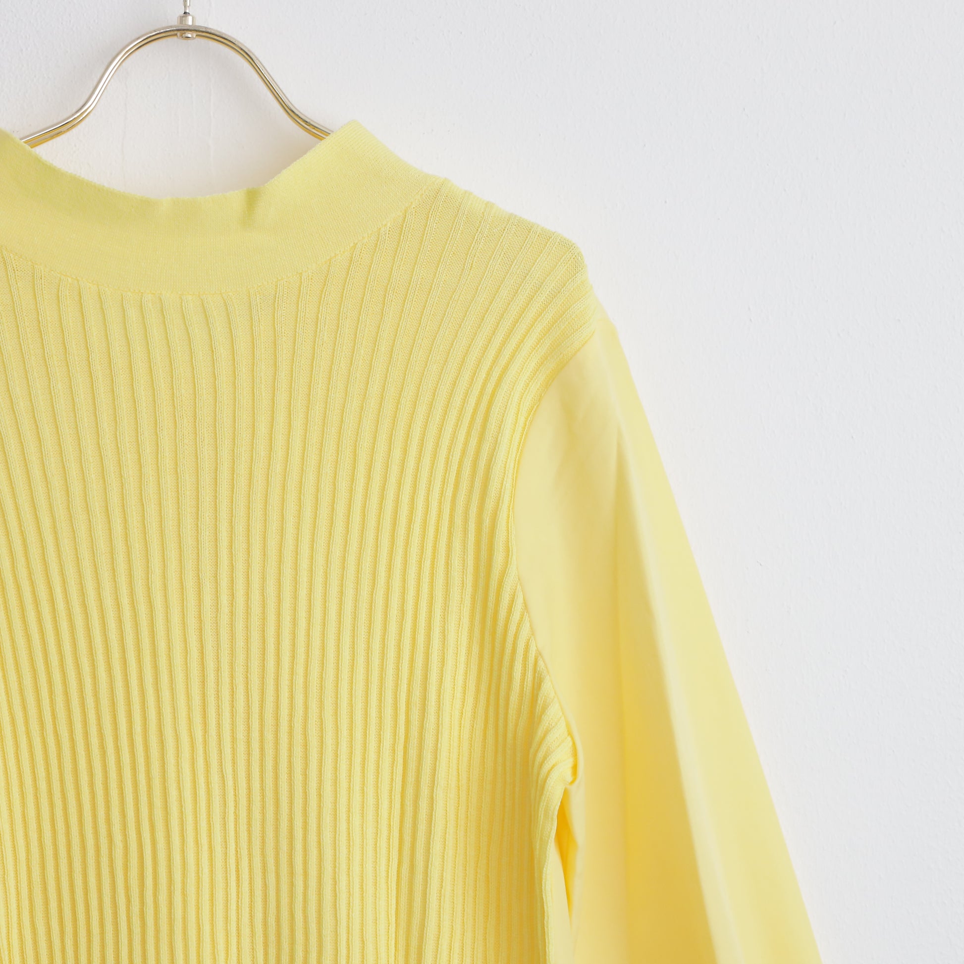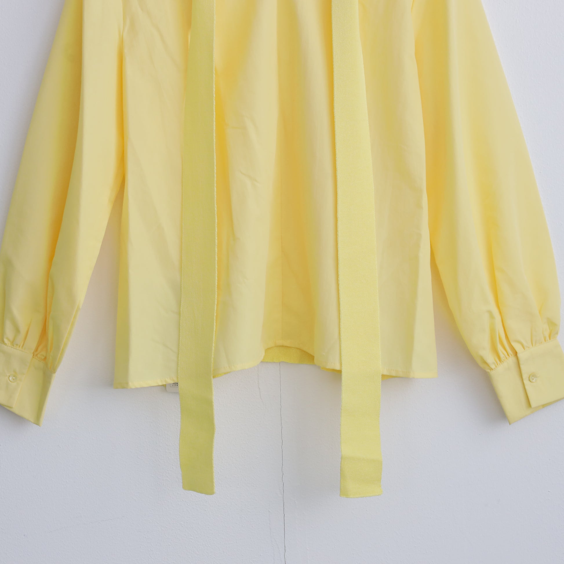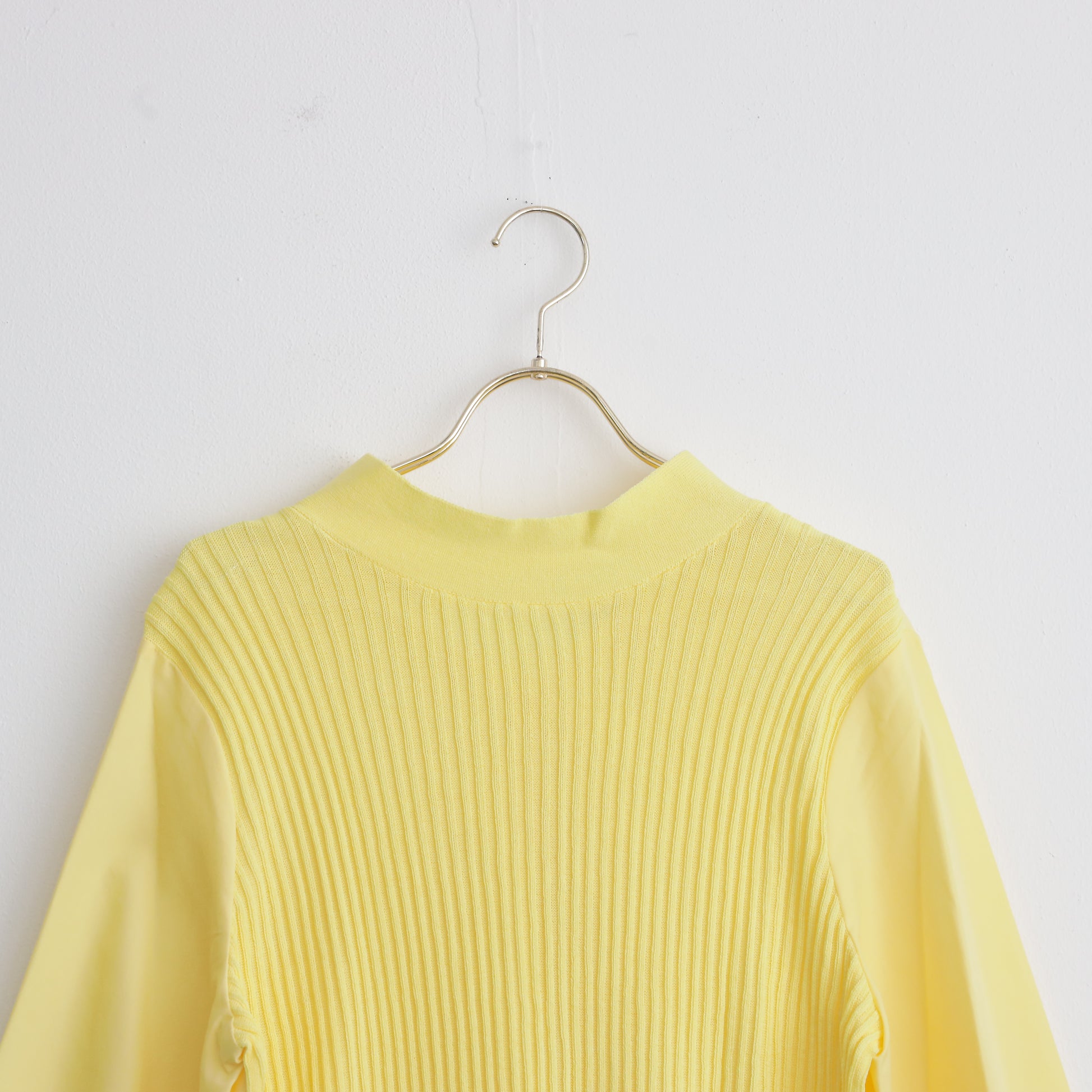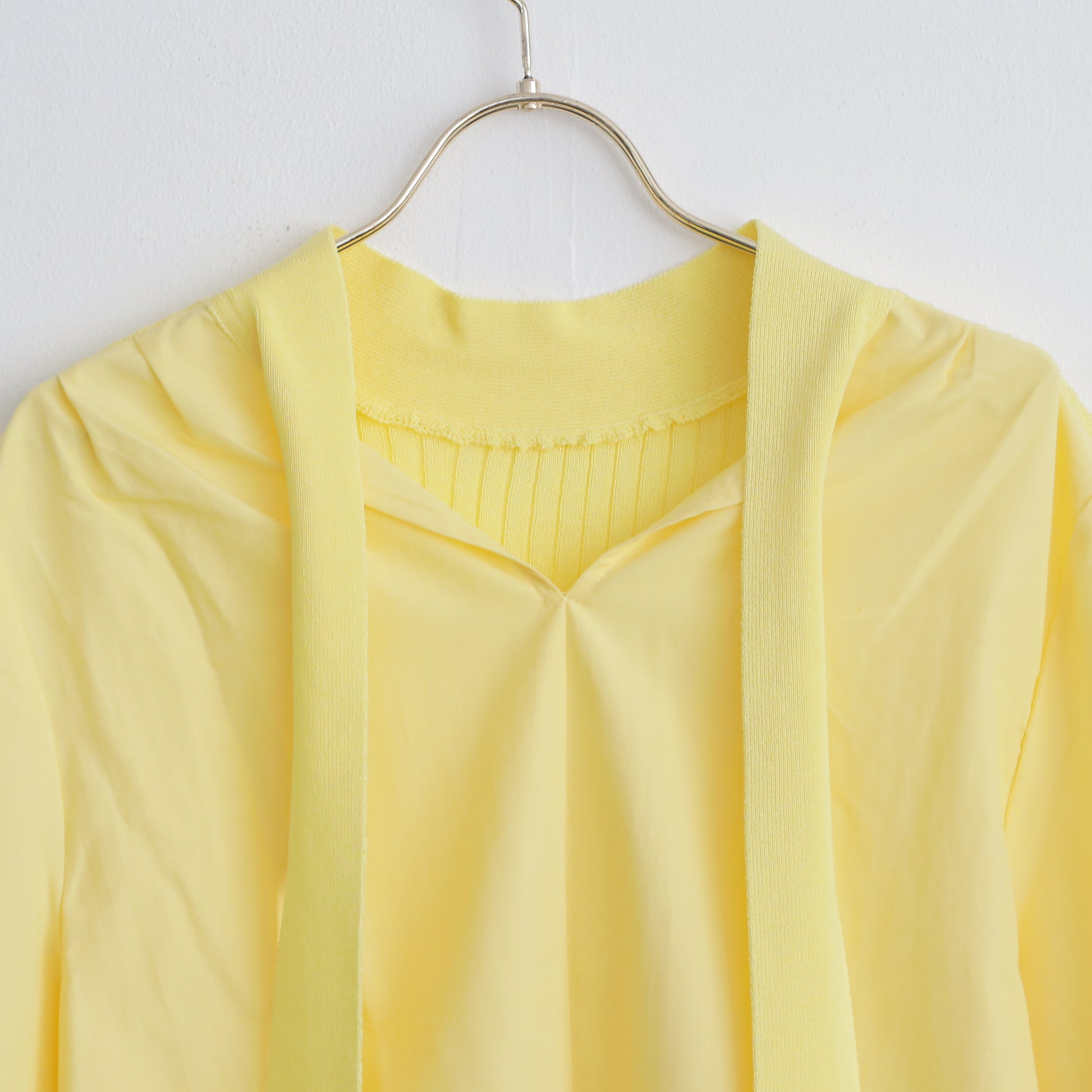 バックリボンデザインのプルオーバー。前身頃はリプニットで背面から袖にかけてはシャツの素材の異素材組み合わせ。後ろ襟元に大きめのリボンがついているので、後ろ姿に華やかさを演出してくれます。