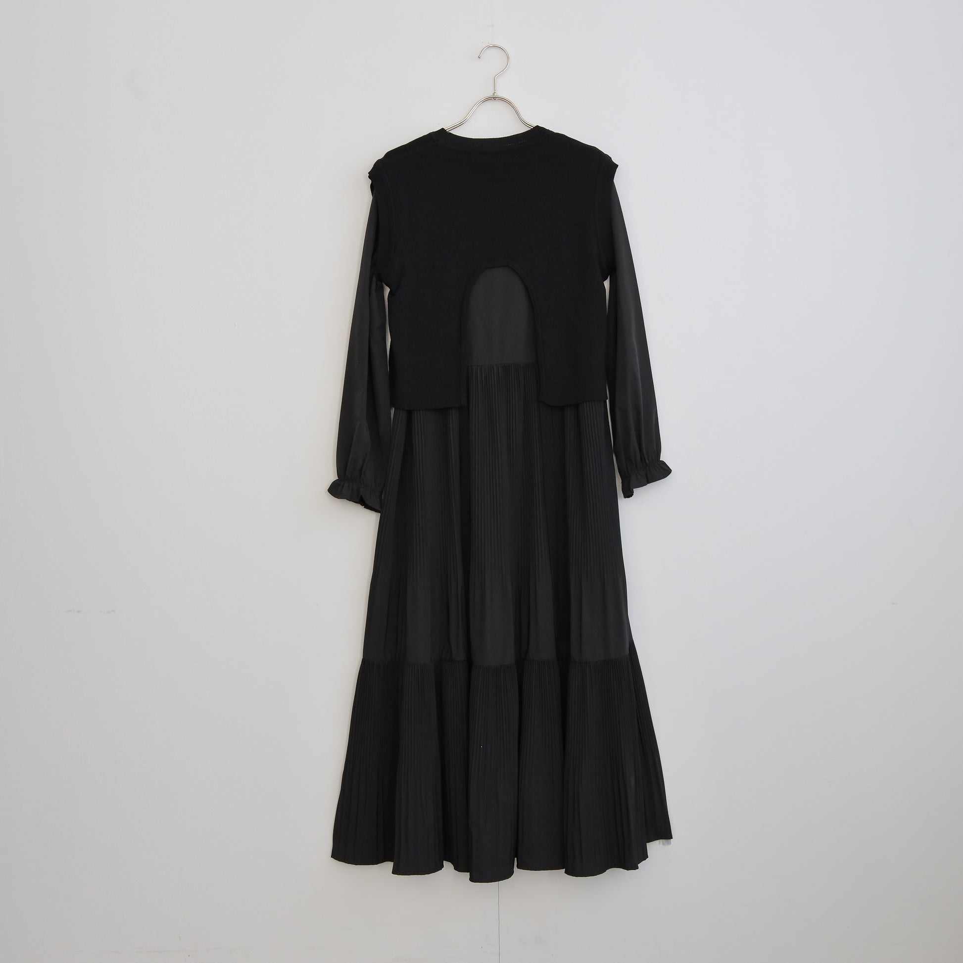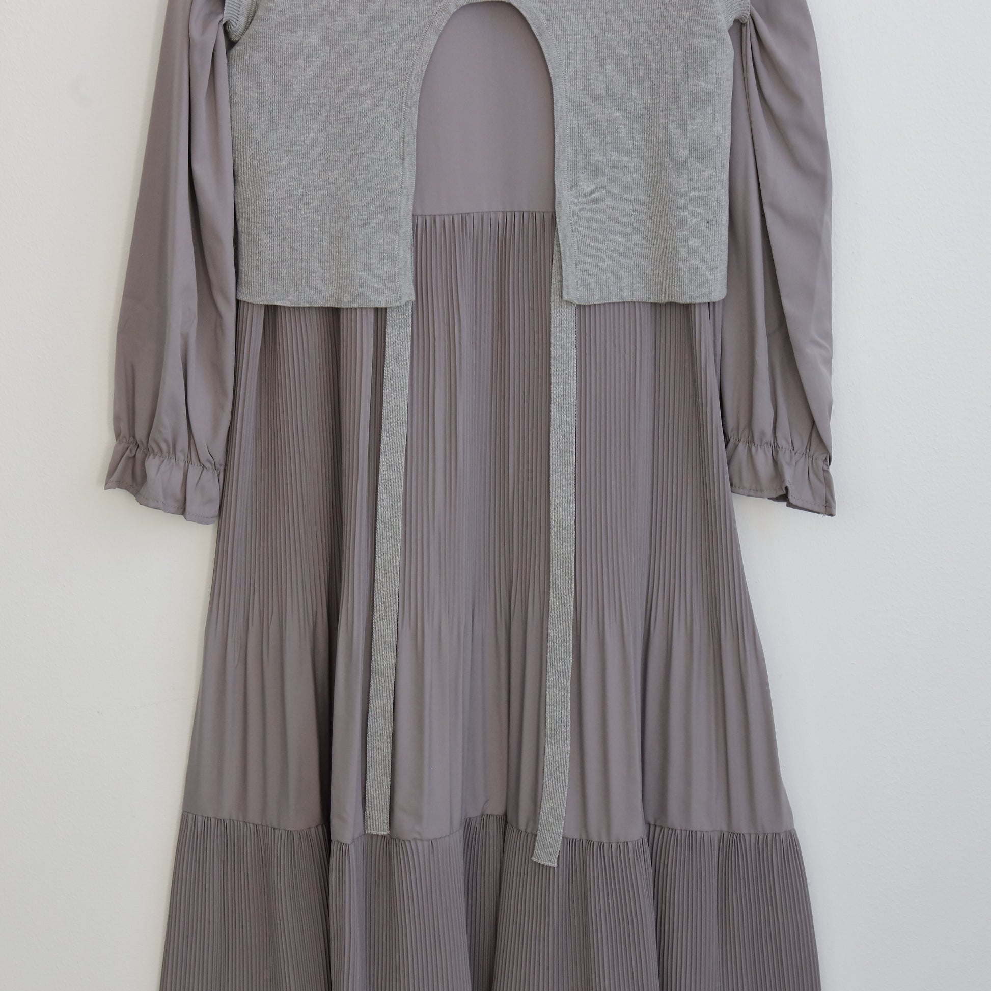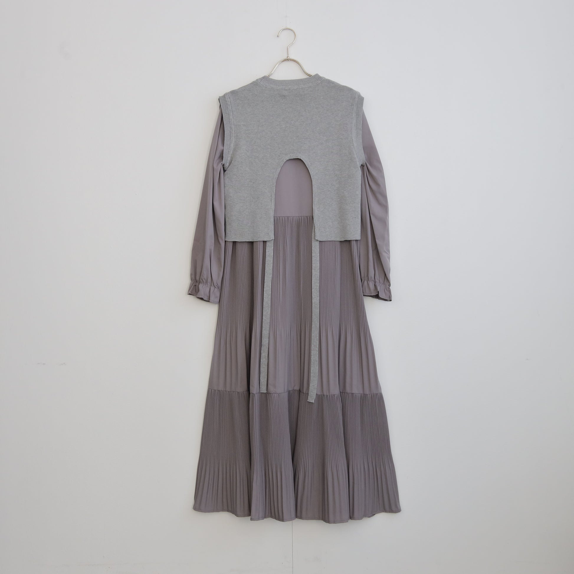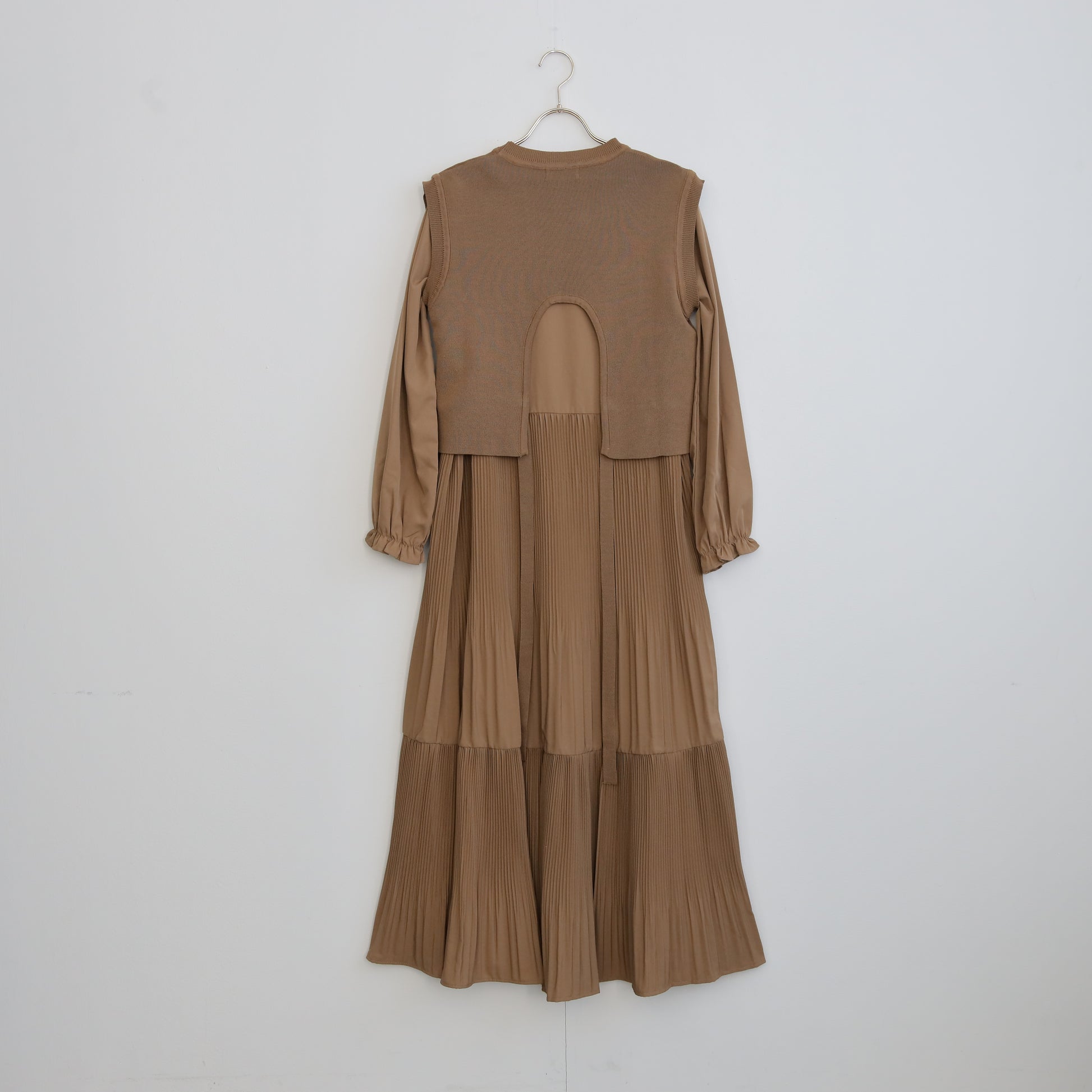 プリーツワンピースに背面の変形デザインのほどこされたニットがセットされたワンピース。