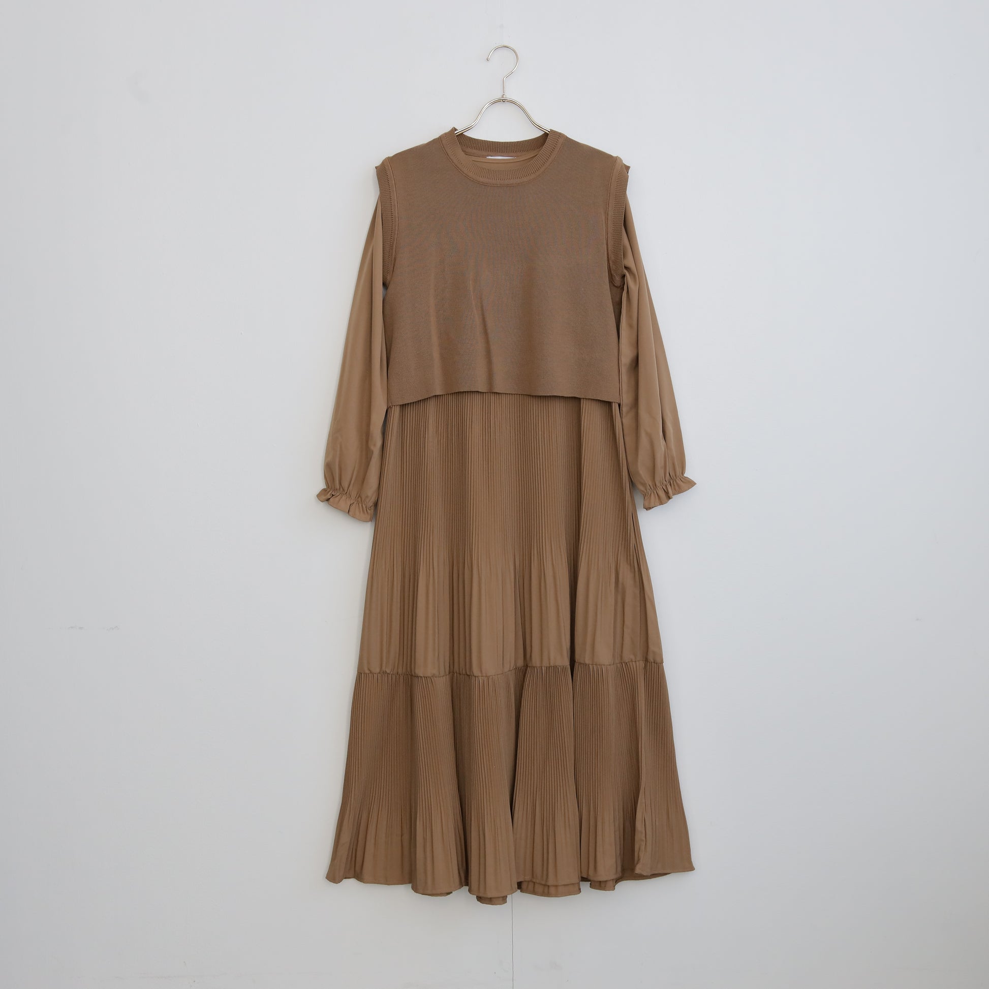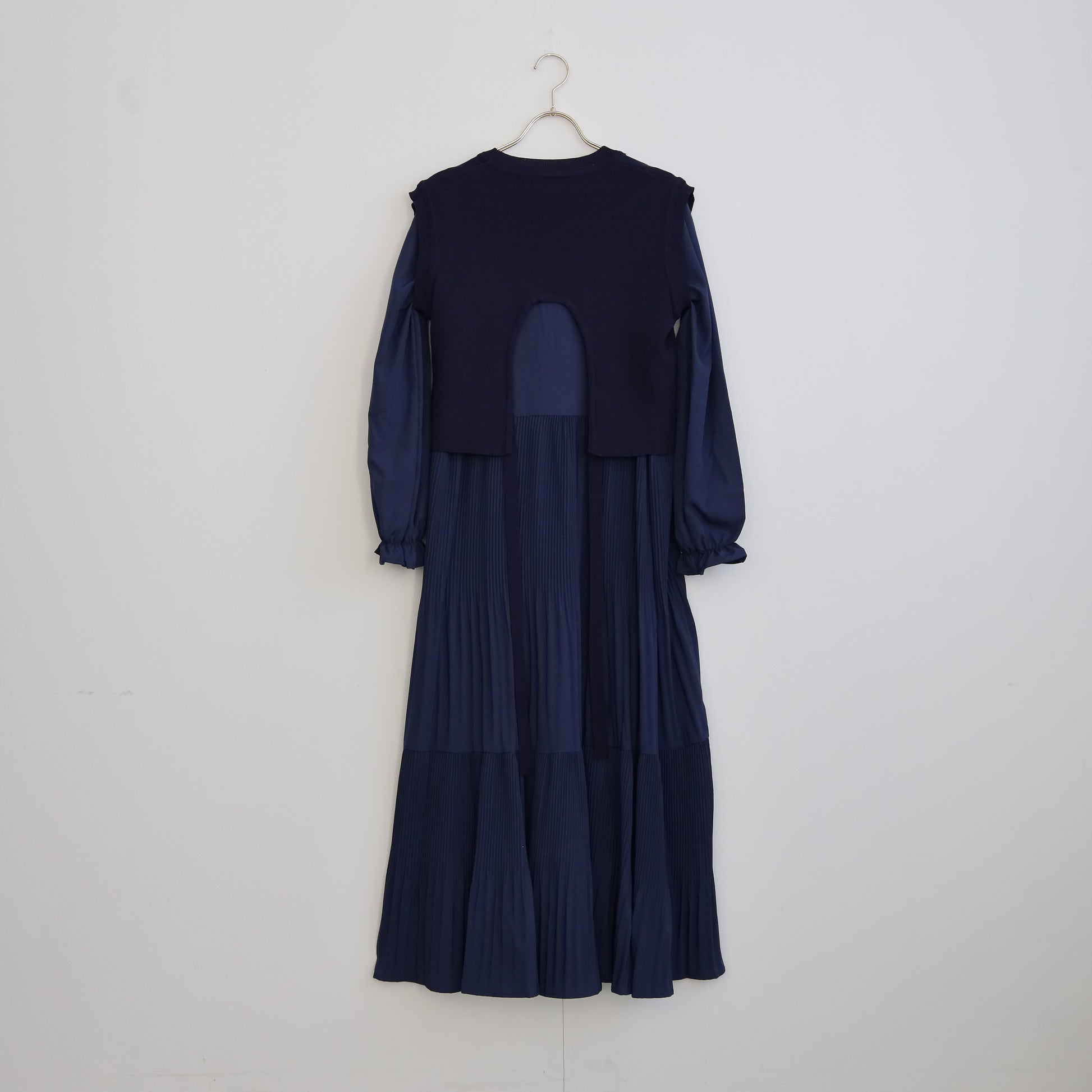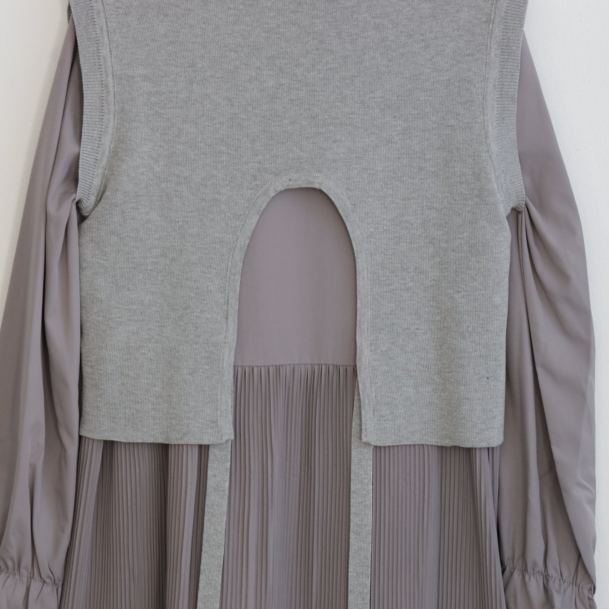 プリーツワンピースに背面の変形デザインのほどこされたニットがセットされたワンピース。