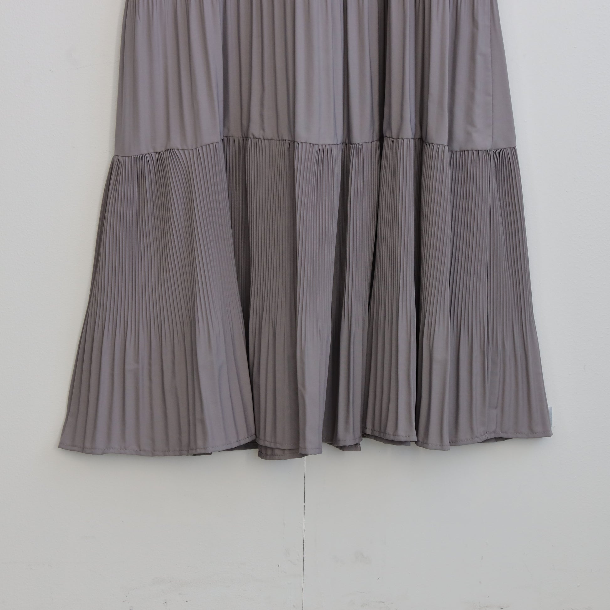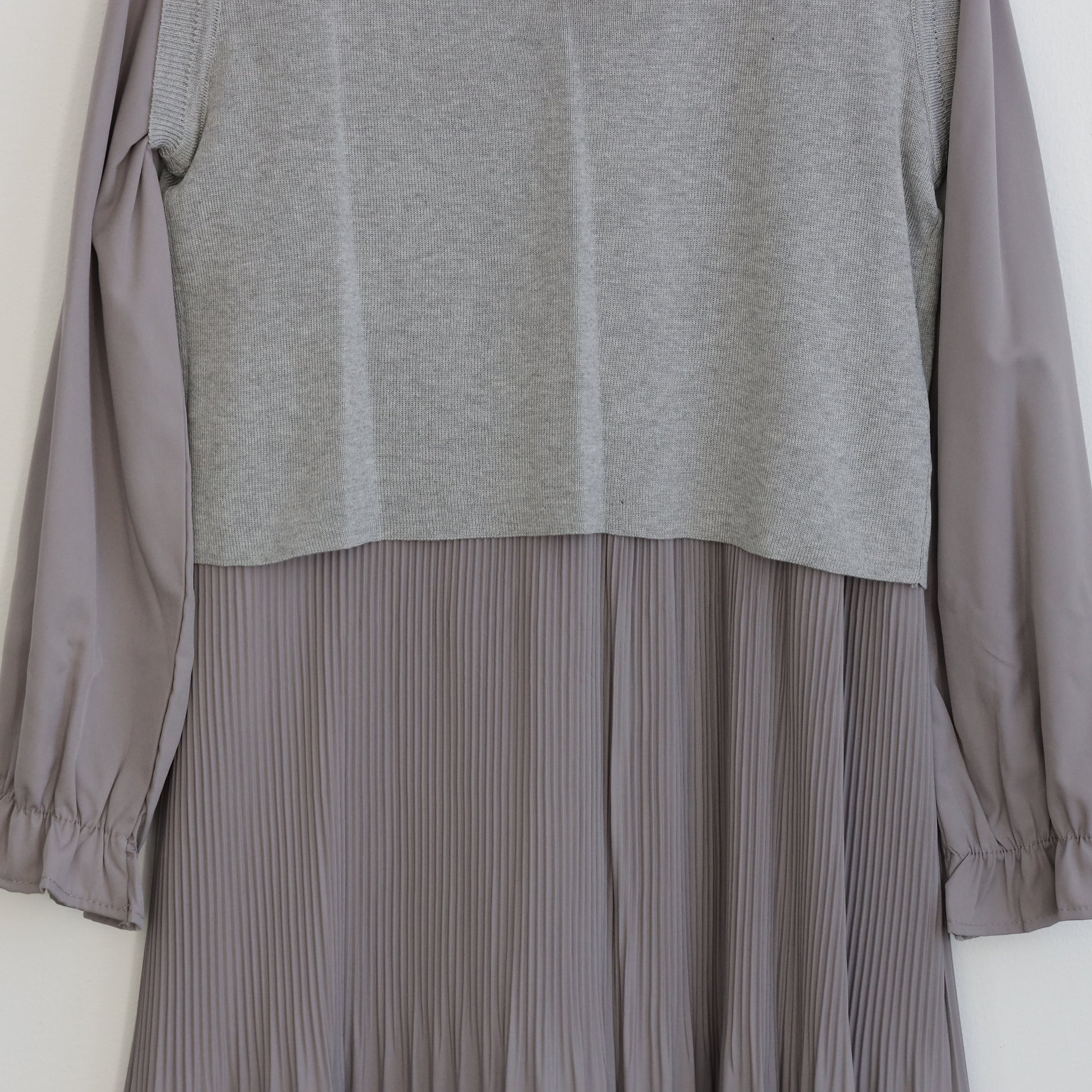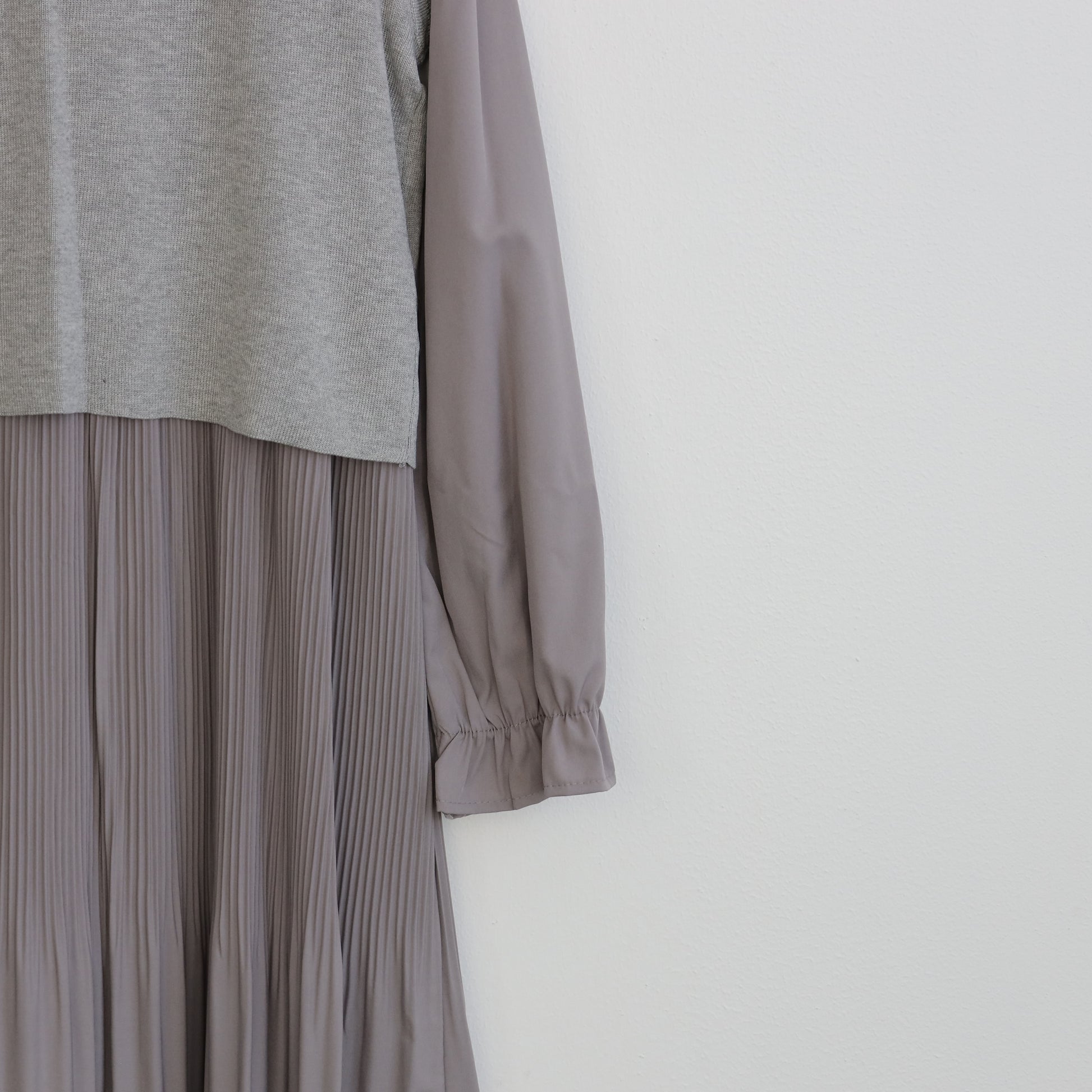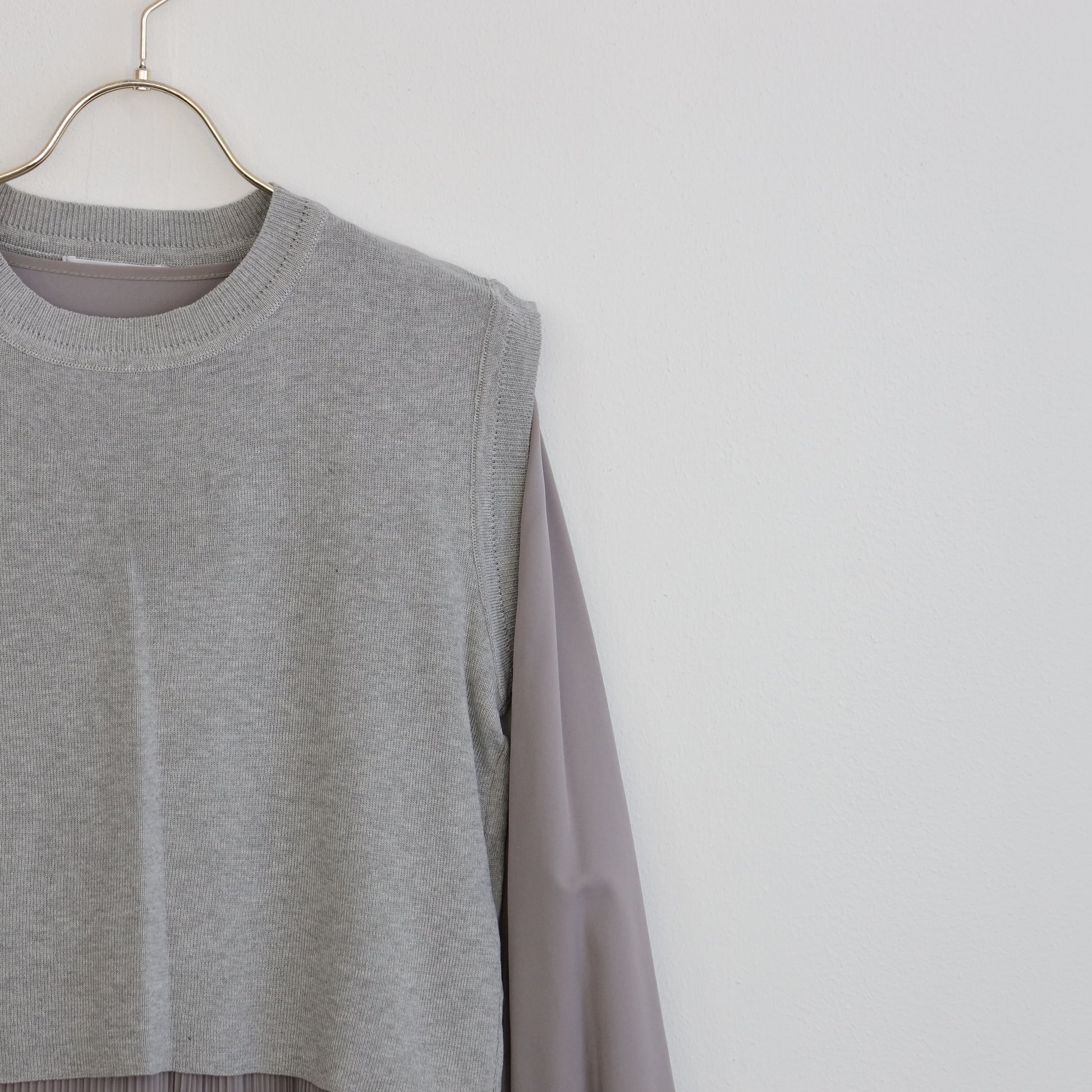 プリーツワンピースに背面の変形デザインのほどこされたニットがセットされたワンピース。