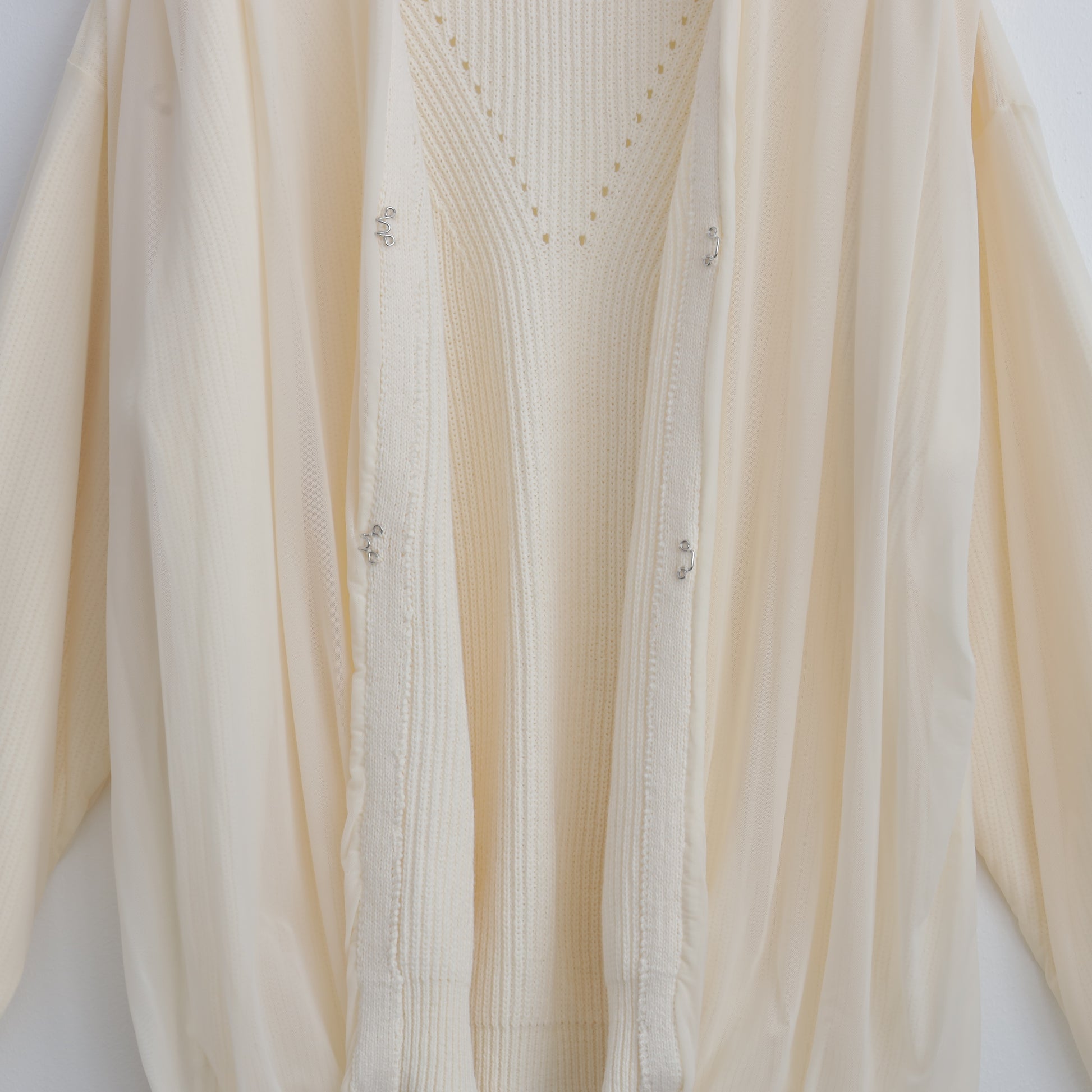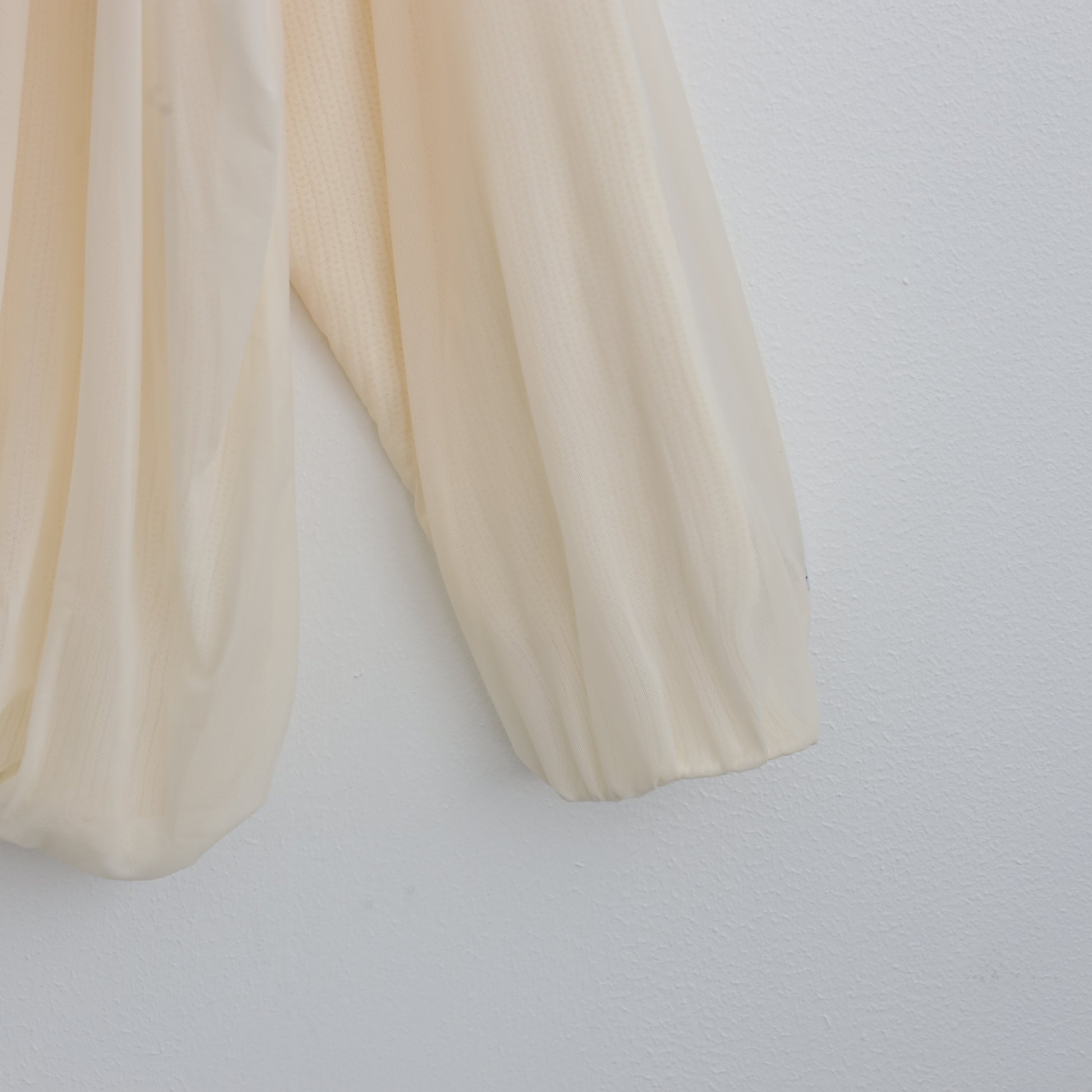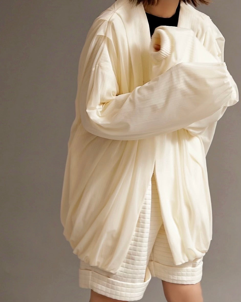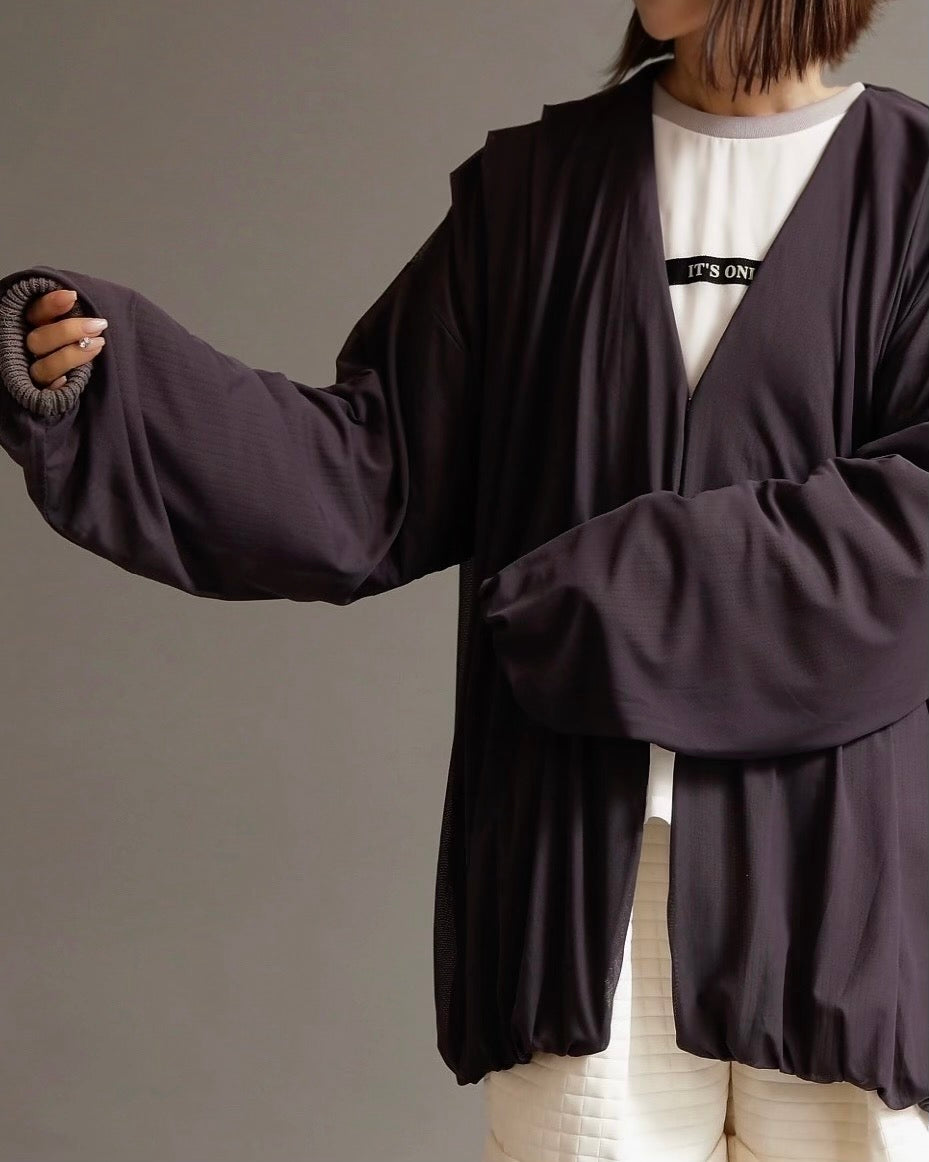 ボリュームスリーブと程よいドレープが生む抜け感が、