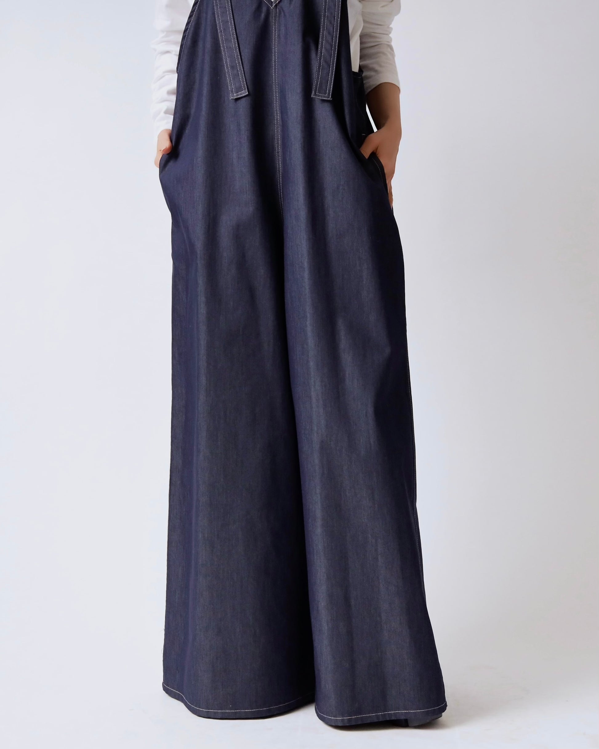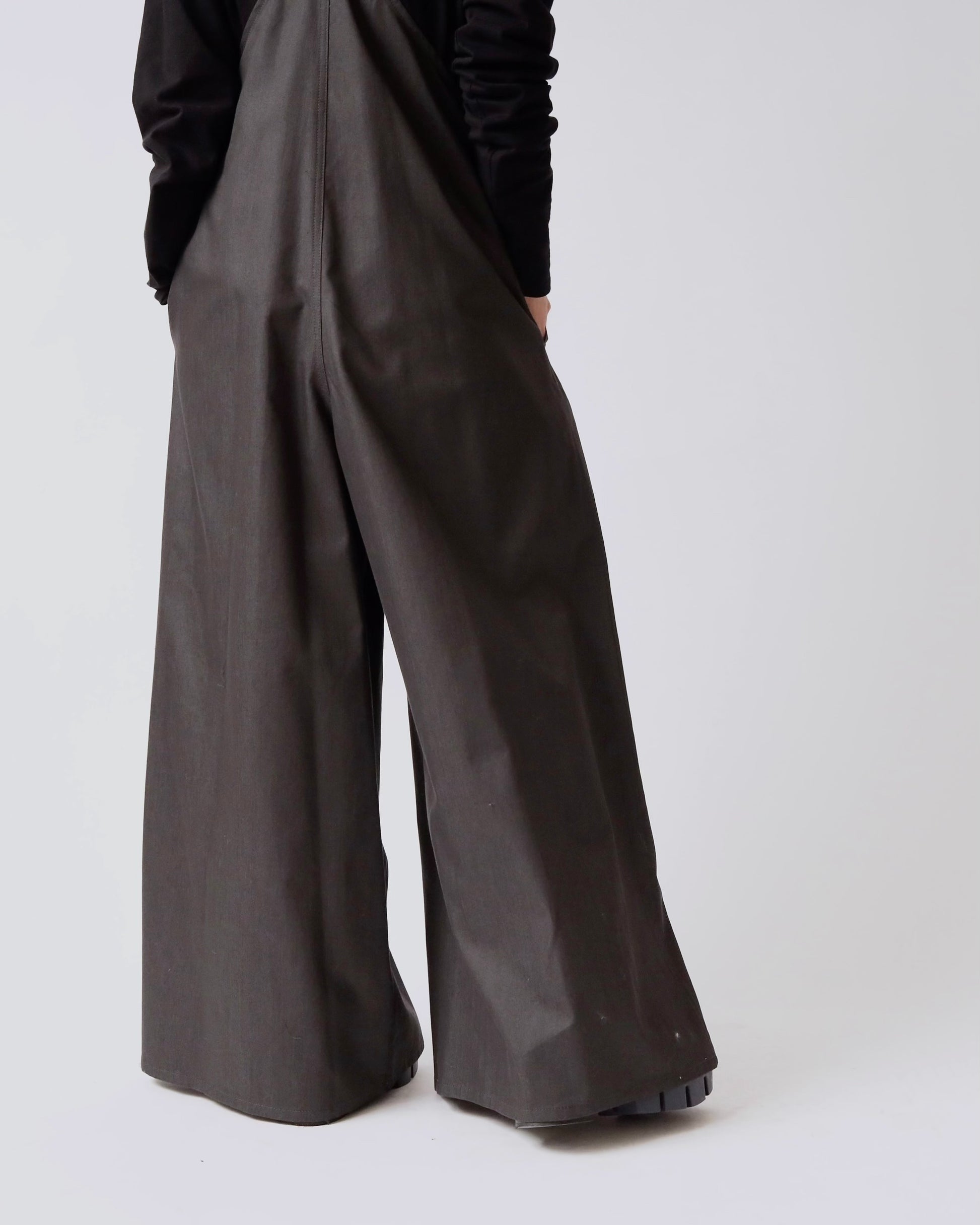 ワイドシルエットながら、縦のラインを強調するデザインで、すっきりとした印象に仕上げています。