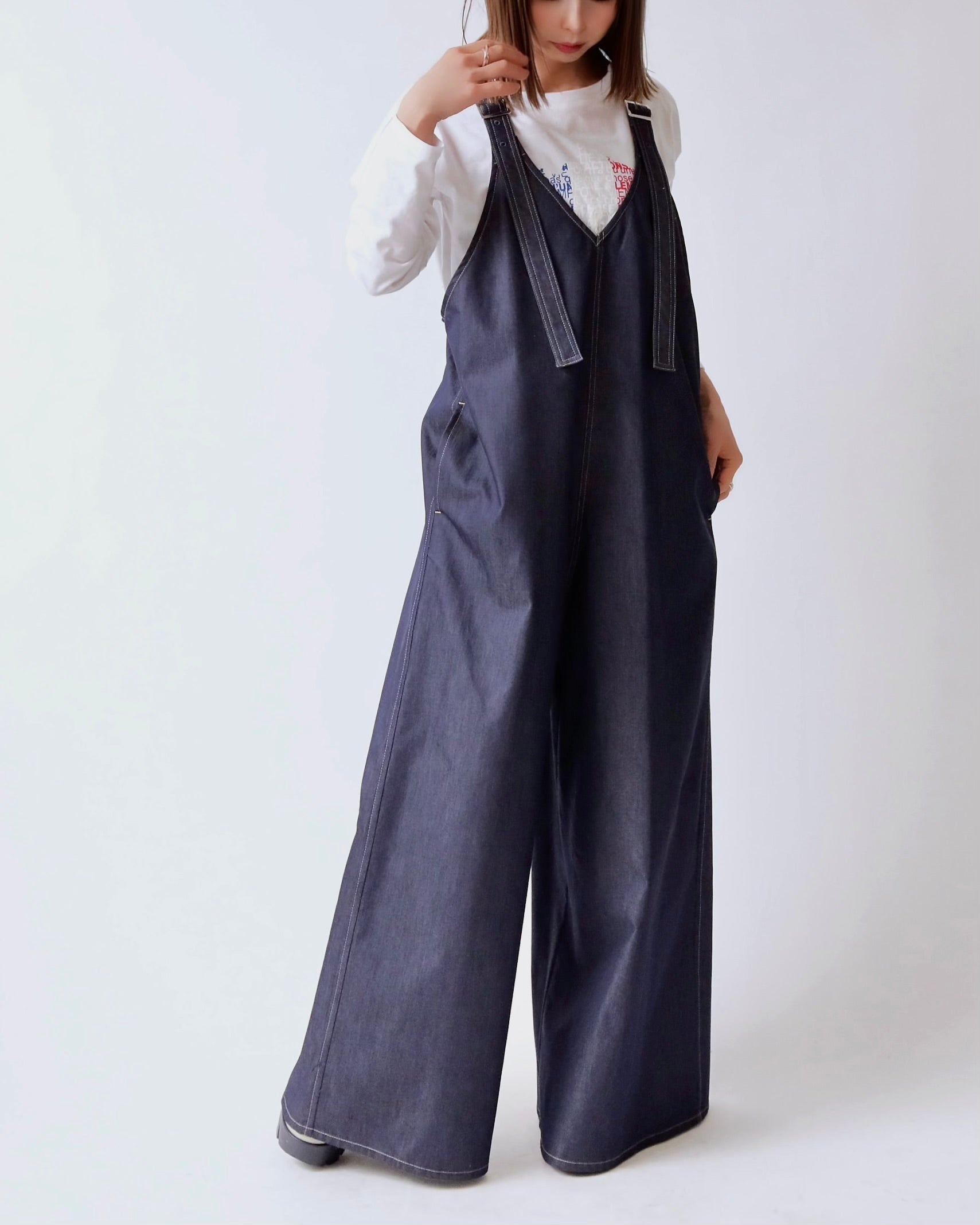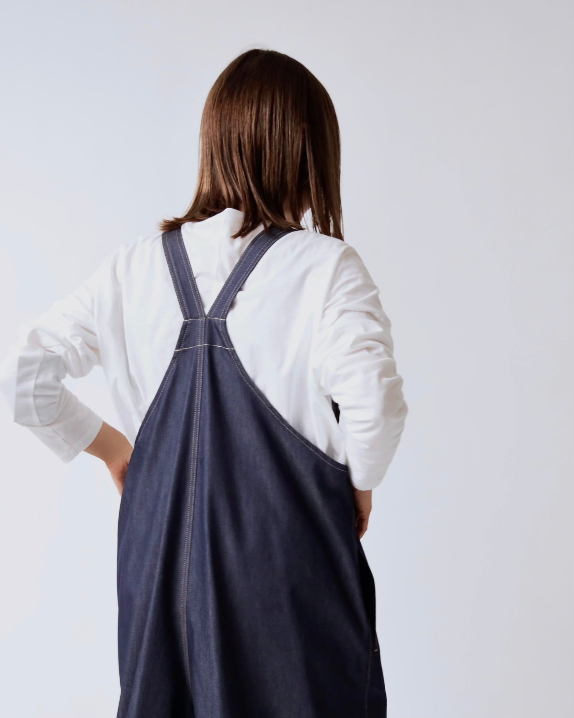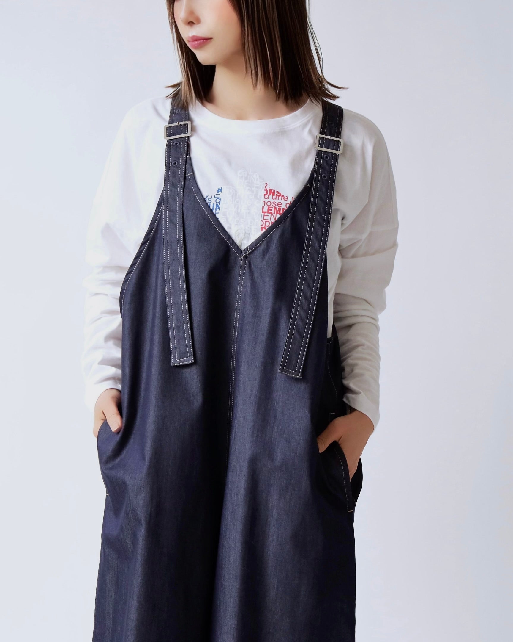 深めに入ったVネックが、サロペット特有のカジュアルさを程よく引き締めてくれる一着。