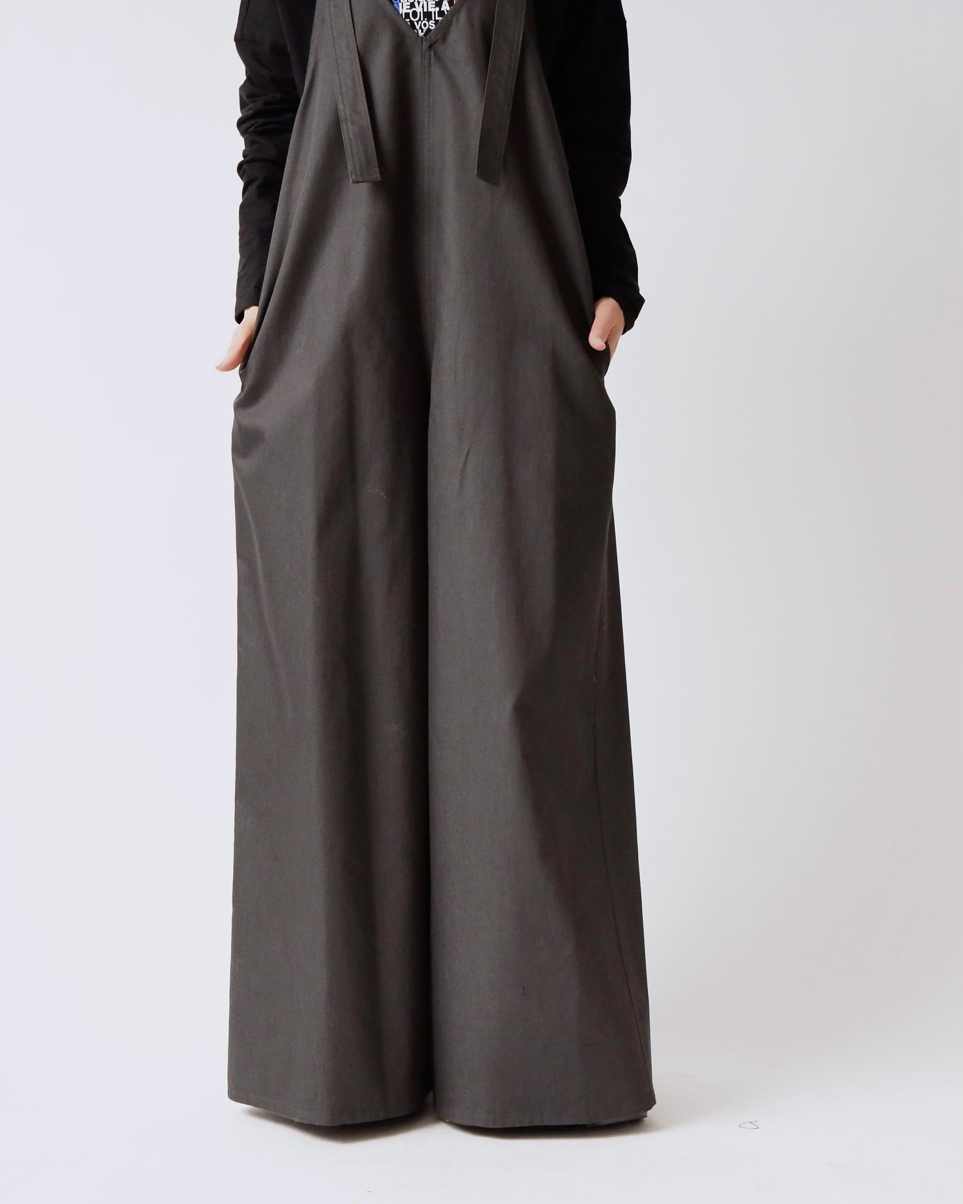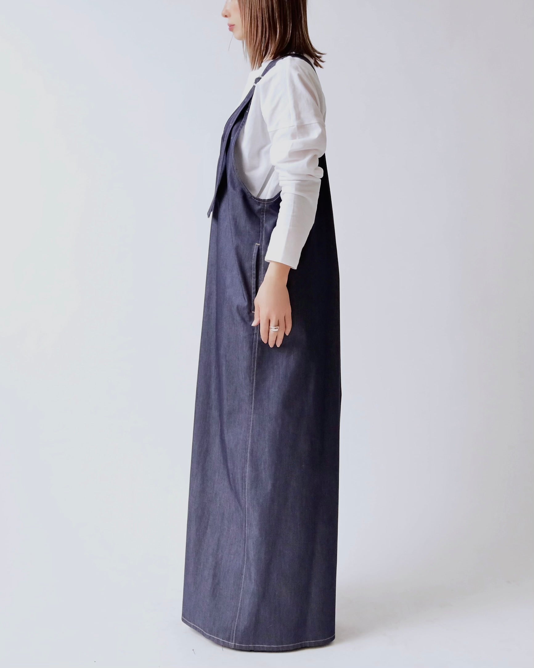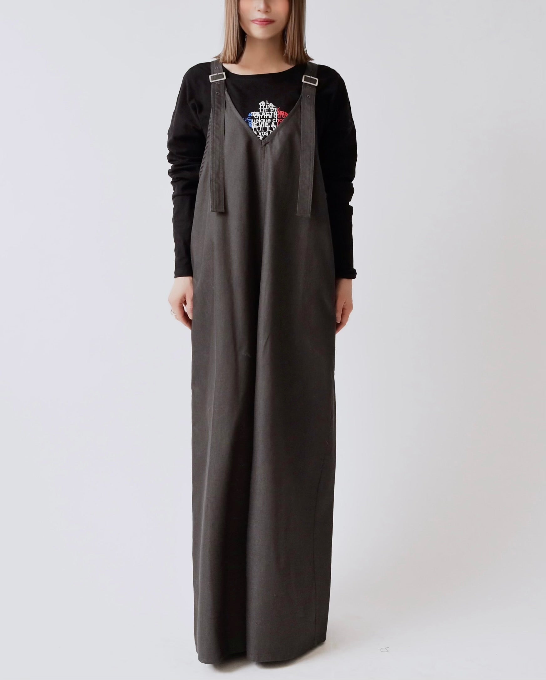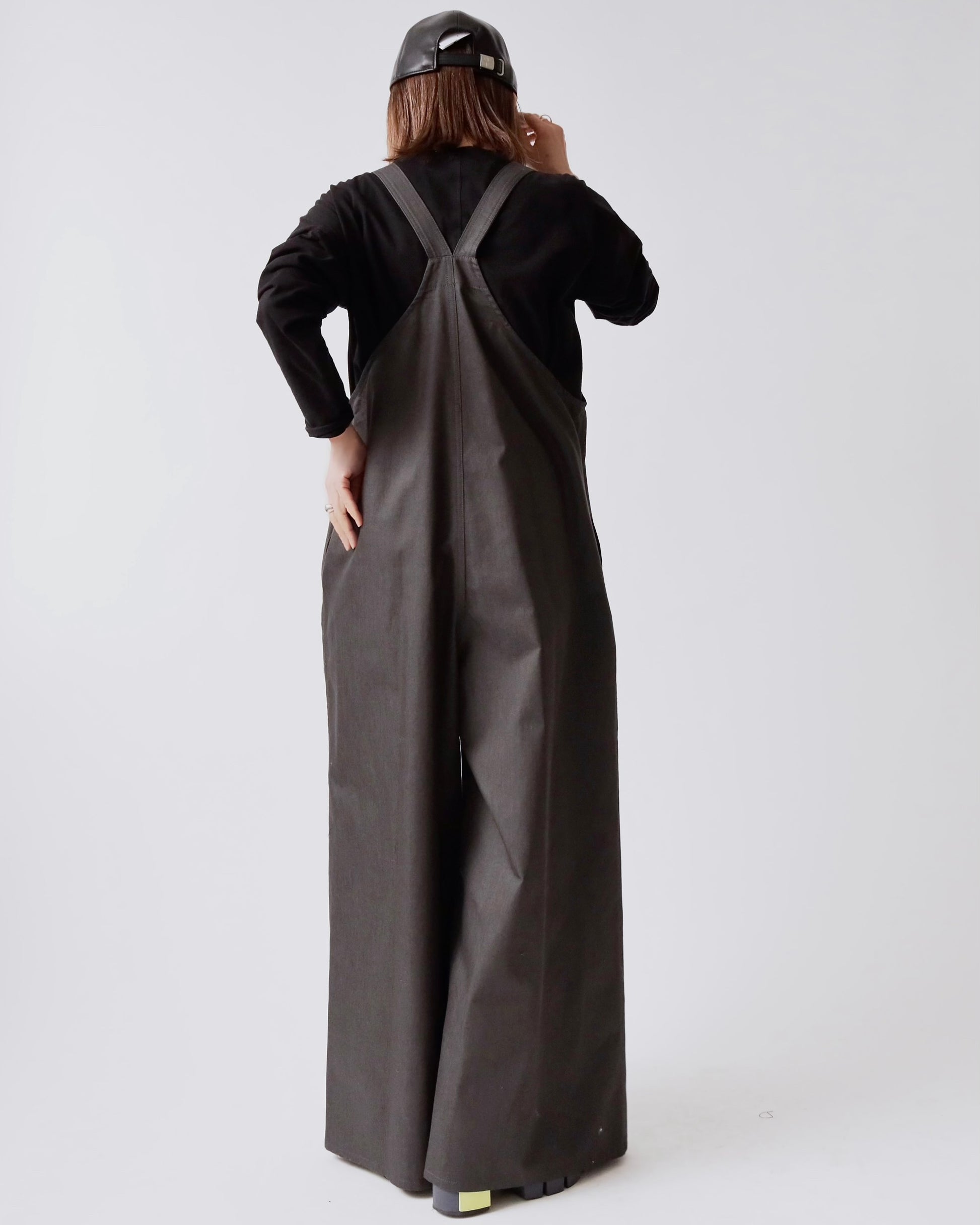 深めに入ったVネックが、サロペット特有のカジュアルさを程よく引き締めてくれる一着。